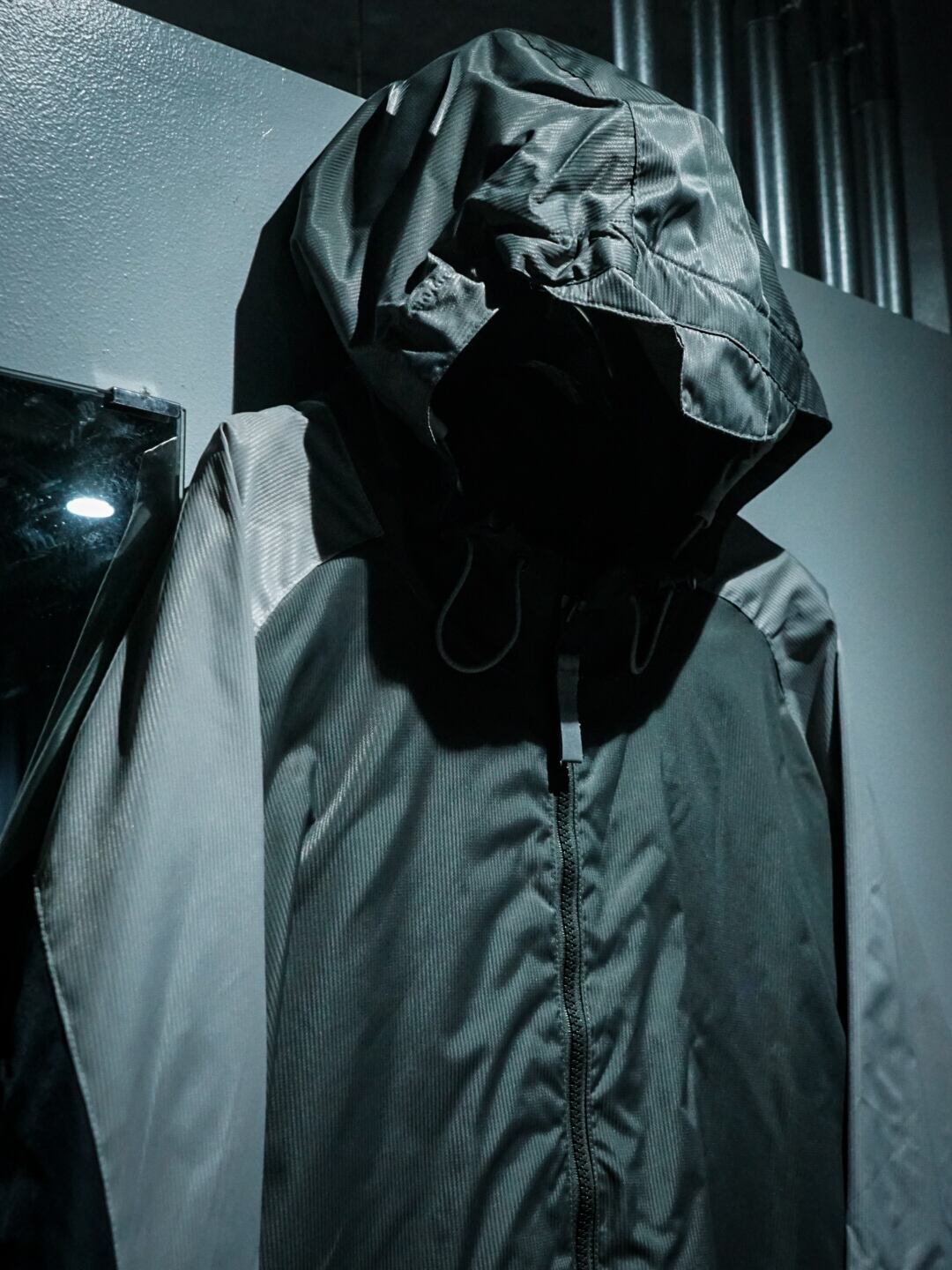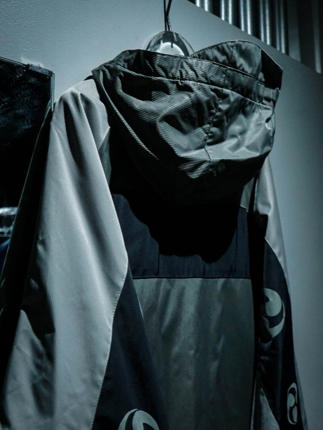 グレーをベースとした光沢を帯びたハリのあるナイロン生地をボディに用い、アームに三つ巴の紋様を載せたフード付きのナイロンジャケット。