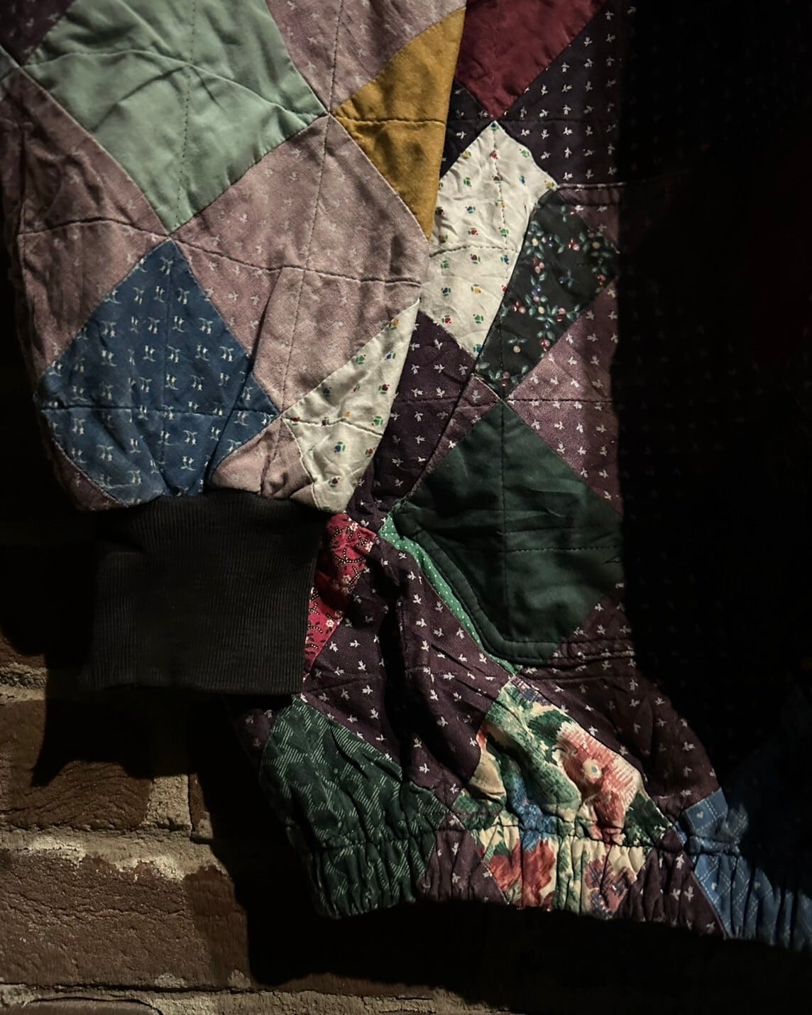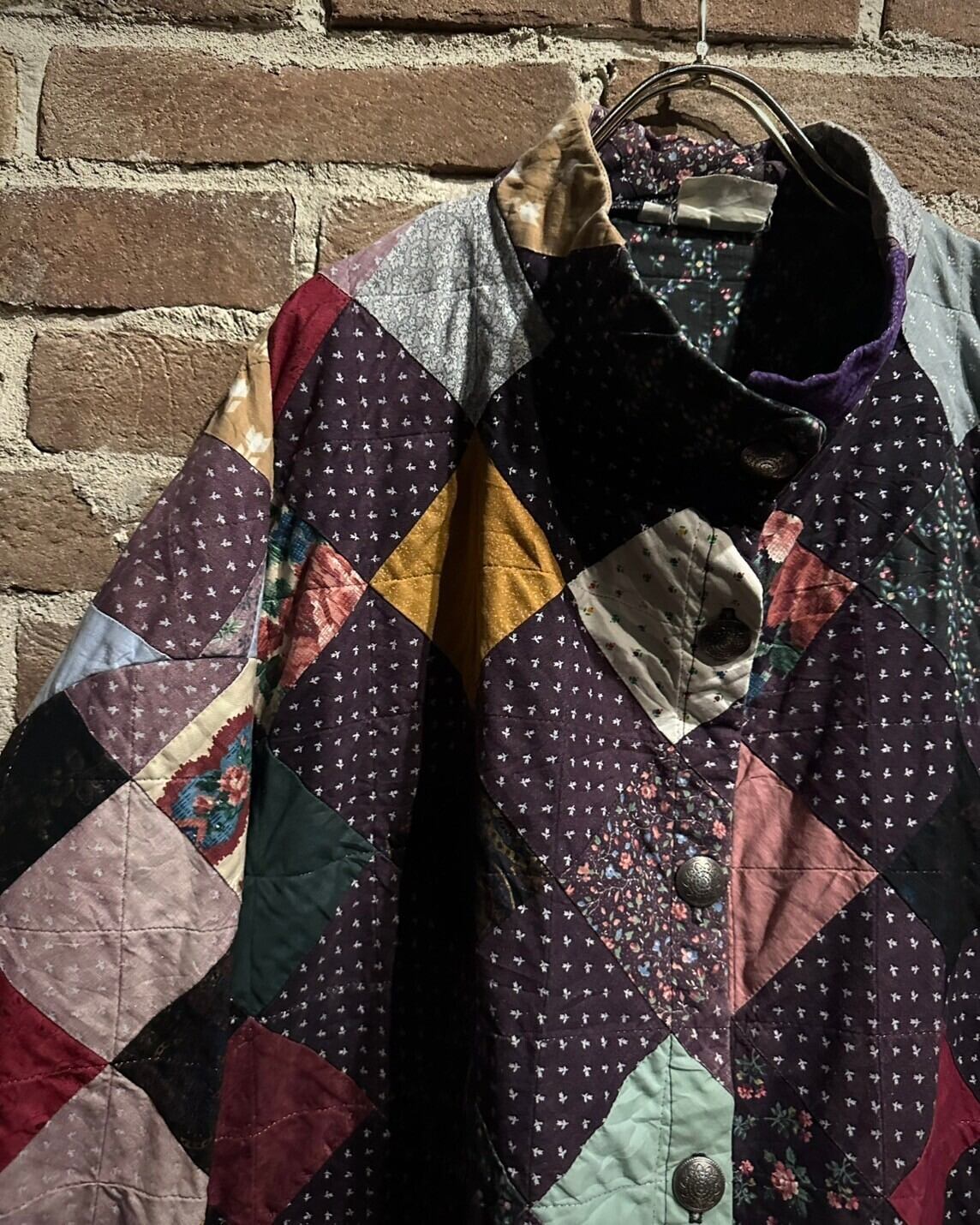 柔らかく肌触りの良いコットンボディに、様々な花柄をパッチワーク状に切り替えたデザインを載せたジャケット。