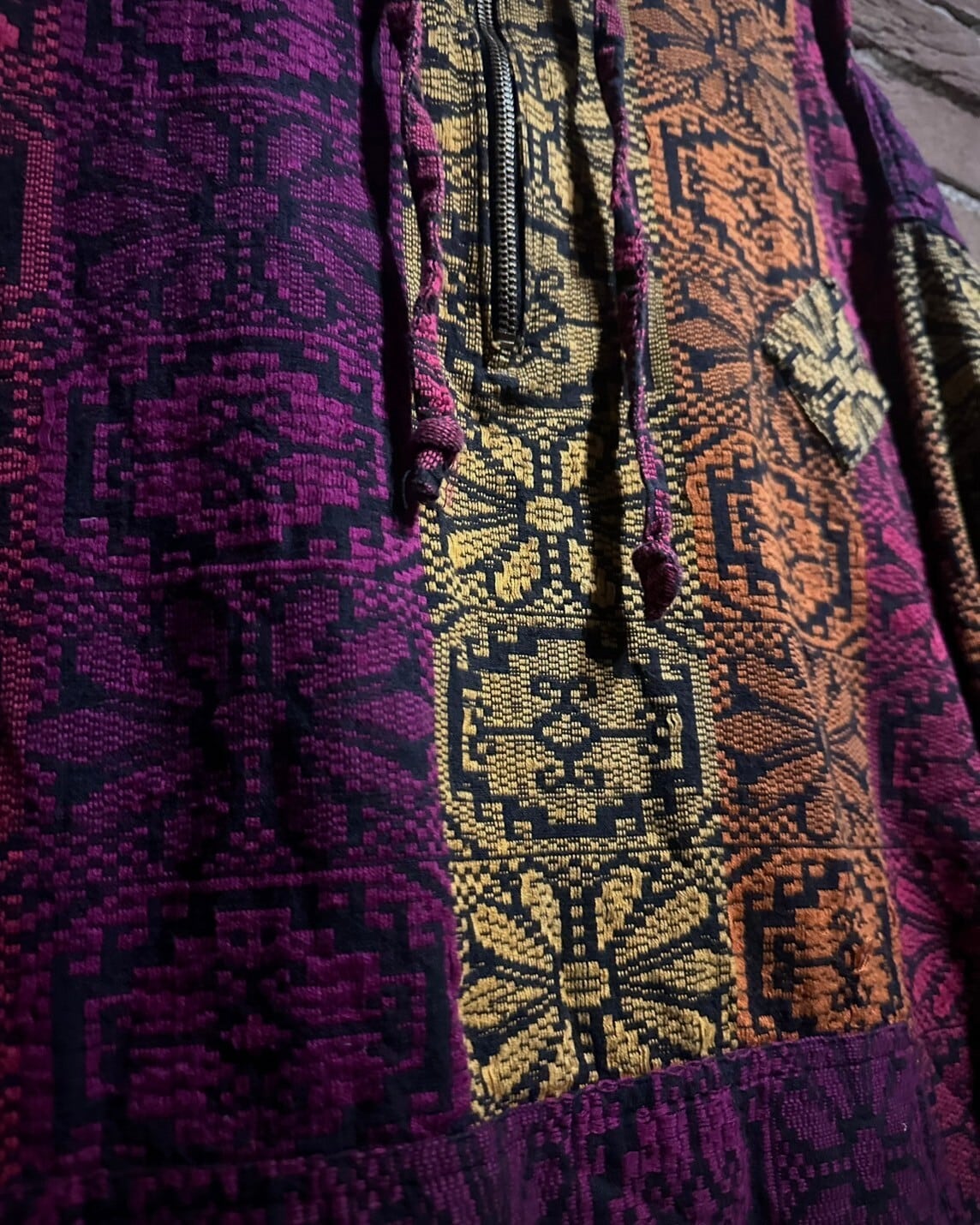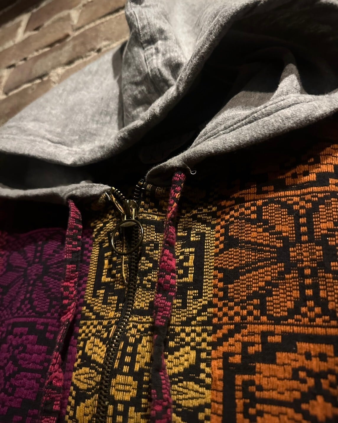 ガシッとハリのある上質な織りで花柄とネイティブ柄を表現したハーフジップ仕様のフーディ。