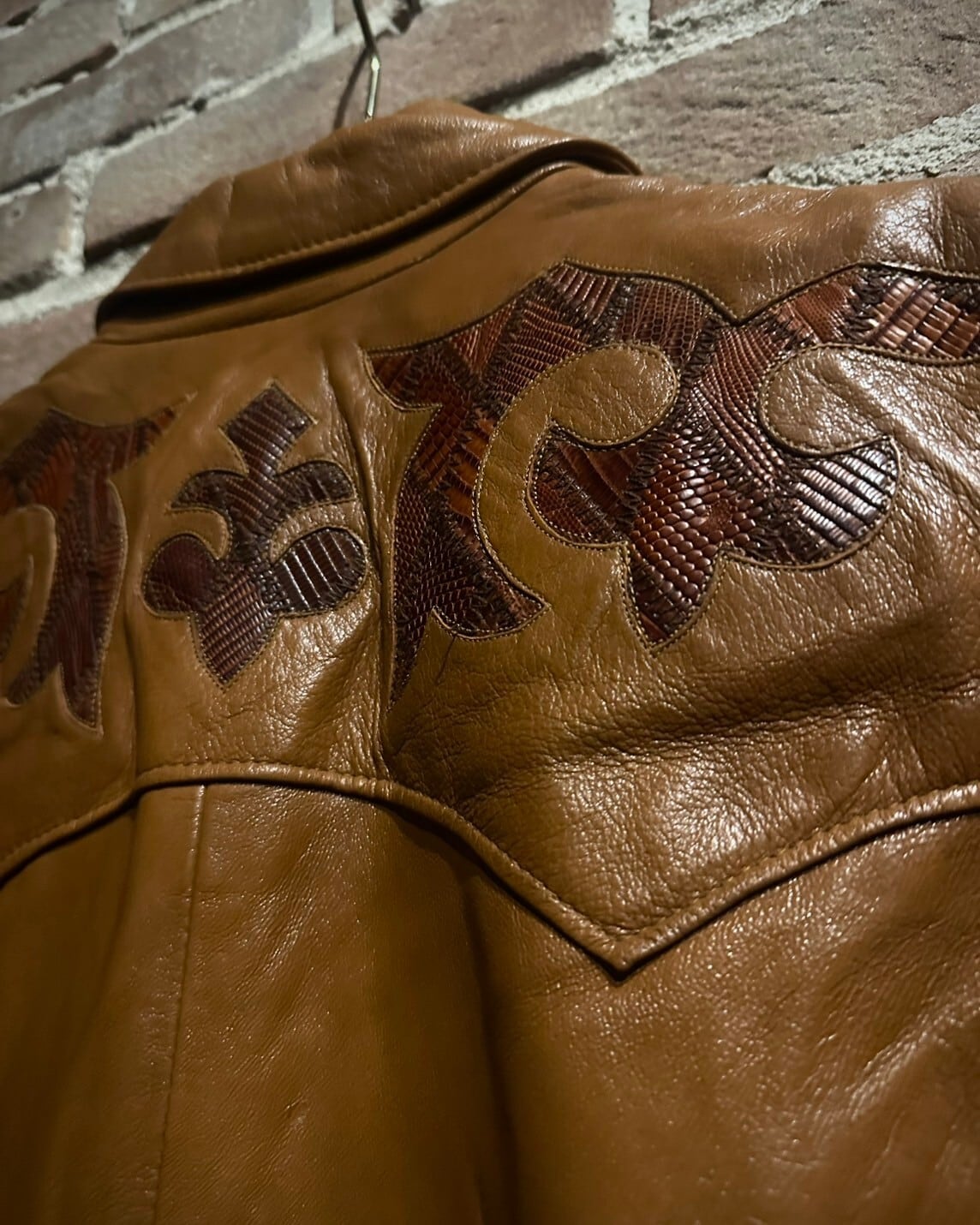 稀有なブラウンウエスタン仕様のテーラードジャケットに、ヨーク部分にはクロムハーツで用いられるようなモチーフ柄をクロコダイル柄によって切り替えた1着。