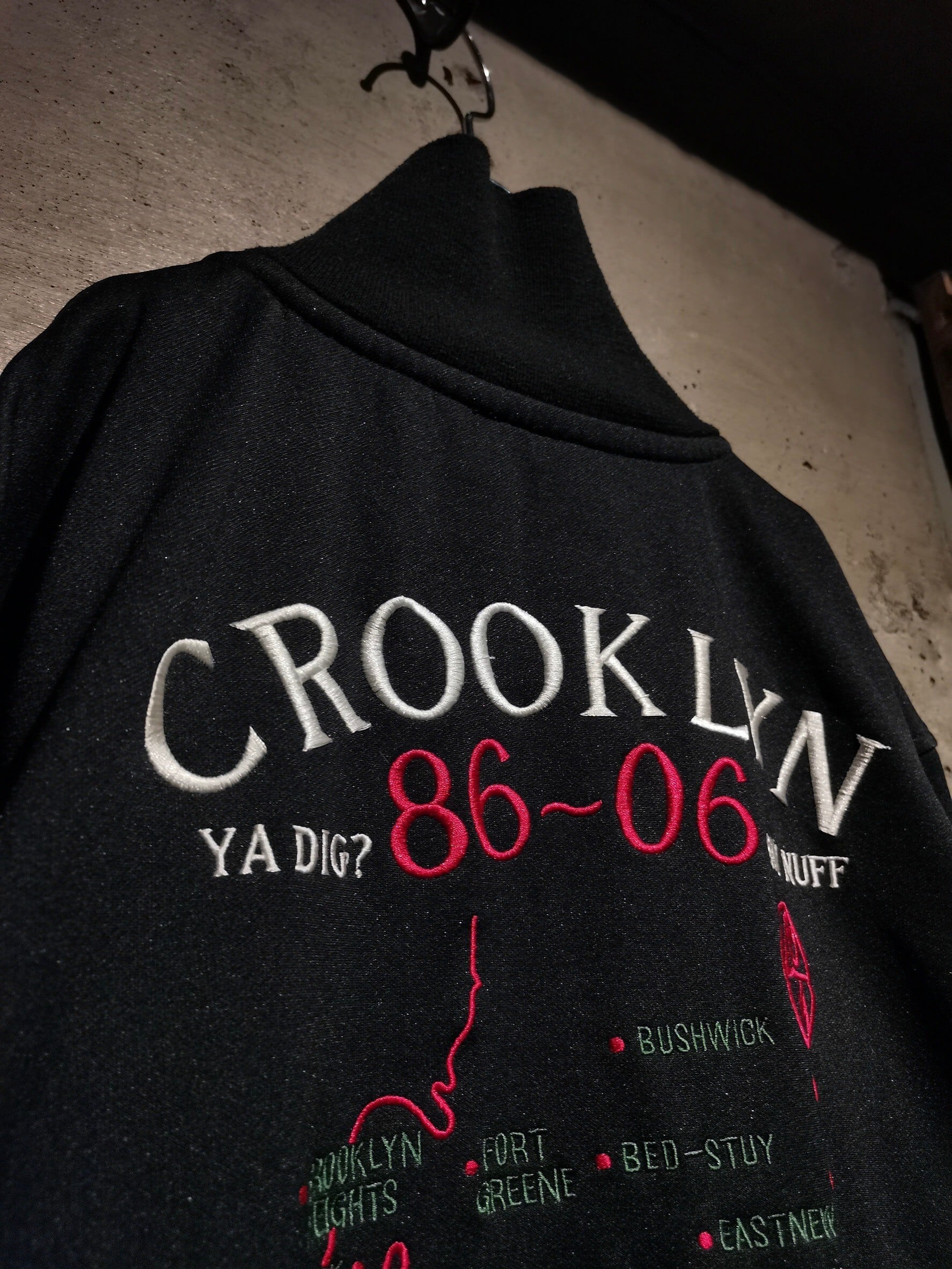 フロントには会社のロゴマーク、シェニールのワッペン、背面にはスパイク・リーのワッペンに、彼が制作したCROOKLYNの文字、会社ロゴ、ブルックリンを型どった刺繍デザインが載ったデザイン性の高い1着。トラックジャケットらしいアームのラインデザインも◎