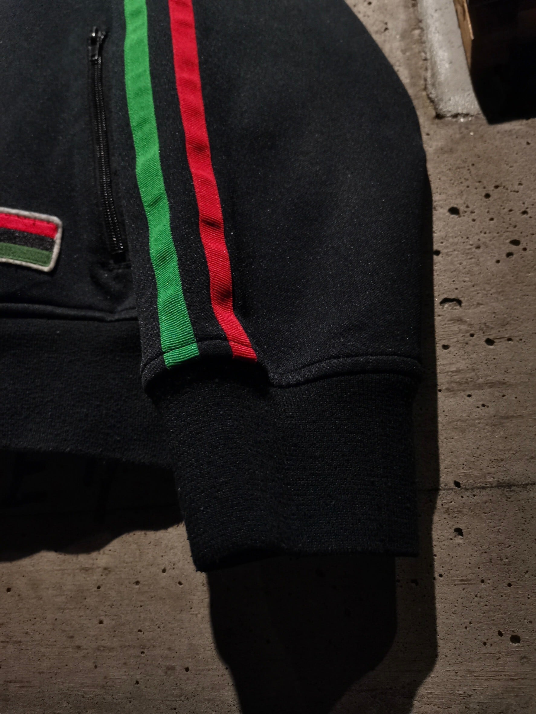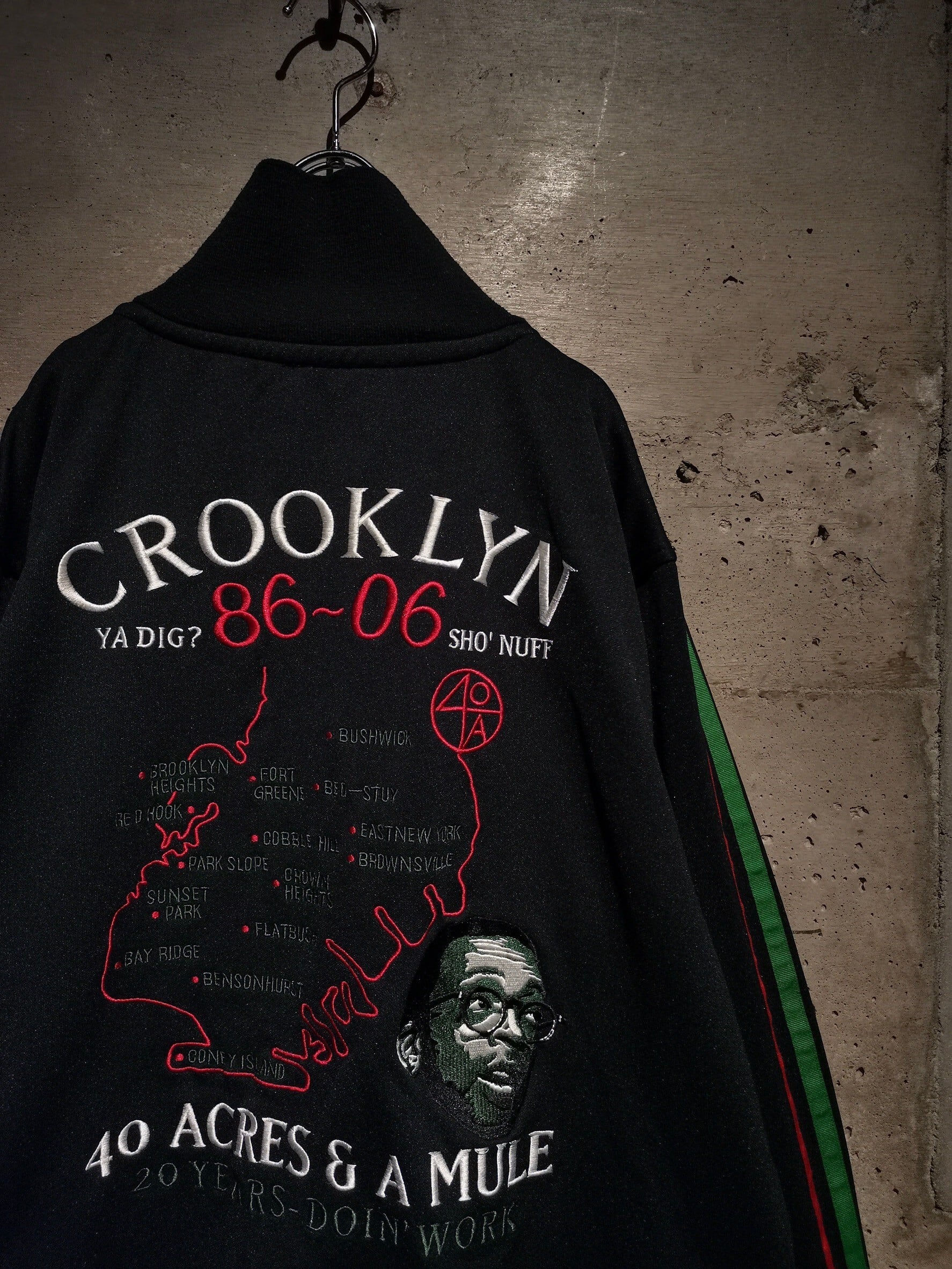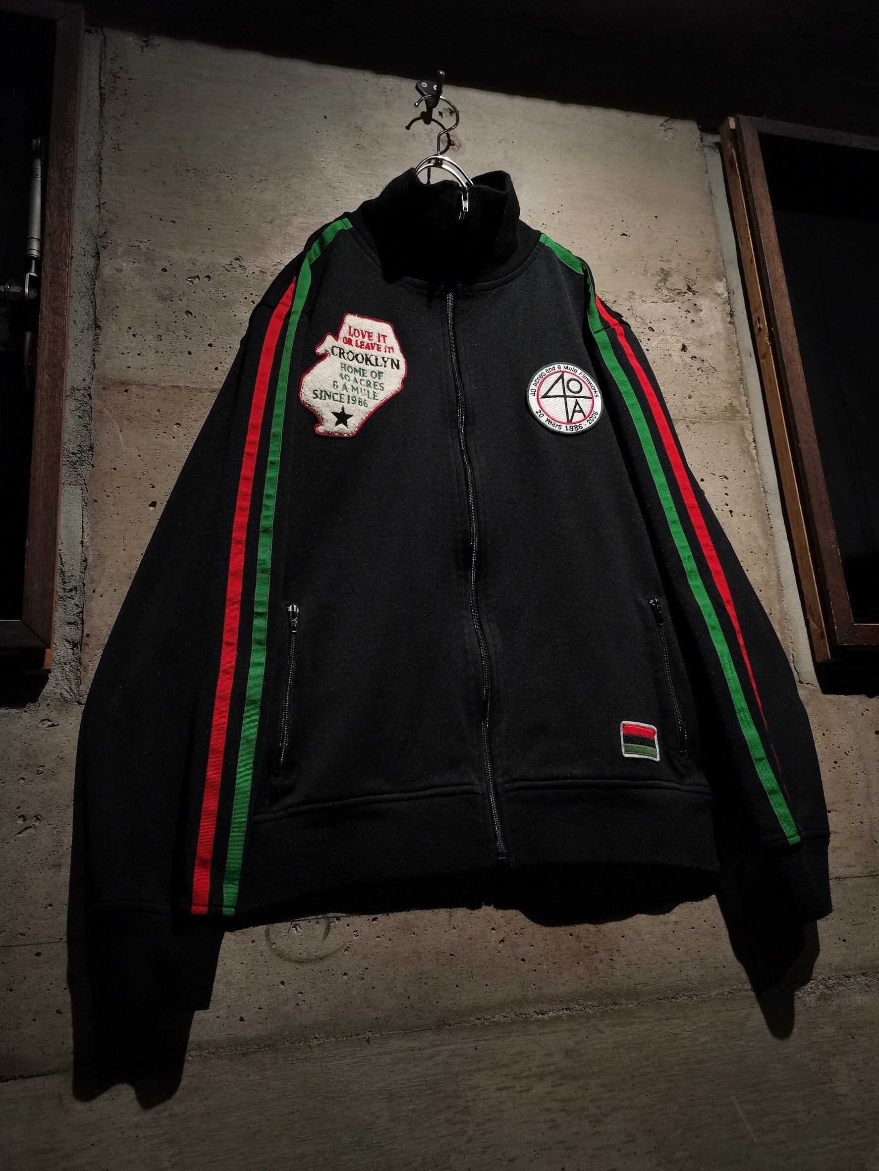 ブラックのジャージボディに、40エーカー・アンド・ア・ミュール・フィルムワークスという、マルコムX等の監督を務めたスパイク・リーが創設した制作会社のデザインが載ったトラックジャケット。