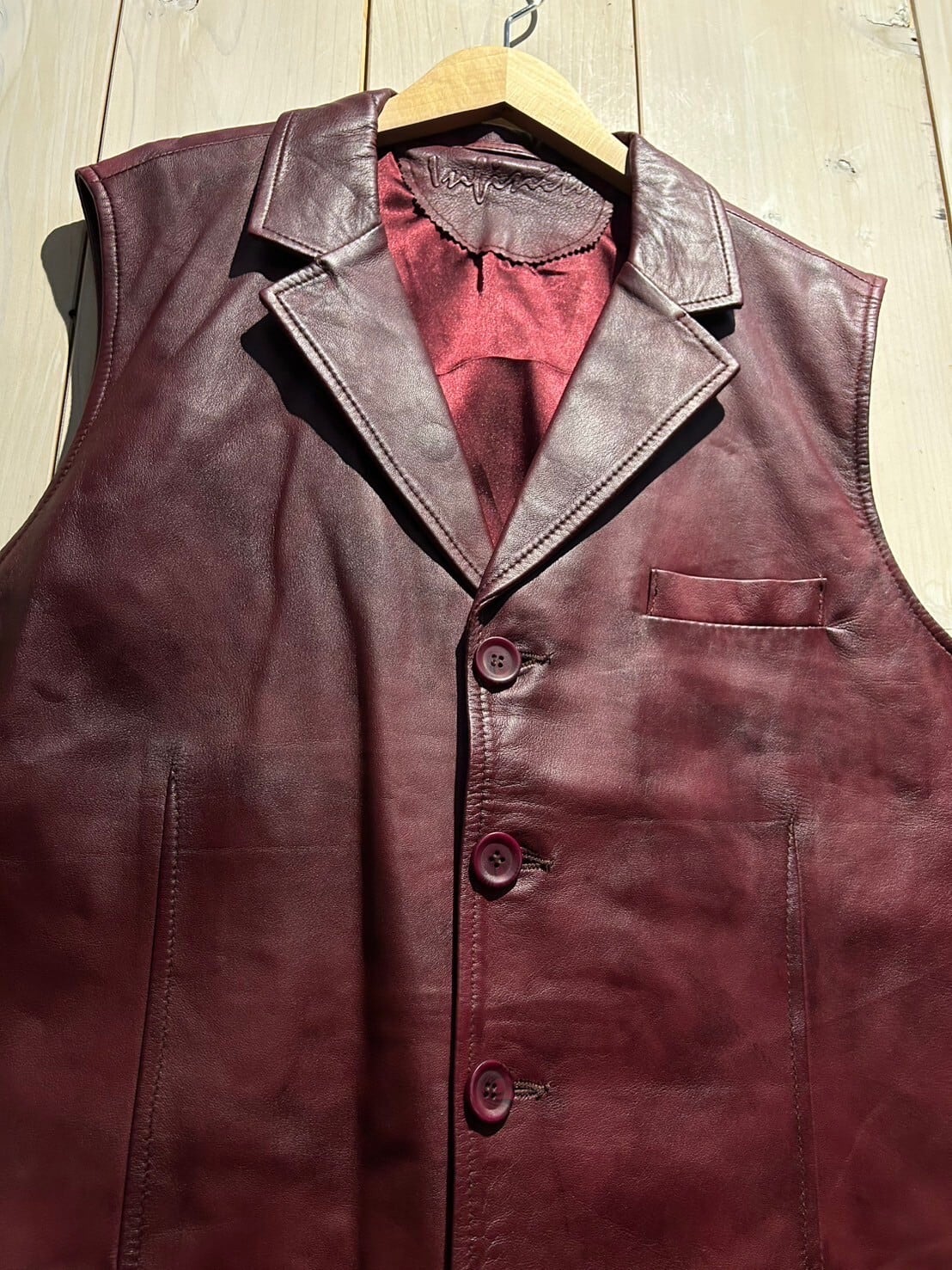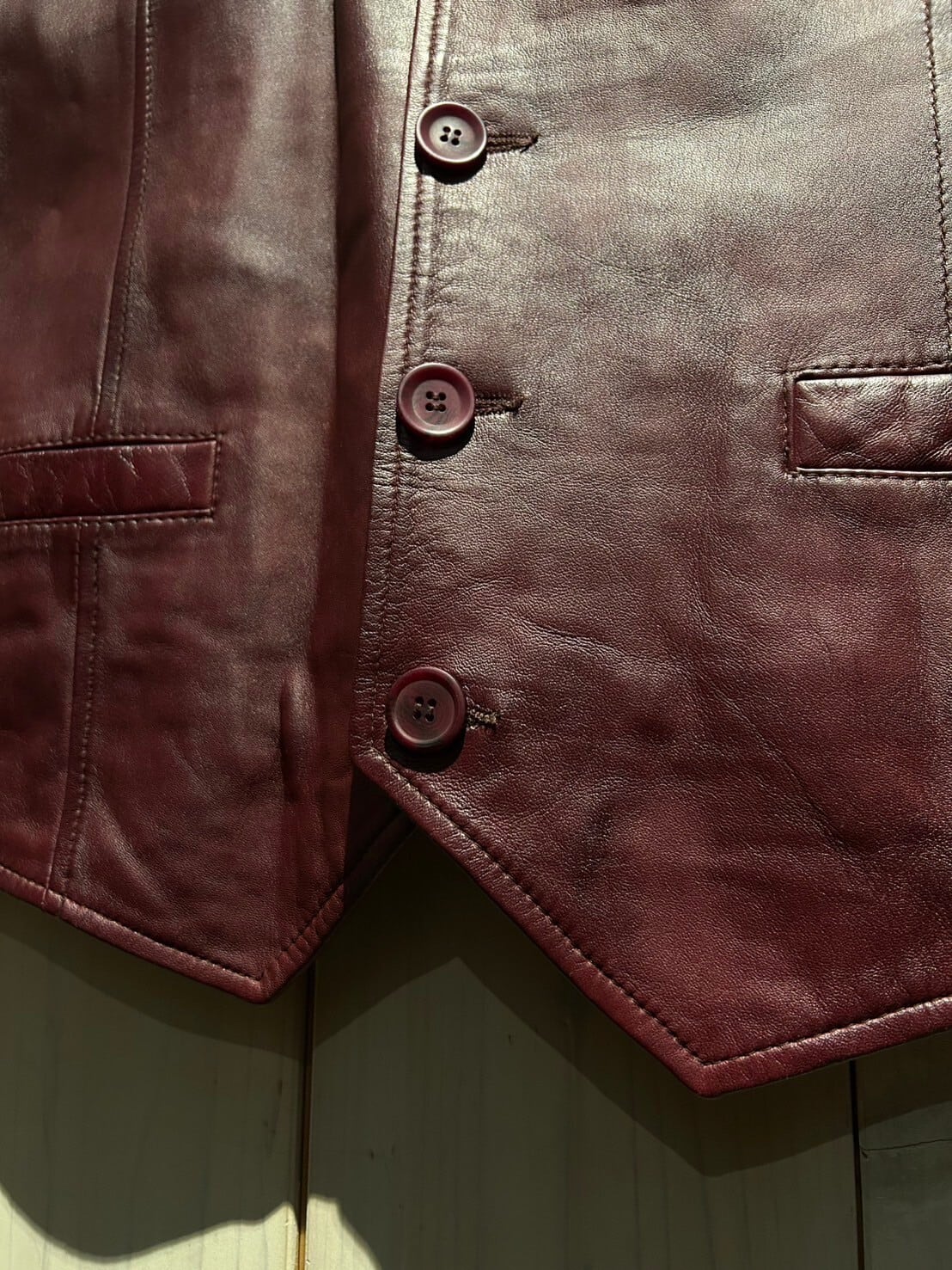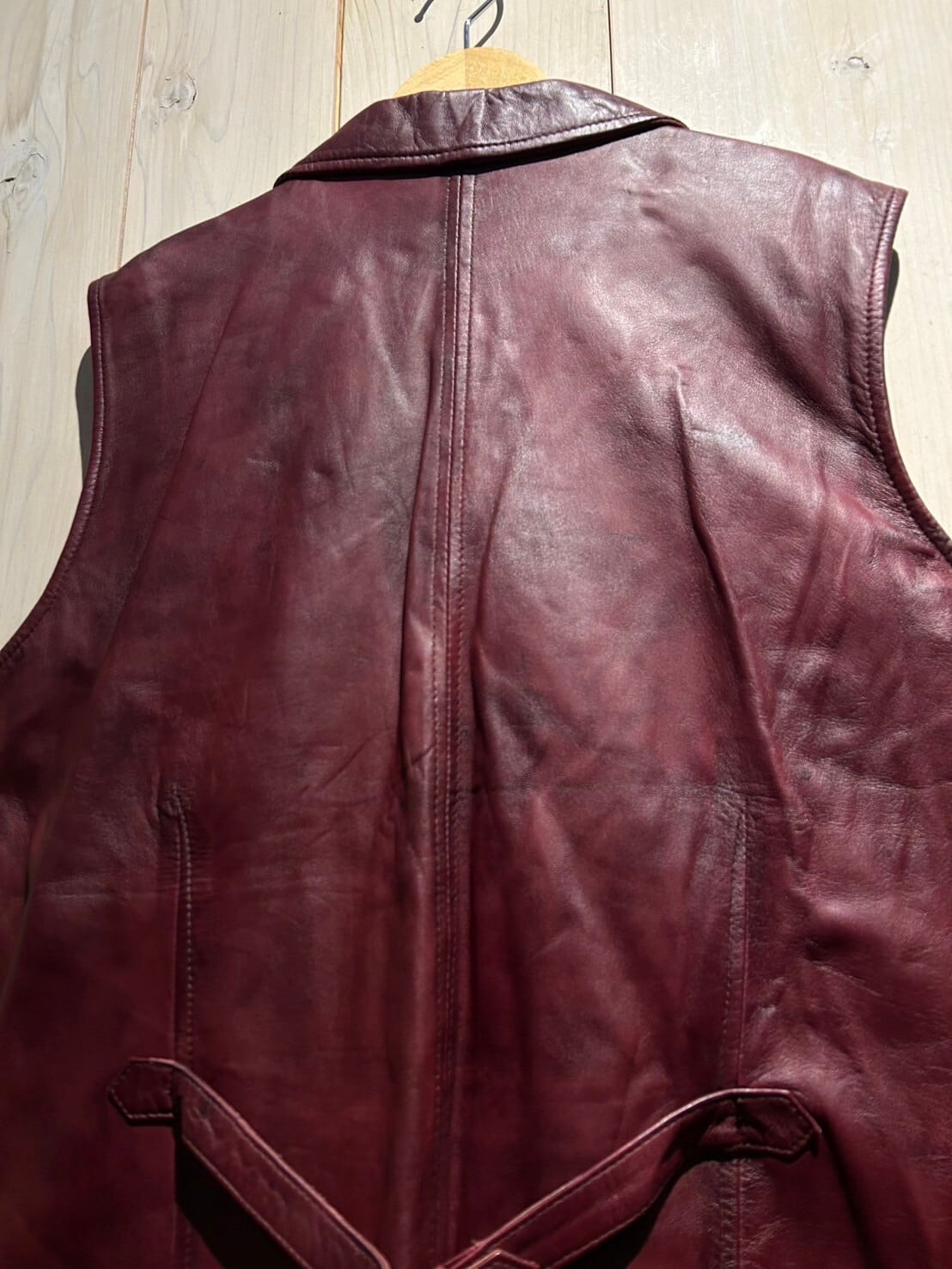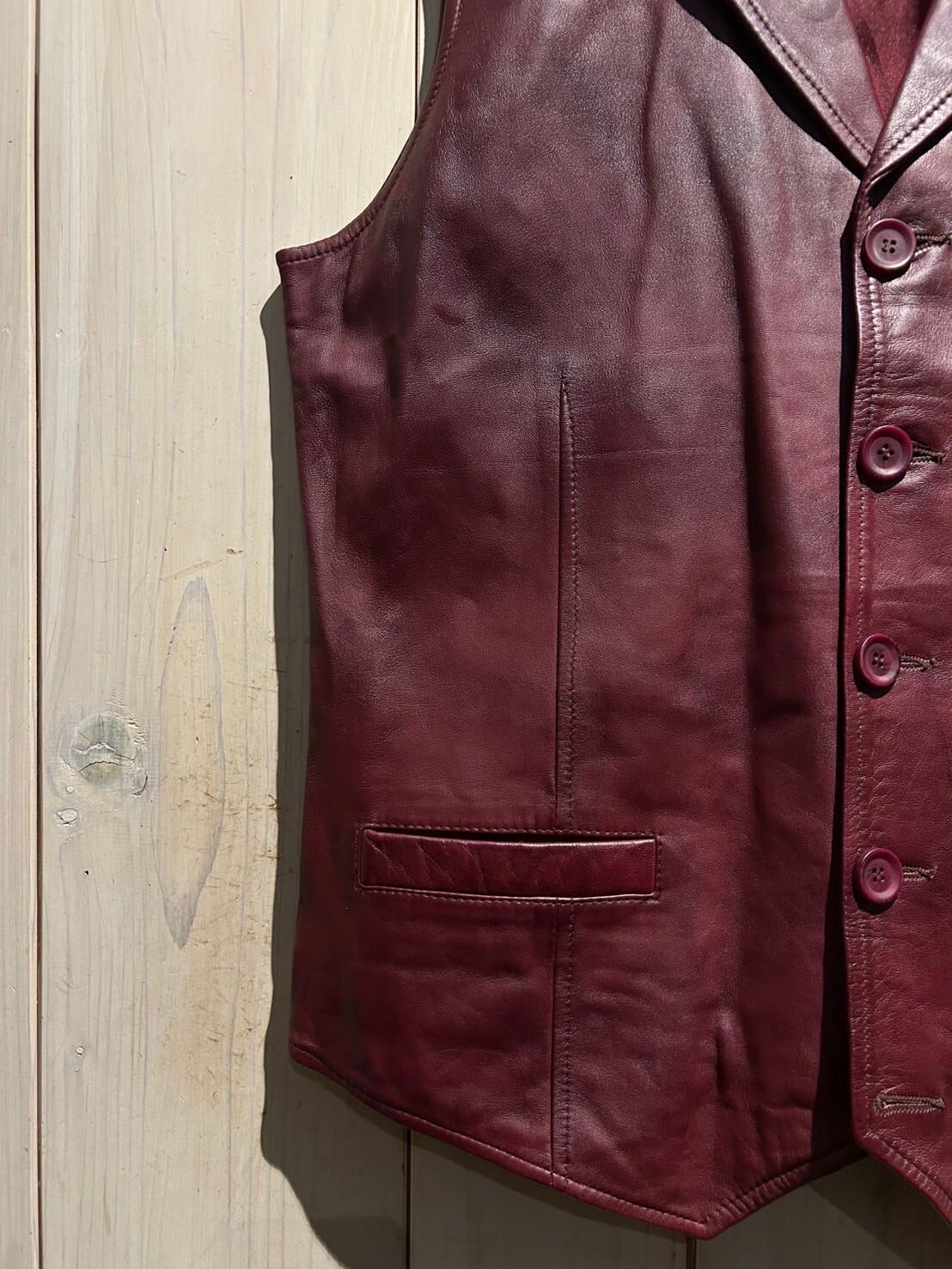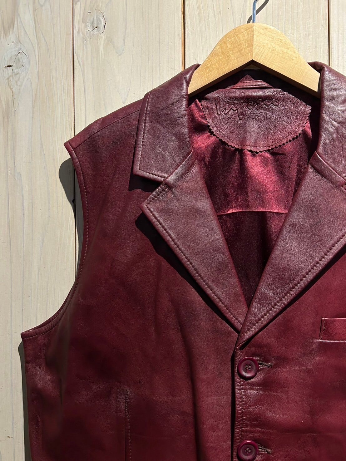 濃く深い赤のレザーを用いて、上品な型に落とし込んだレザーベスト。襟付きのディテールや色味も相まって非常に美しく、洗練された雰囲気を放ちます。