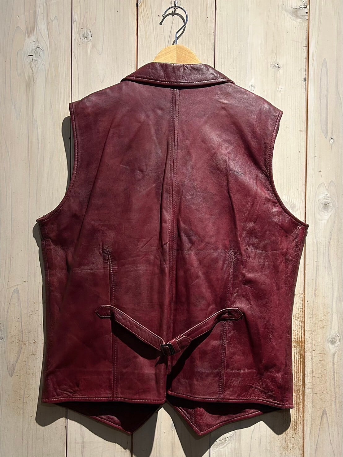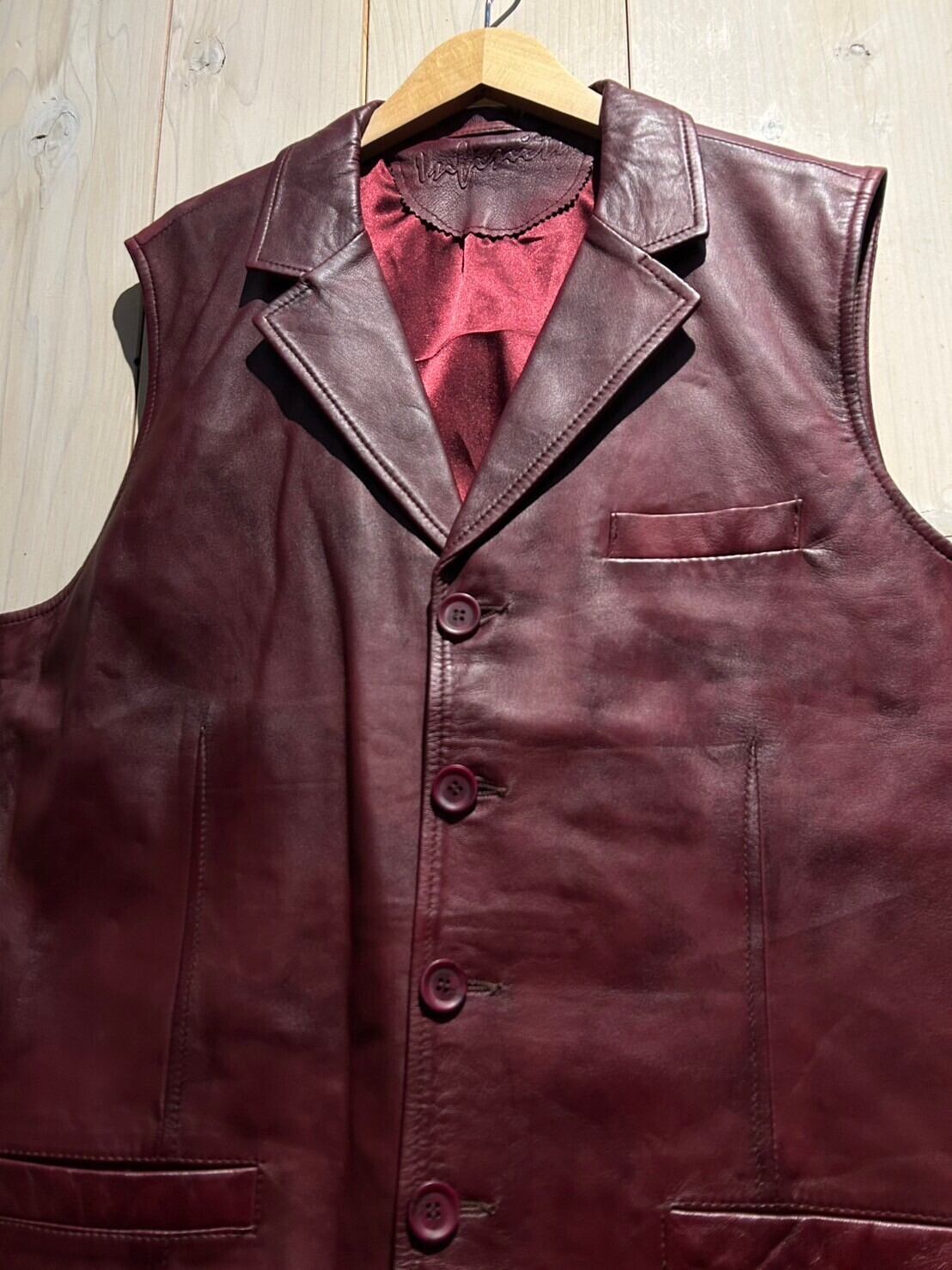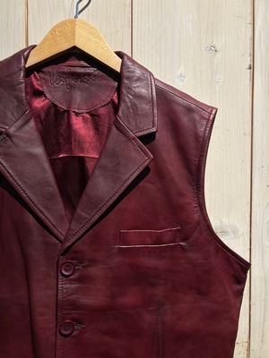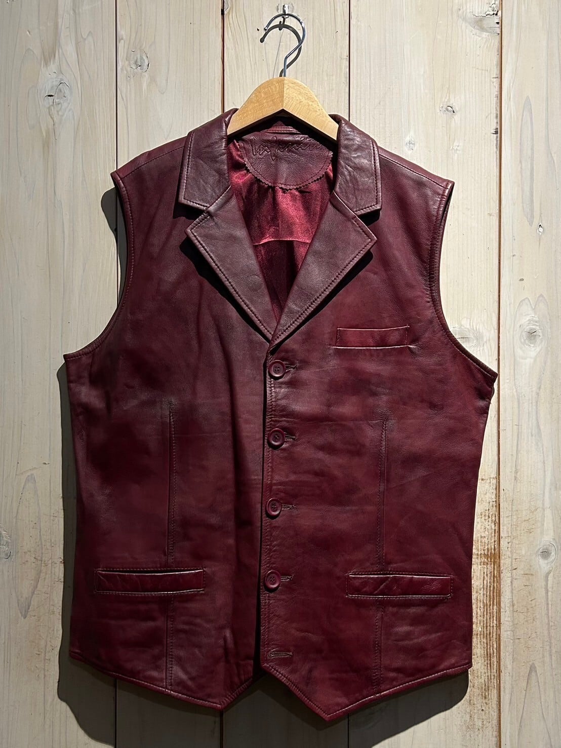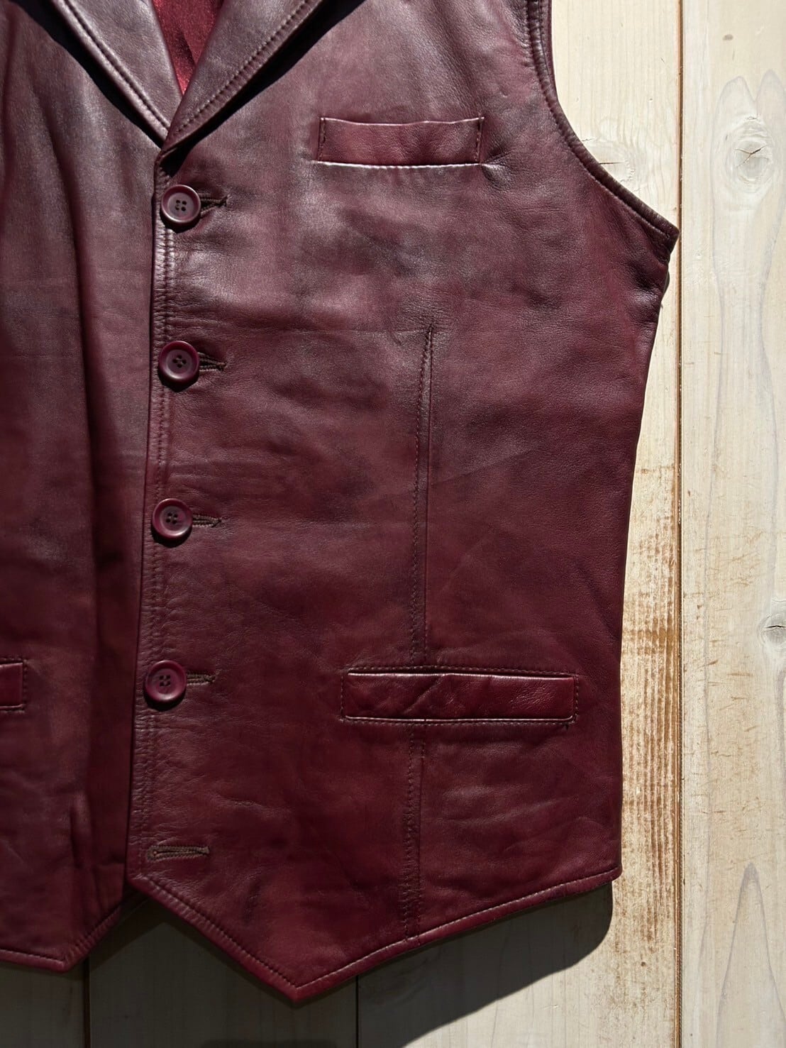 濃く深い赤のレザーを用いて、上品な型に落とし込んだレザーベスト。襟付きのディテールや色味も相まって非常に美しく、洗練された雰囲気を放ちます。