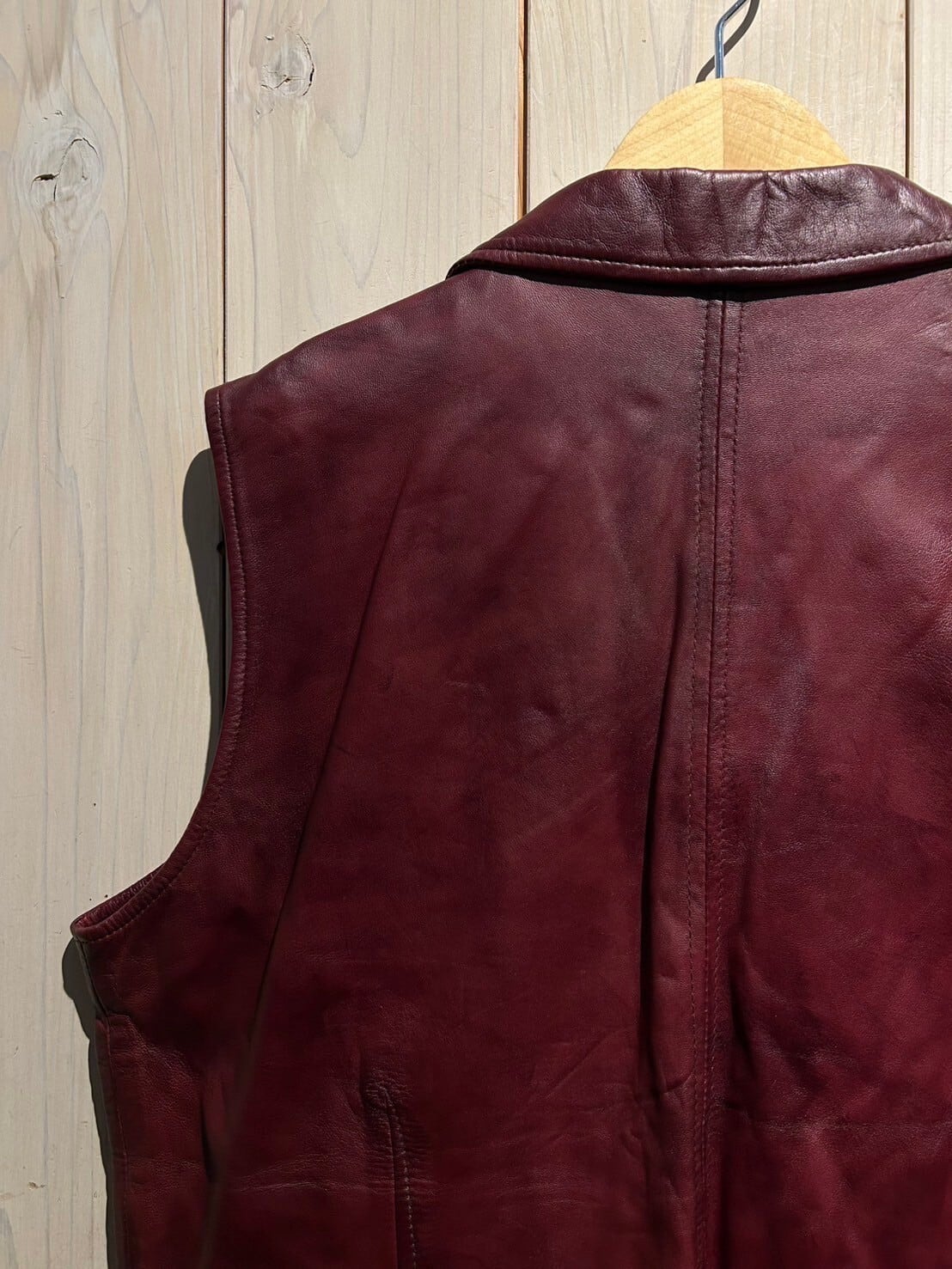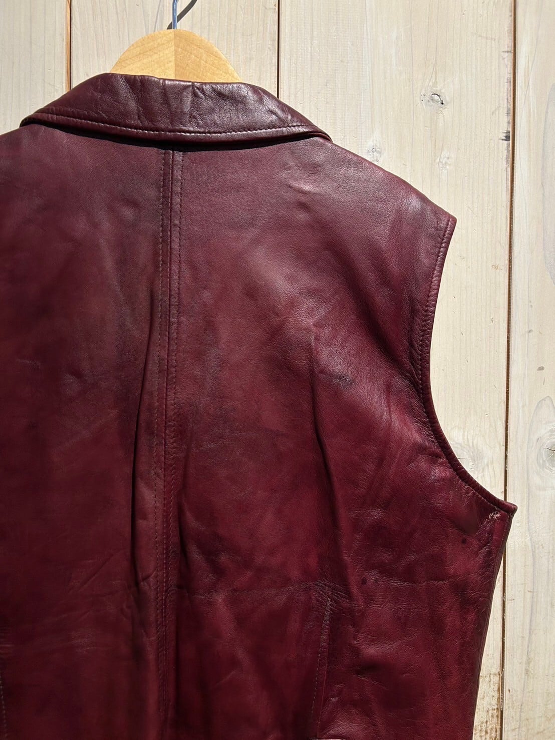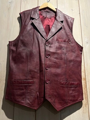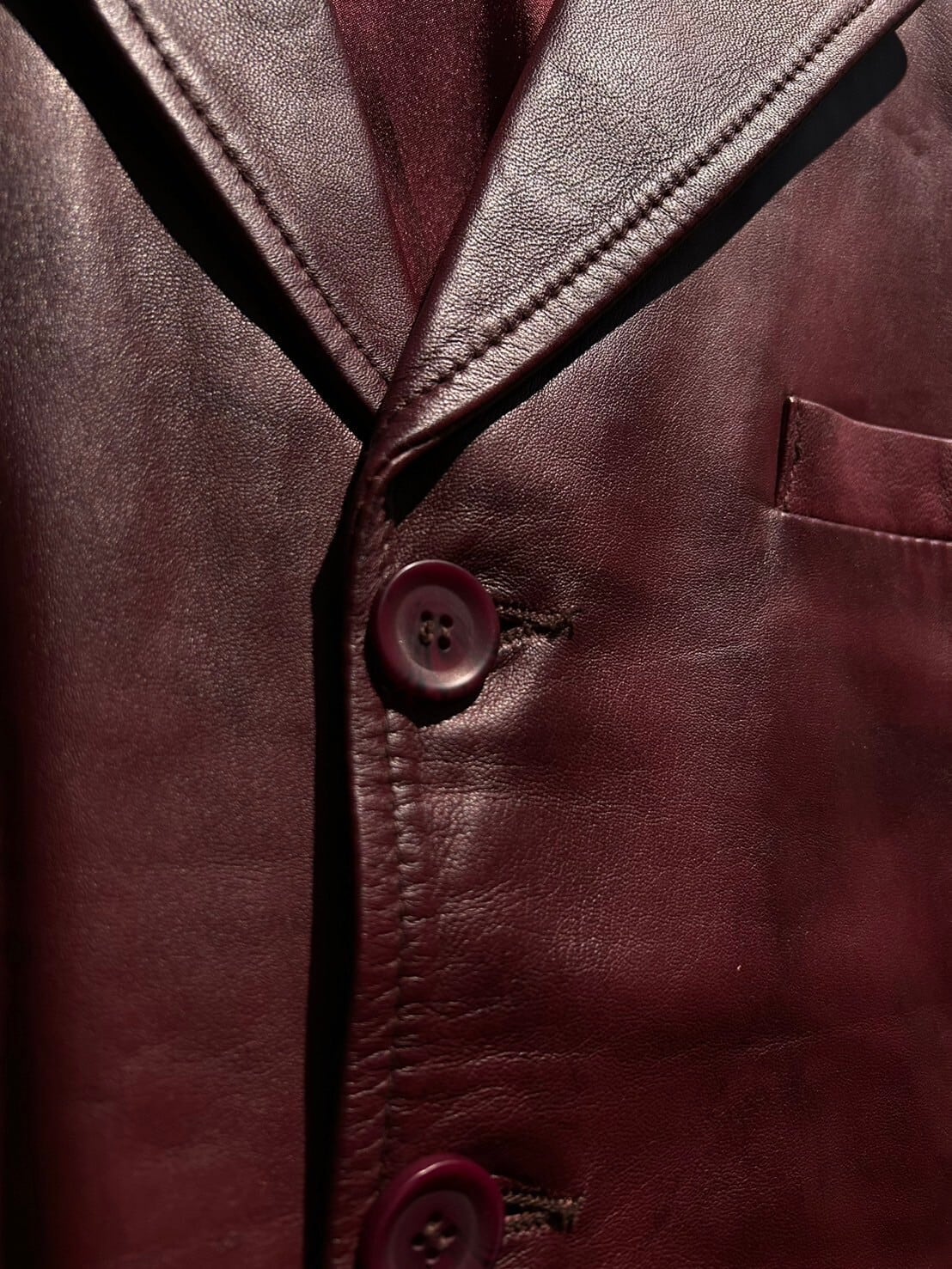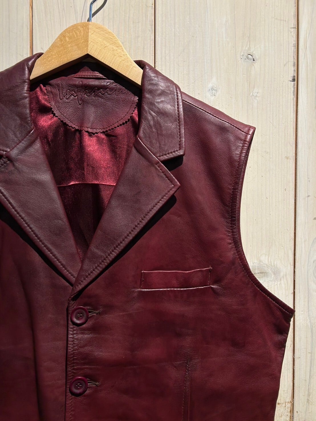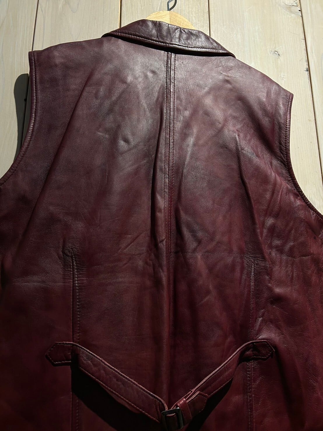 濃く深い赤のレザーを用いて、上品な型に落とし込んだレザーベスト。襟付きのディテールや色味も相まって非常に美しく、洗練された雰囲気を放ちます。