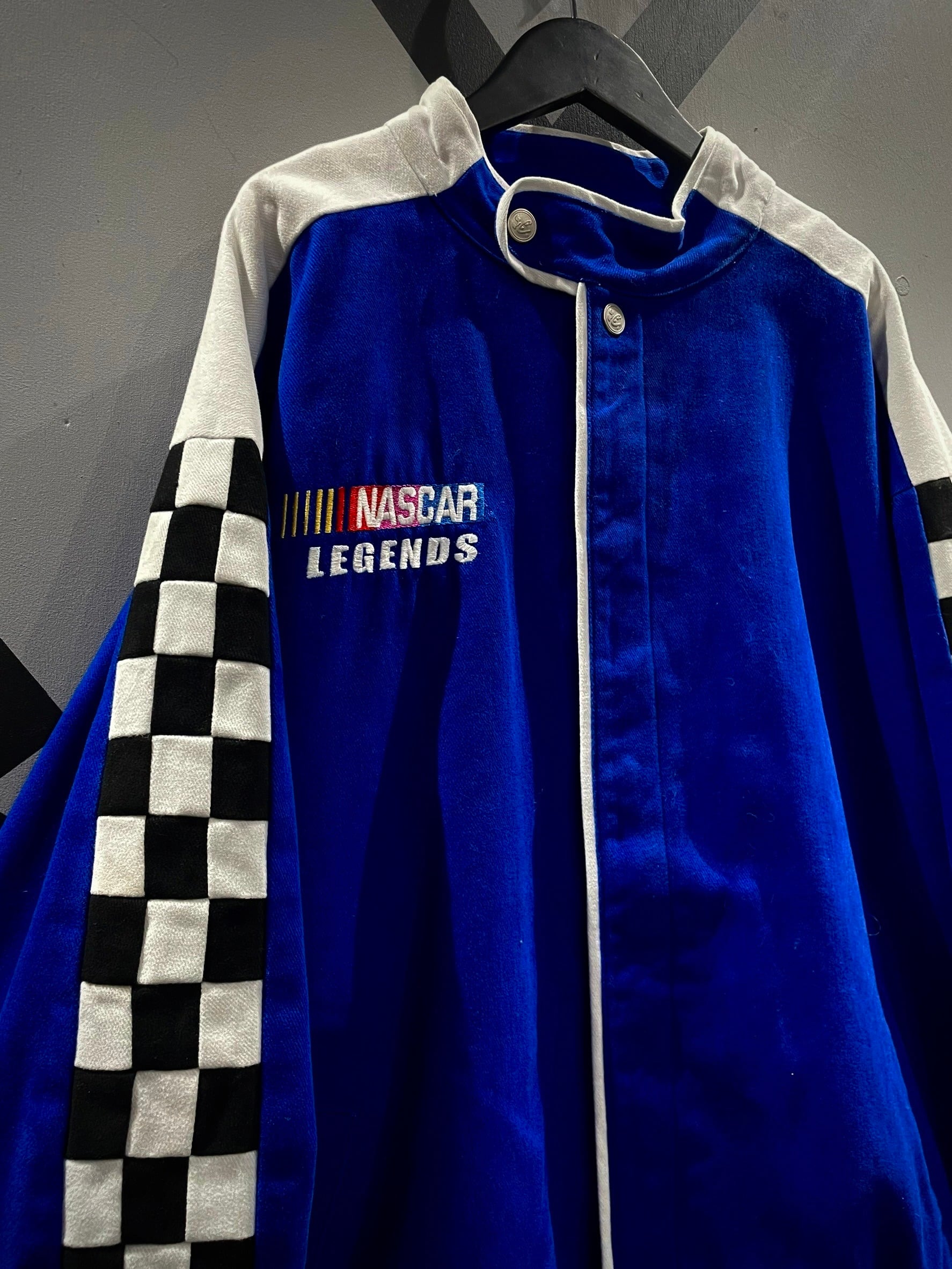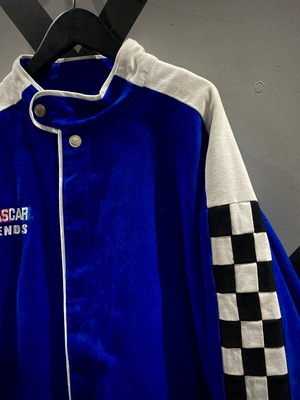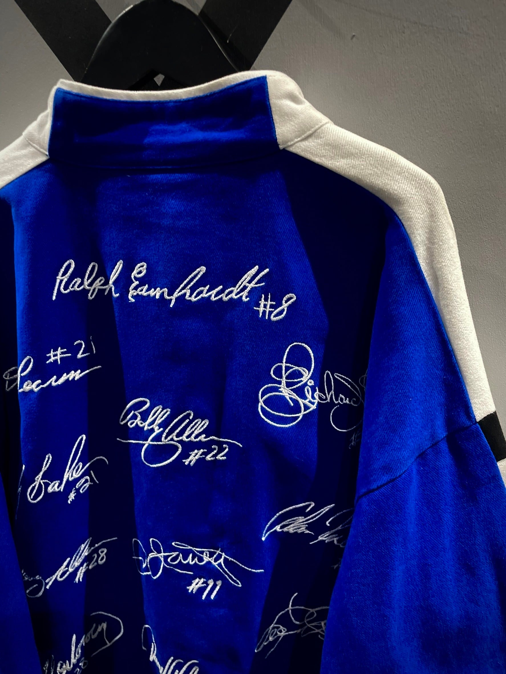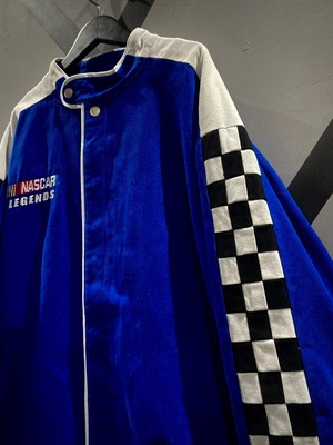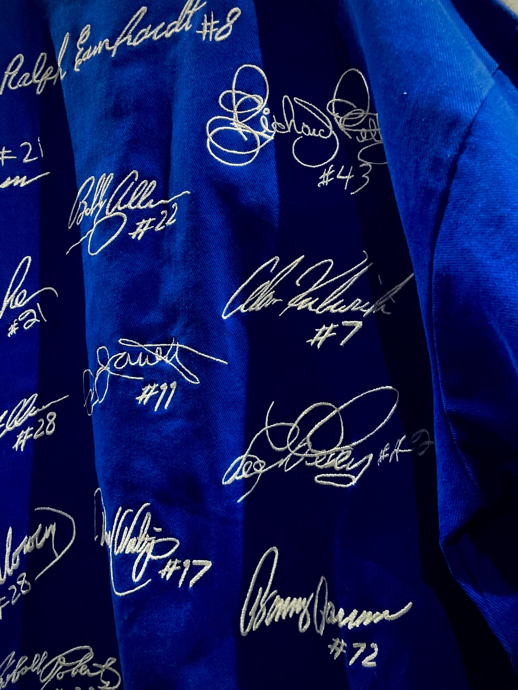 ブルーのボディをベースに、アームにはフラッグ、背面にはナスカーのレジェンド達のサインを刺繍で刻んだ、贅沢なレーシングジャケット。