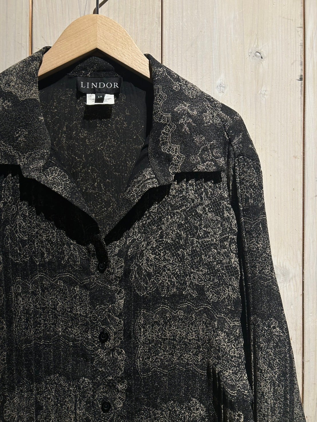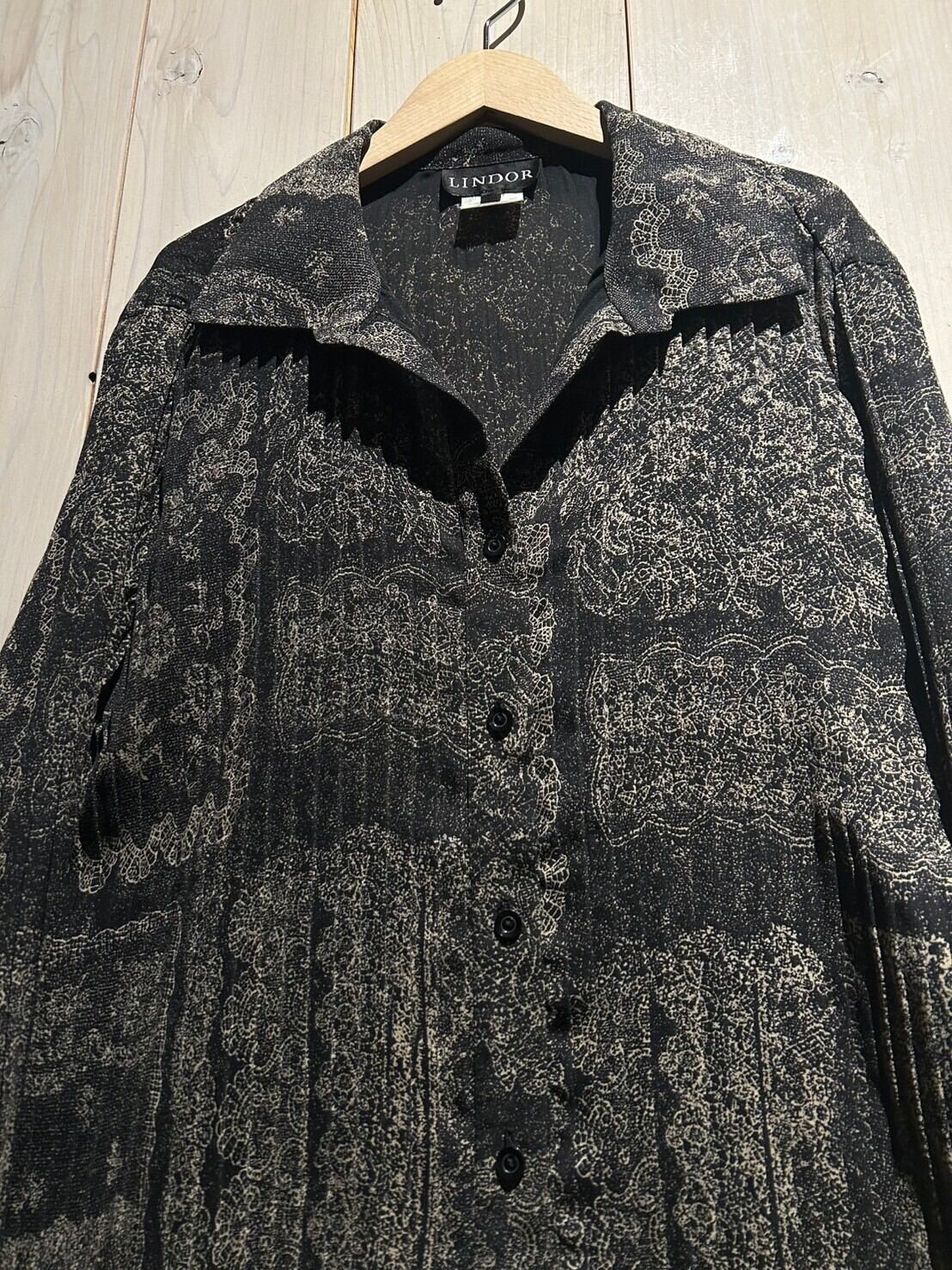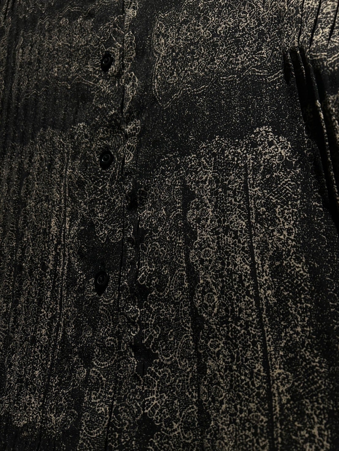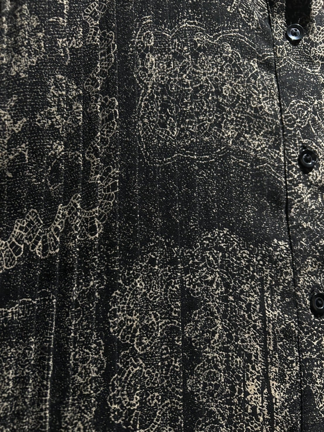 ブラックをベースに繊細なヨーロピアン風のデザインを載せた生地をプリーツ加工したシャツジャケット。