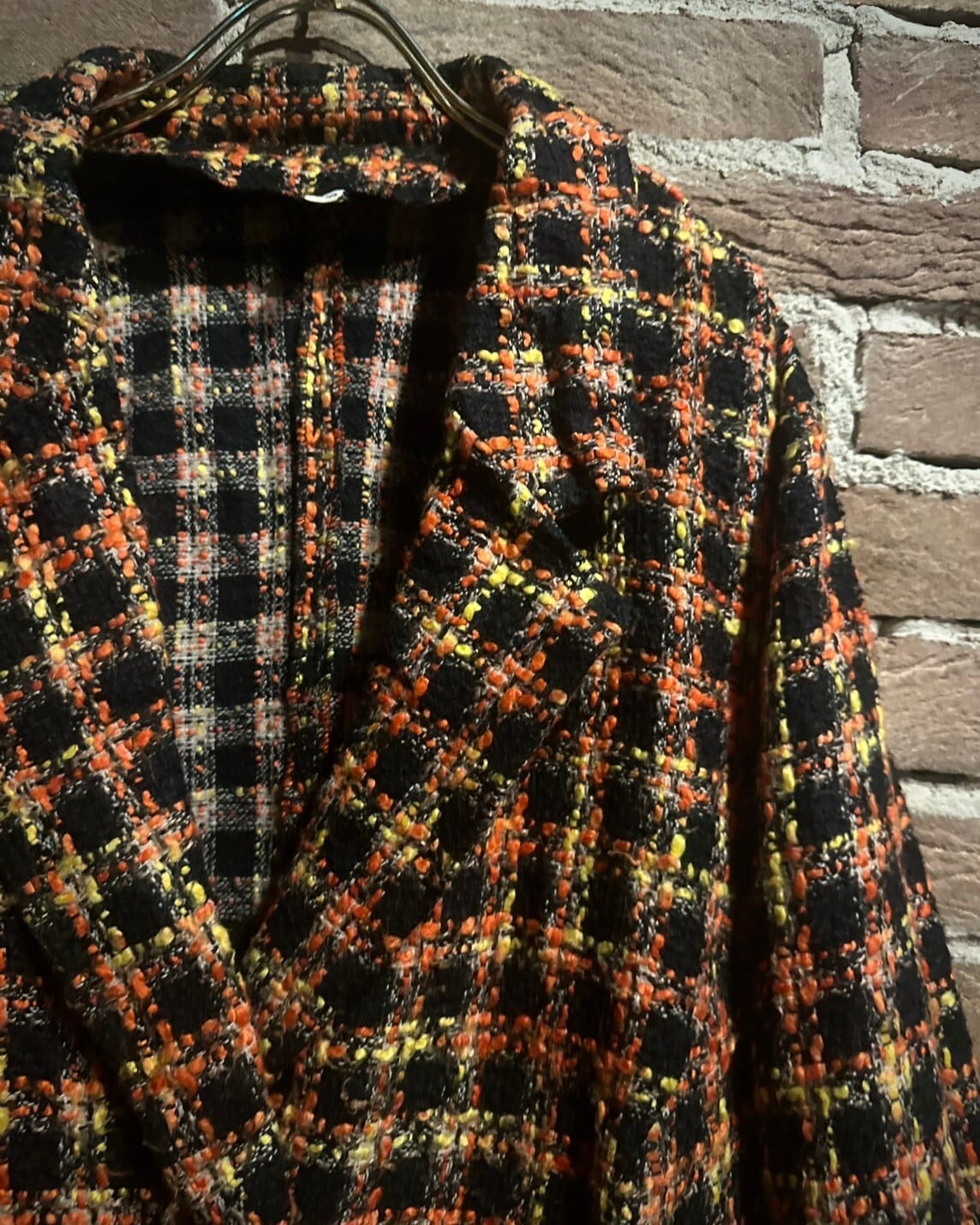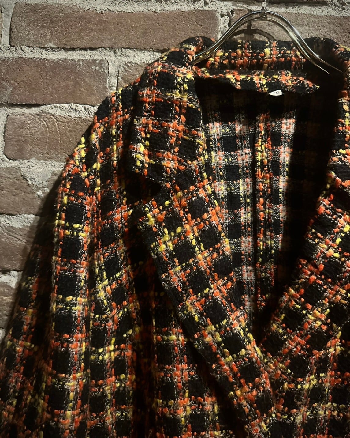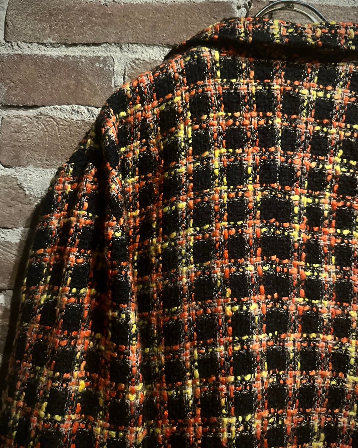 こちらの1着は、黒、黄色、オレンジの3種のカラーでチェック状に編み込んだ、重厚感溢れる見た目から高級感を漂わせるスペシャルなテーラードジャケット。