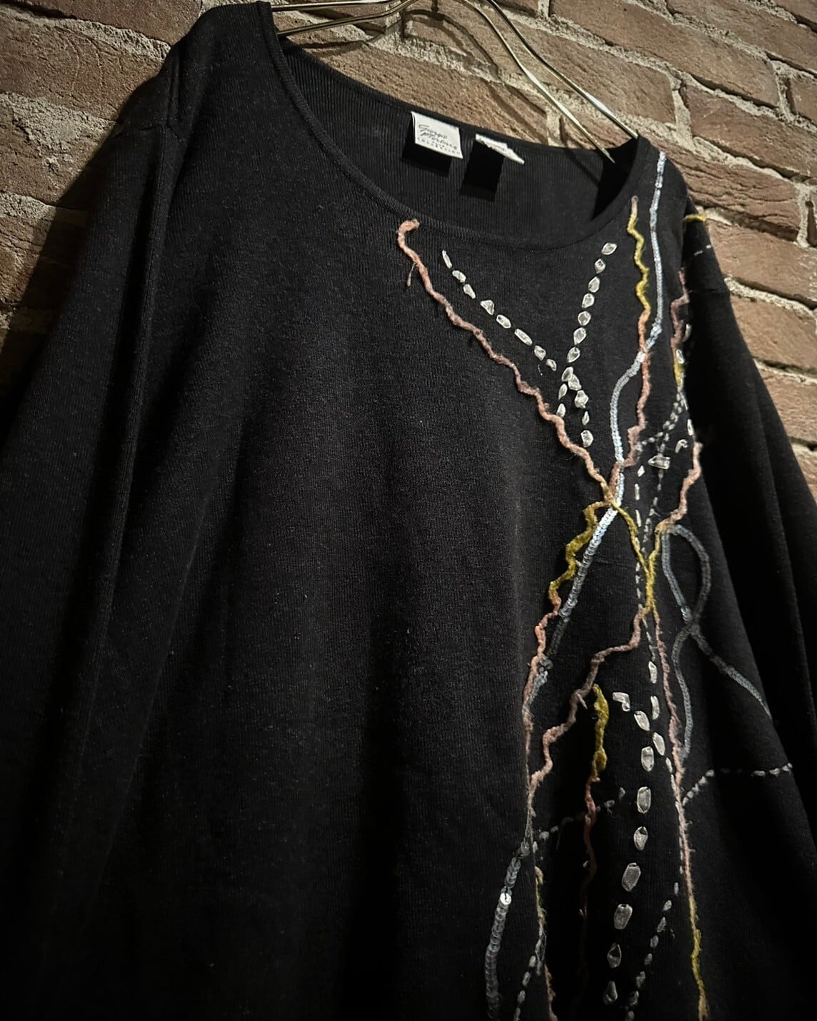 ブラックのボディをベースに、糸、スパンコールでアーティスティックなラインを載せたプルオーバーニット。