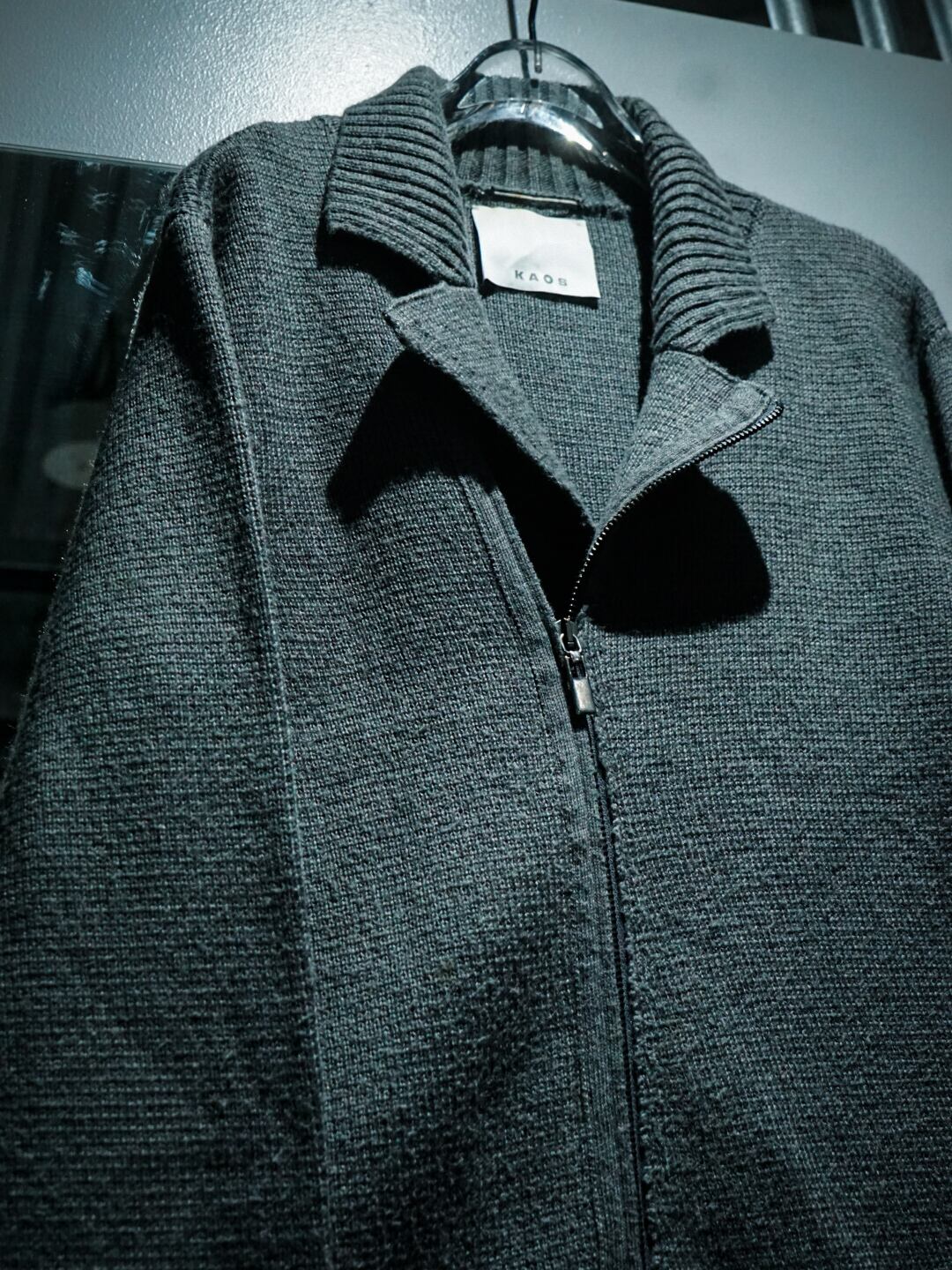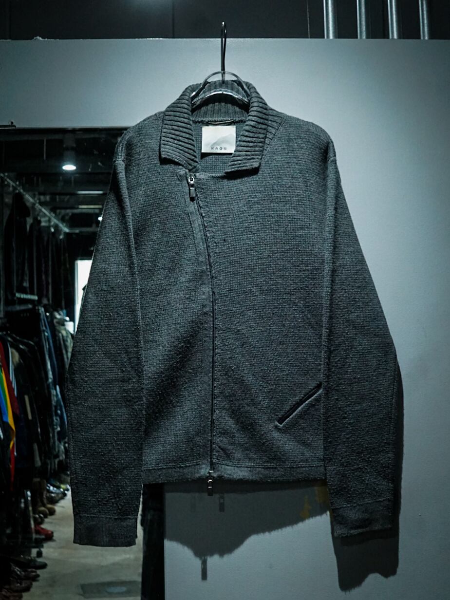 滑らかなグレーのニットを用いてダブルライダースのディティールを落とし込んだ、当店らしいテクニカルな雰囲気が漂うニットジャケット。