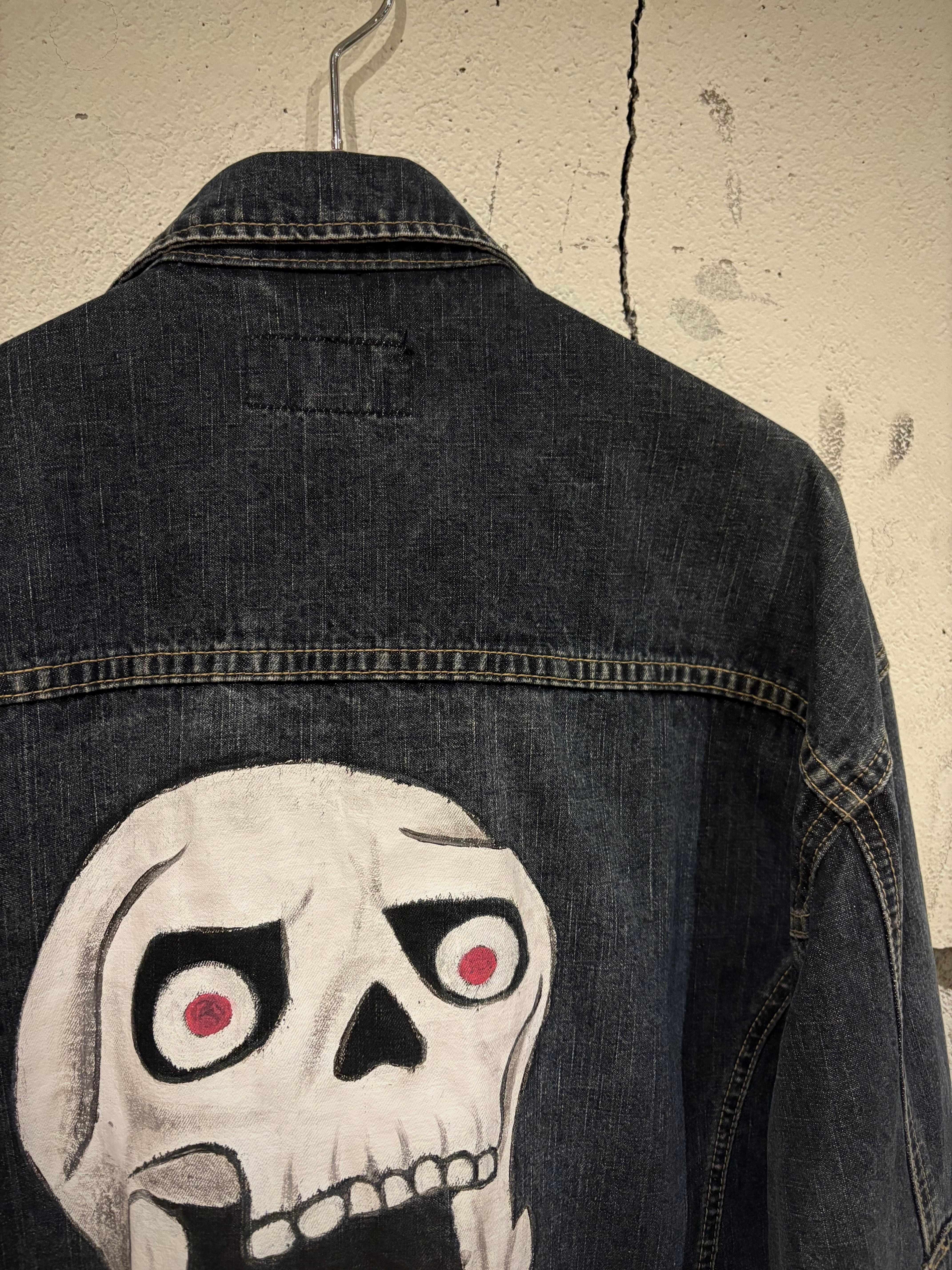 程よく色落ちしたインディゴブルーのデニムジャケットに、前所有者によってスカルのハンドペイントのカスタムが施された1着。