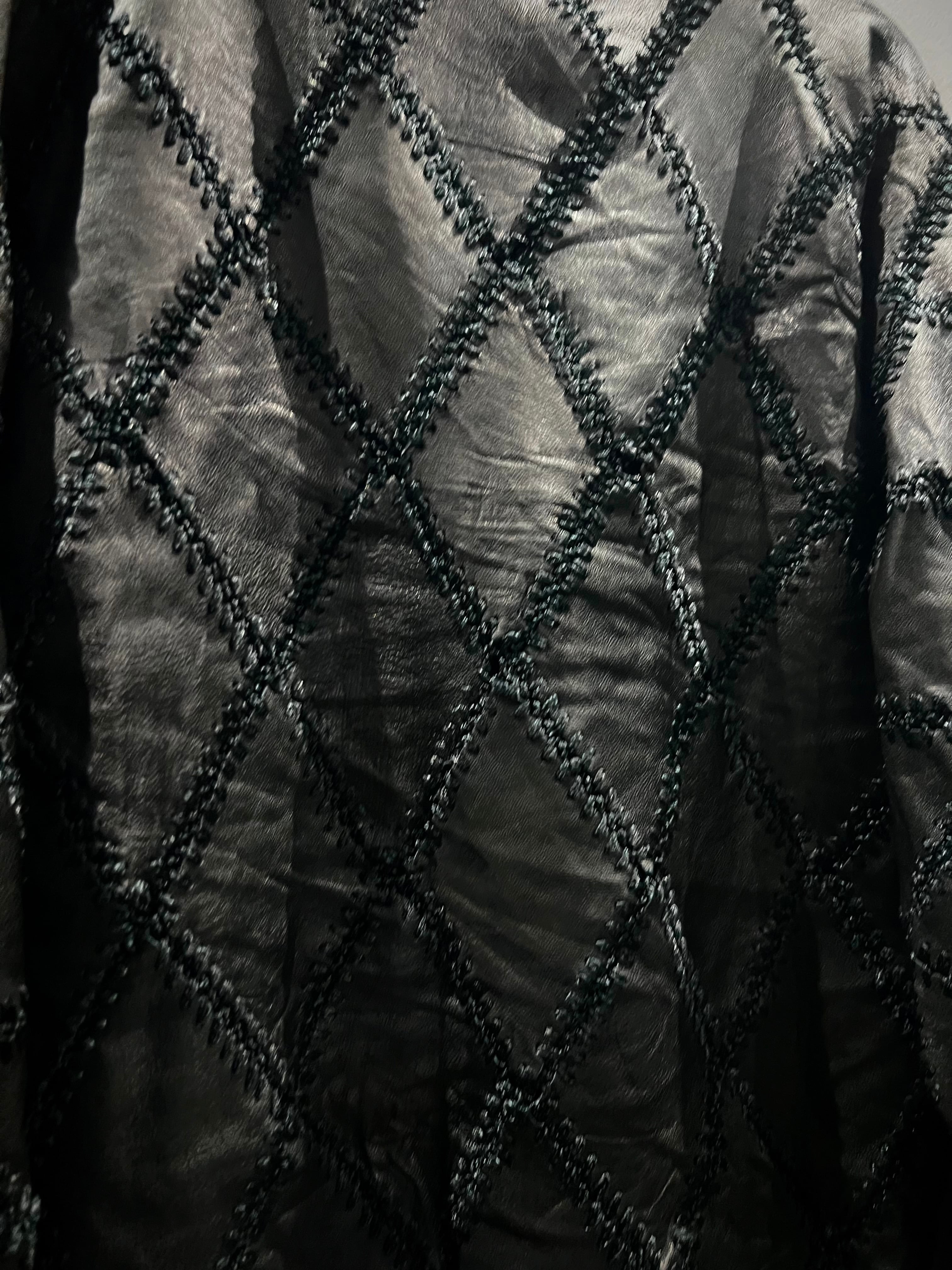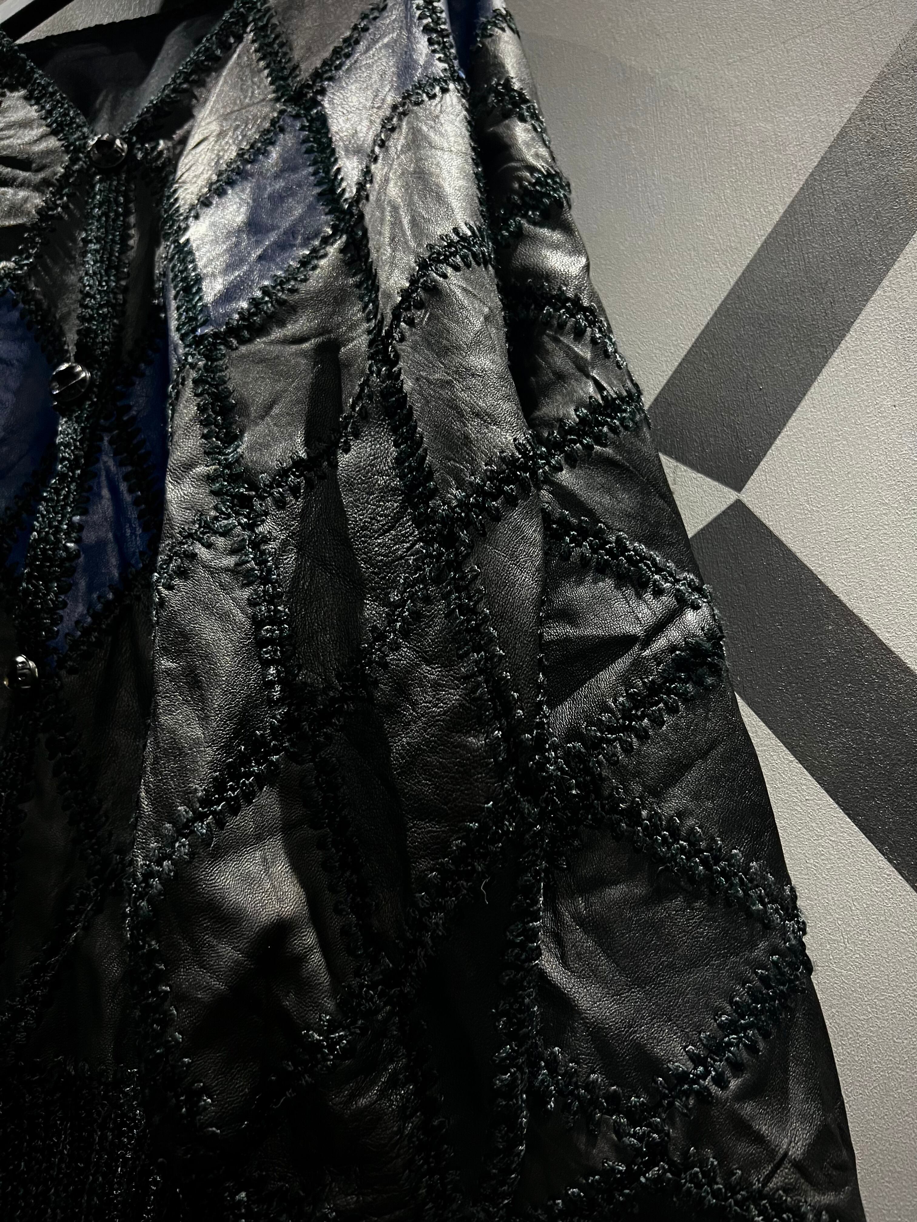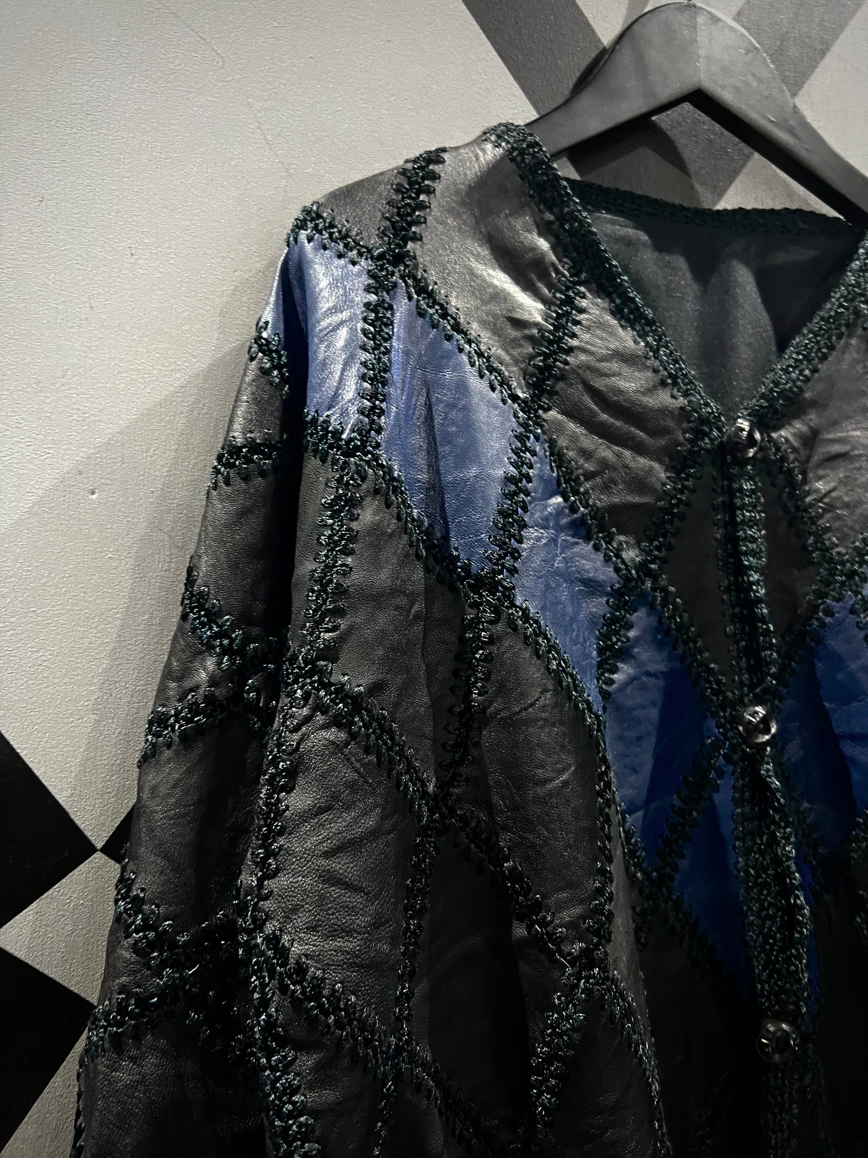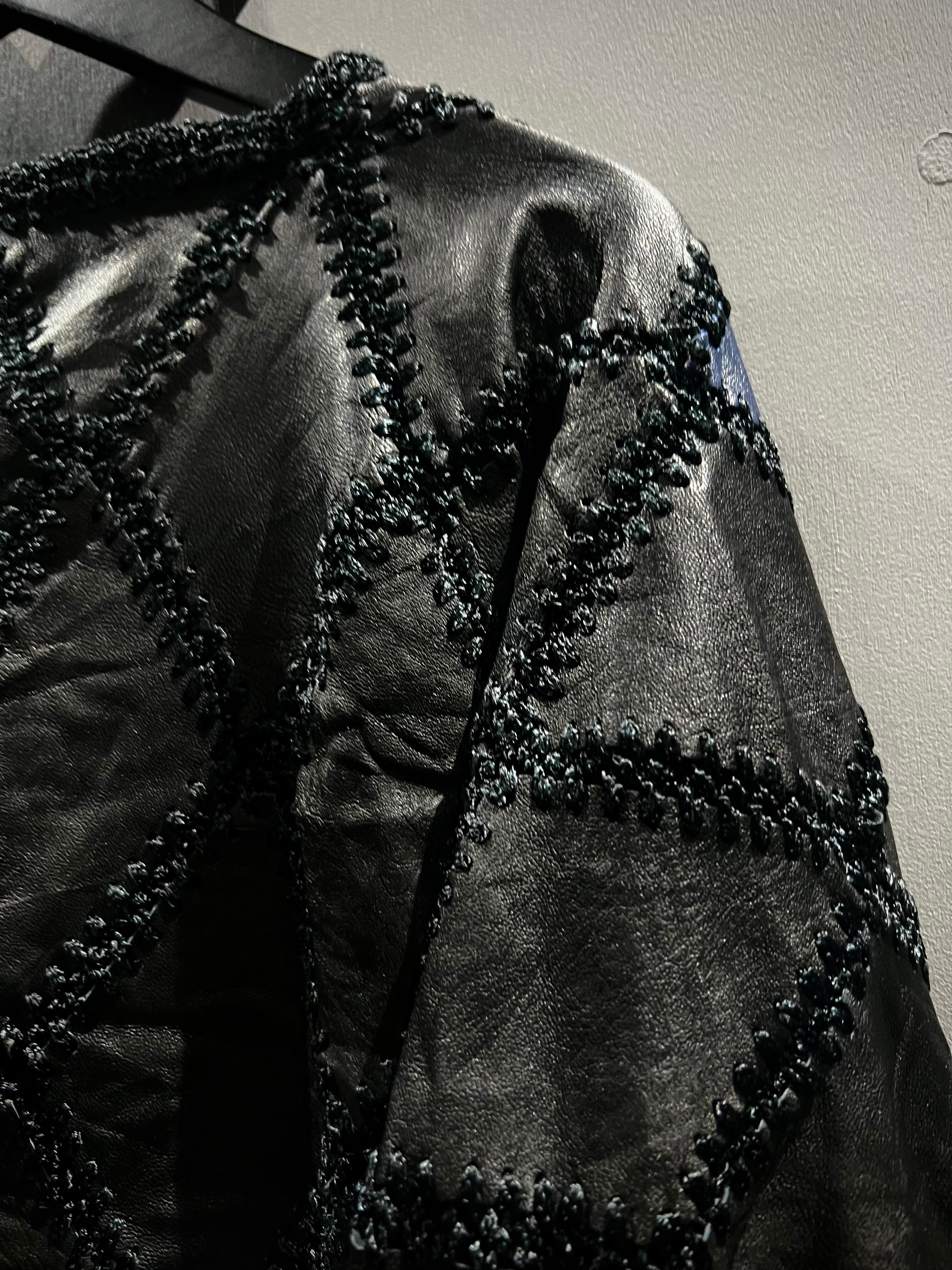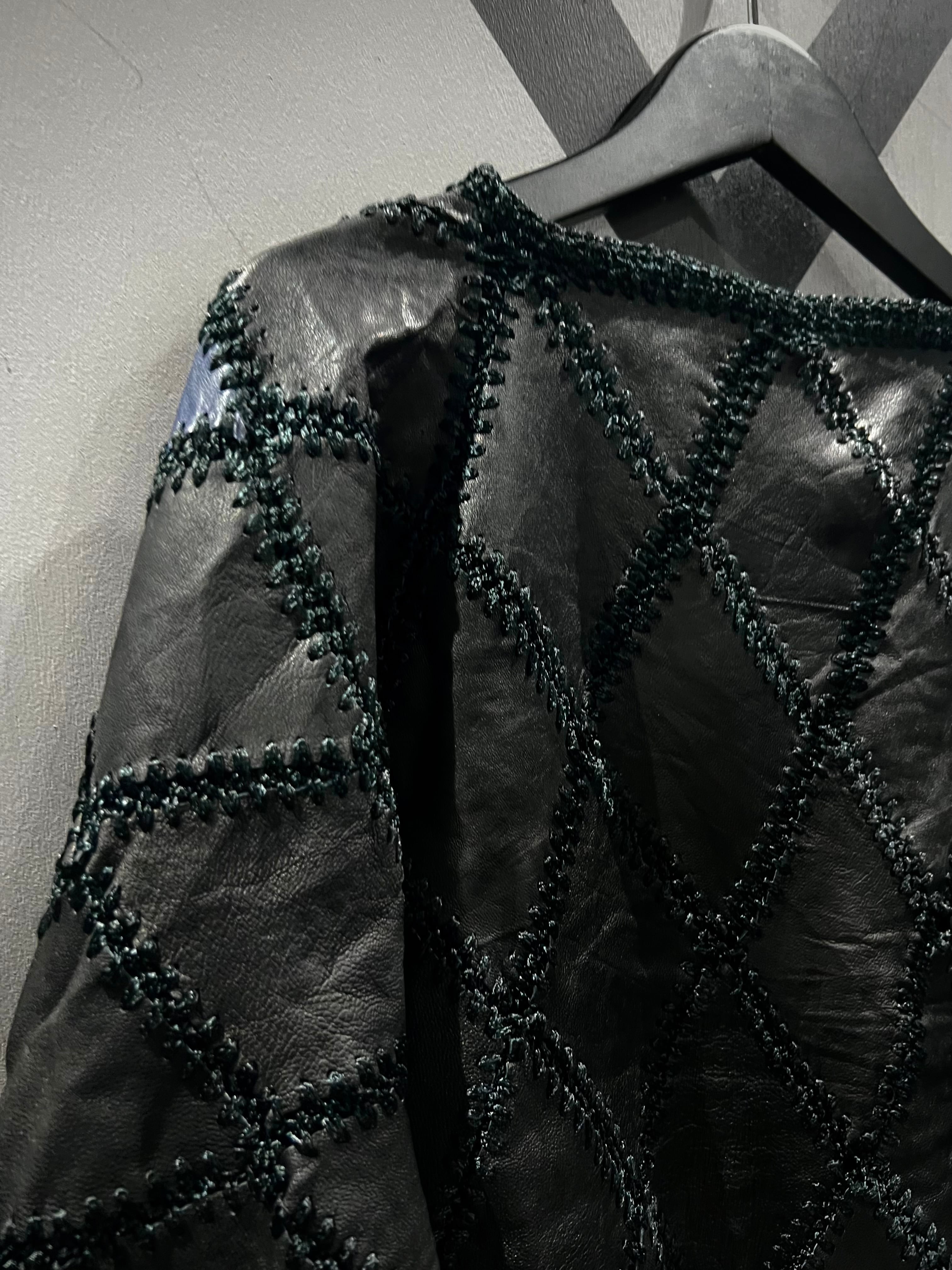 艶やかなブラックレザーを格子状のパッチワークの様につなぎ合わせ、尚且つダイヤモンド調のデザインに落としこみ、非常に手の込んだスペシャルなカーディガンジャケット。