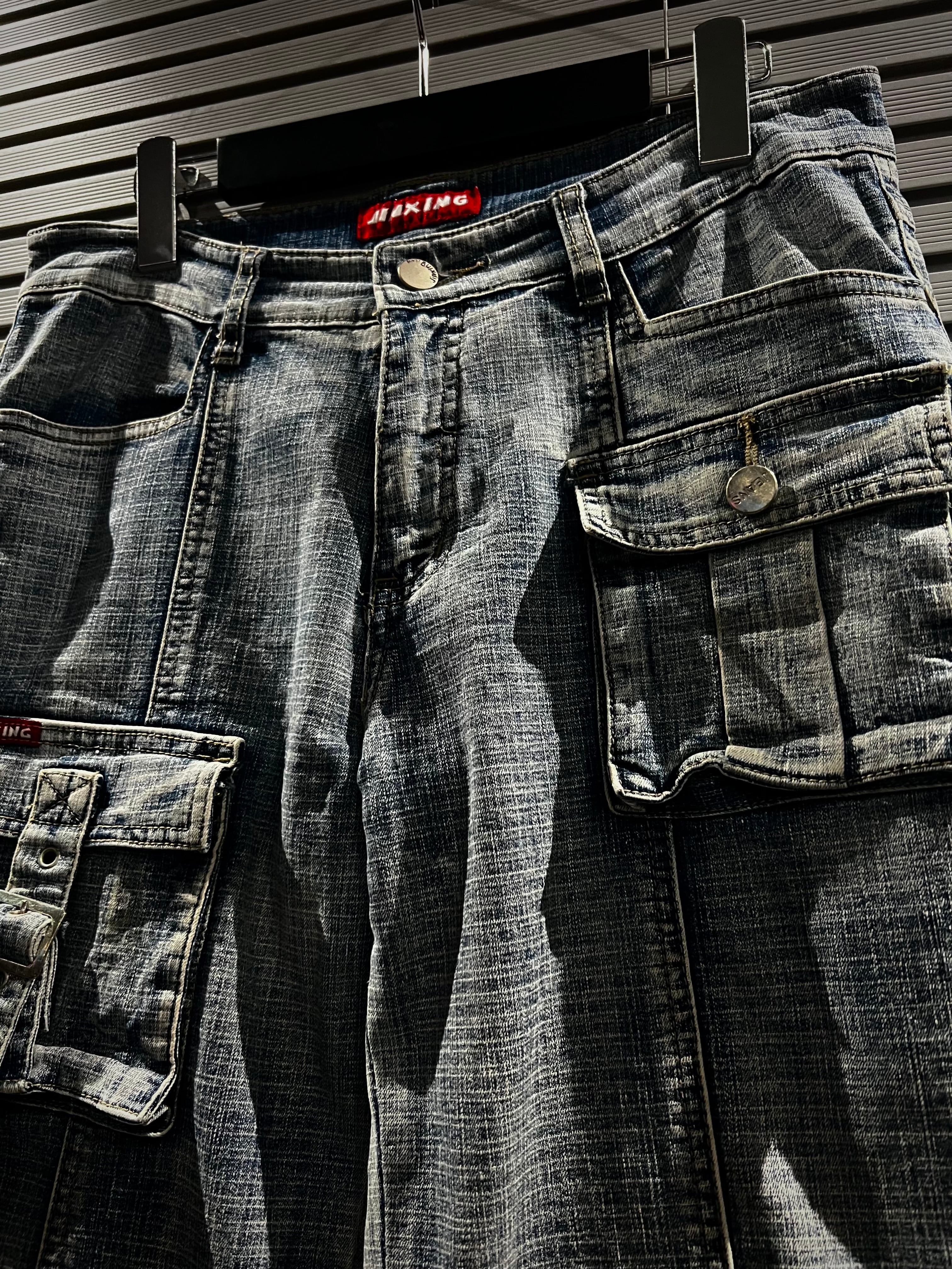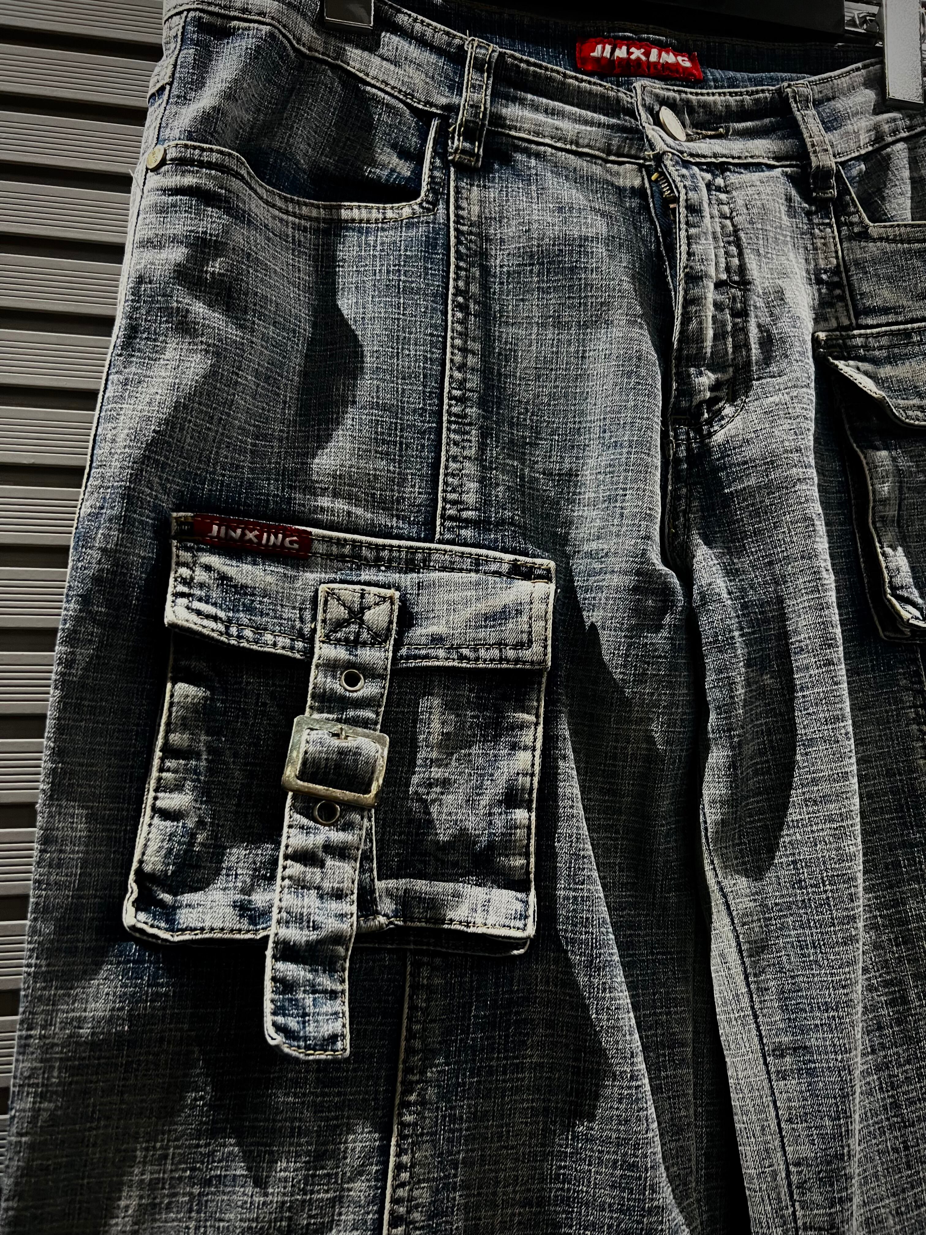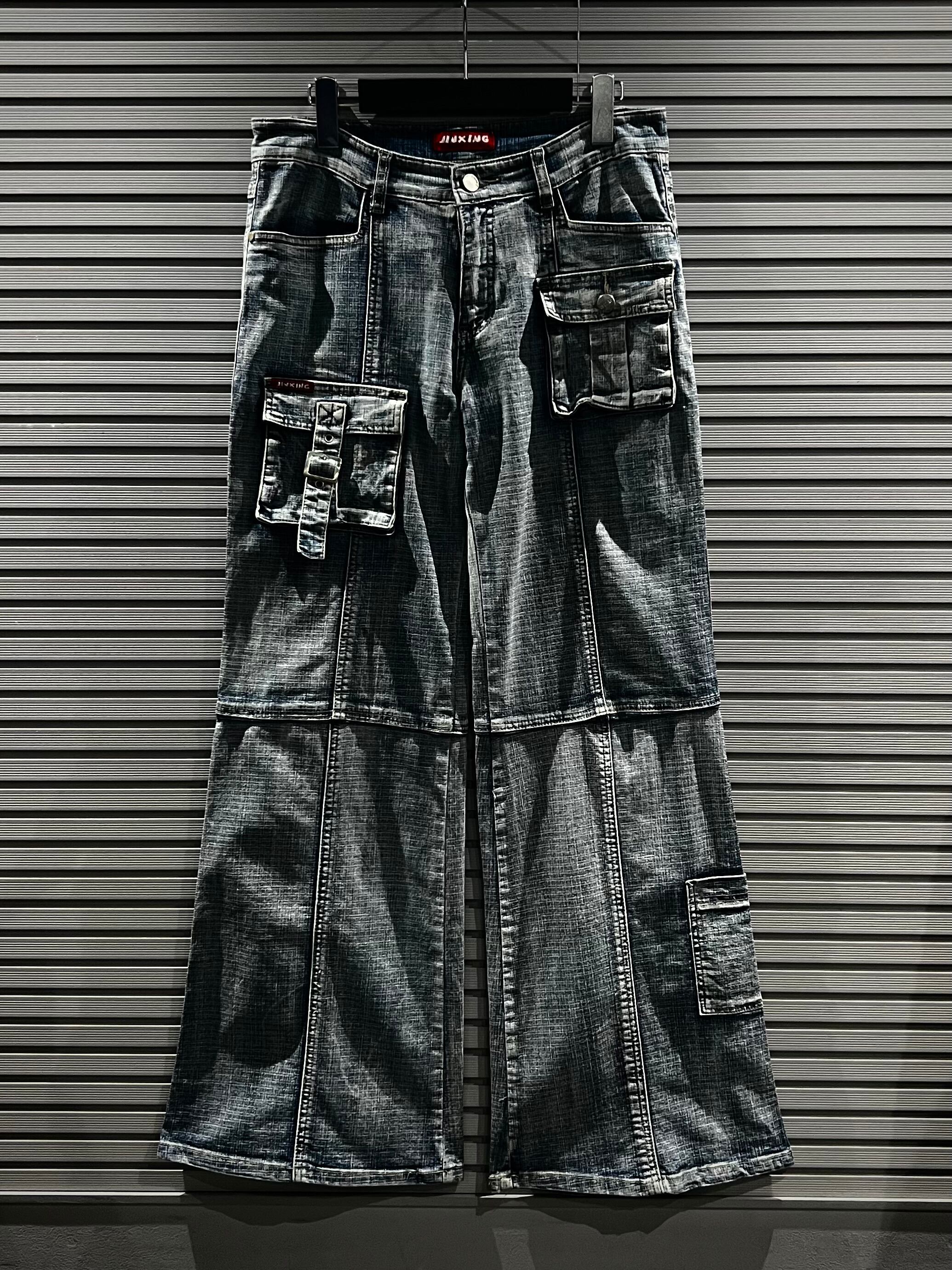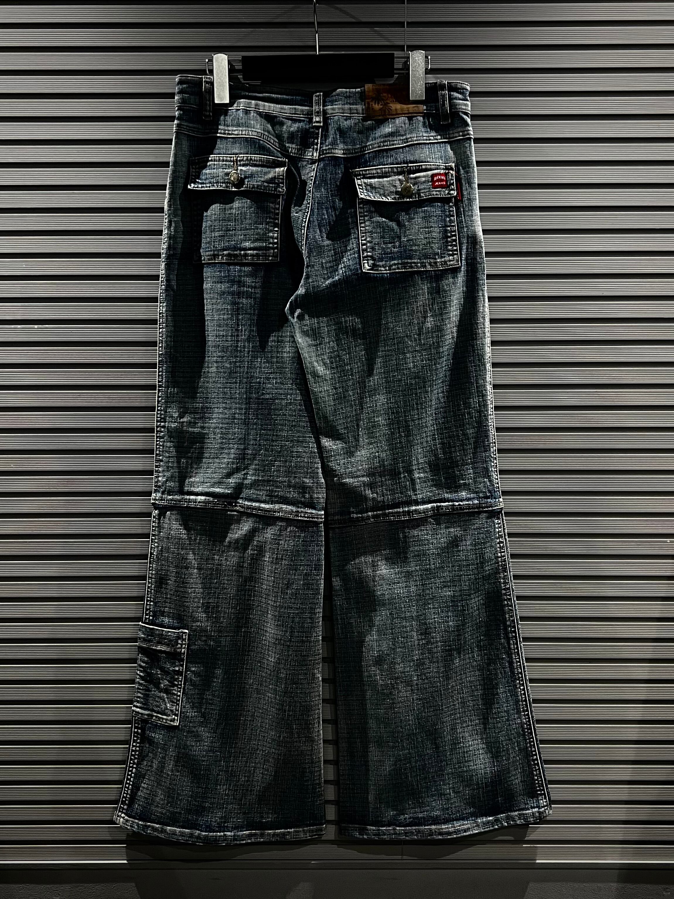 アタリの良いデニムのボディに、マチ、ベルト付きのポケットを載せたデニムパンツ。