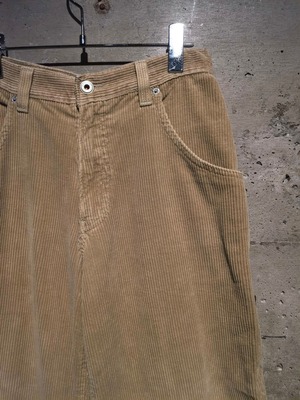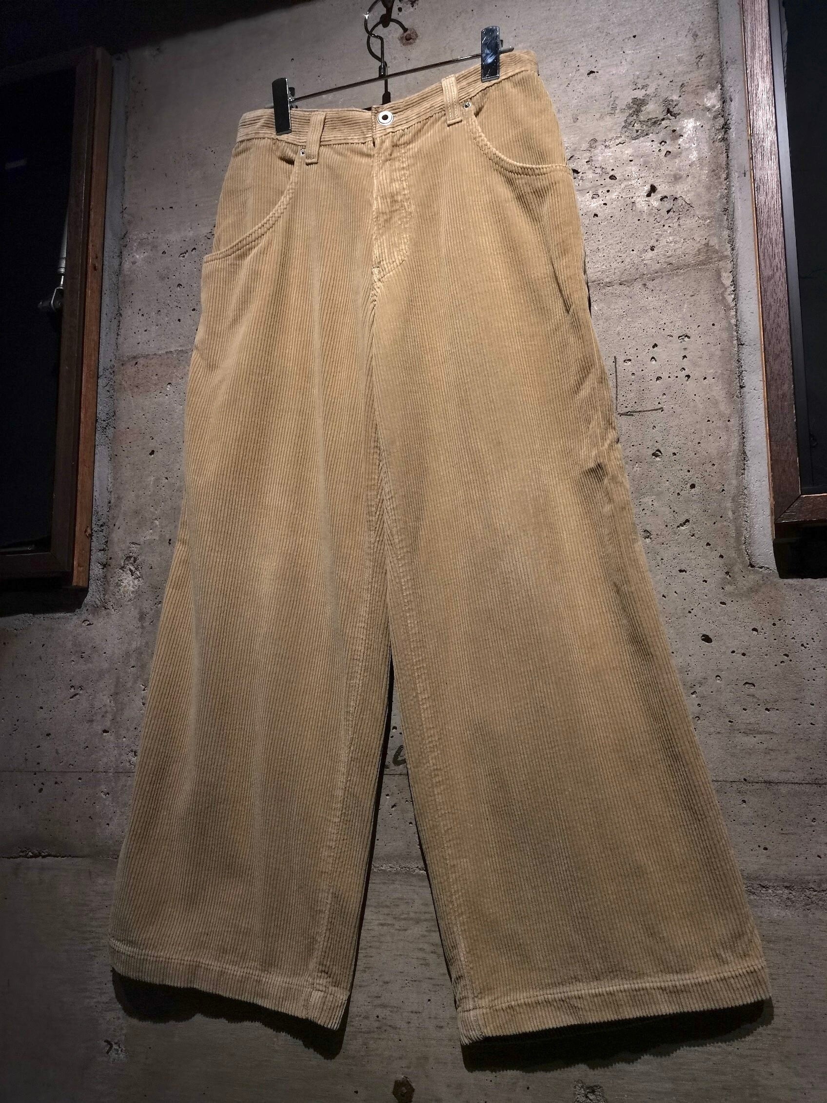 ベージュの太畝のコーデュロイをボディに用い、背面にパッチと刺繍でブランドネームを載せたコーデュロイバギーパンツ。
