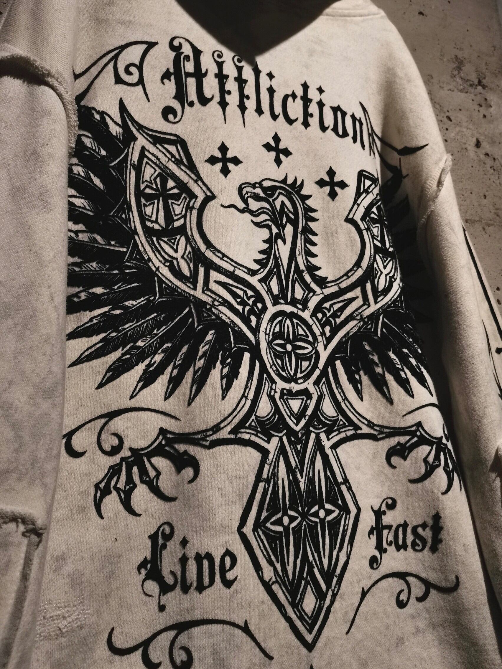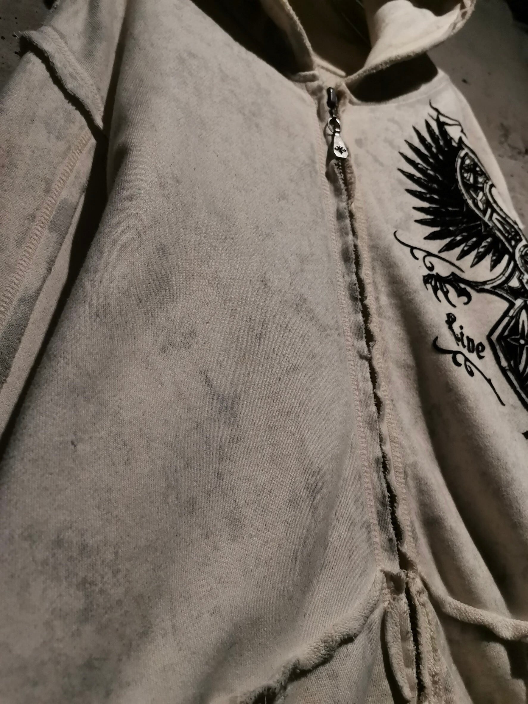 パリス・ヒルトンやザ・ロックなど多くのアーティストやアスリートを魅了し、ジョシュ・バーネット、チャック・リデル、オジー・オズボーンなどとのコラボレーション実績もあるアメリカンカジュアルブランド"Affliction"より、稀有なジップアップフーディの1着をご紹介致します。