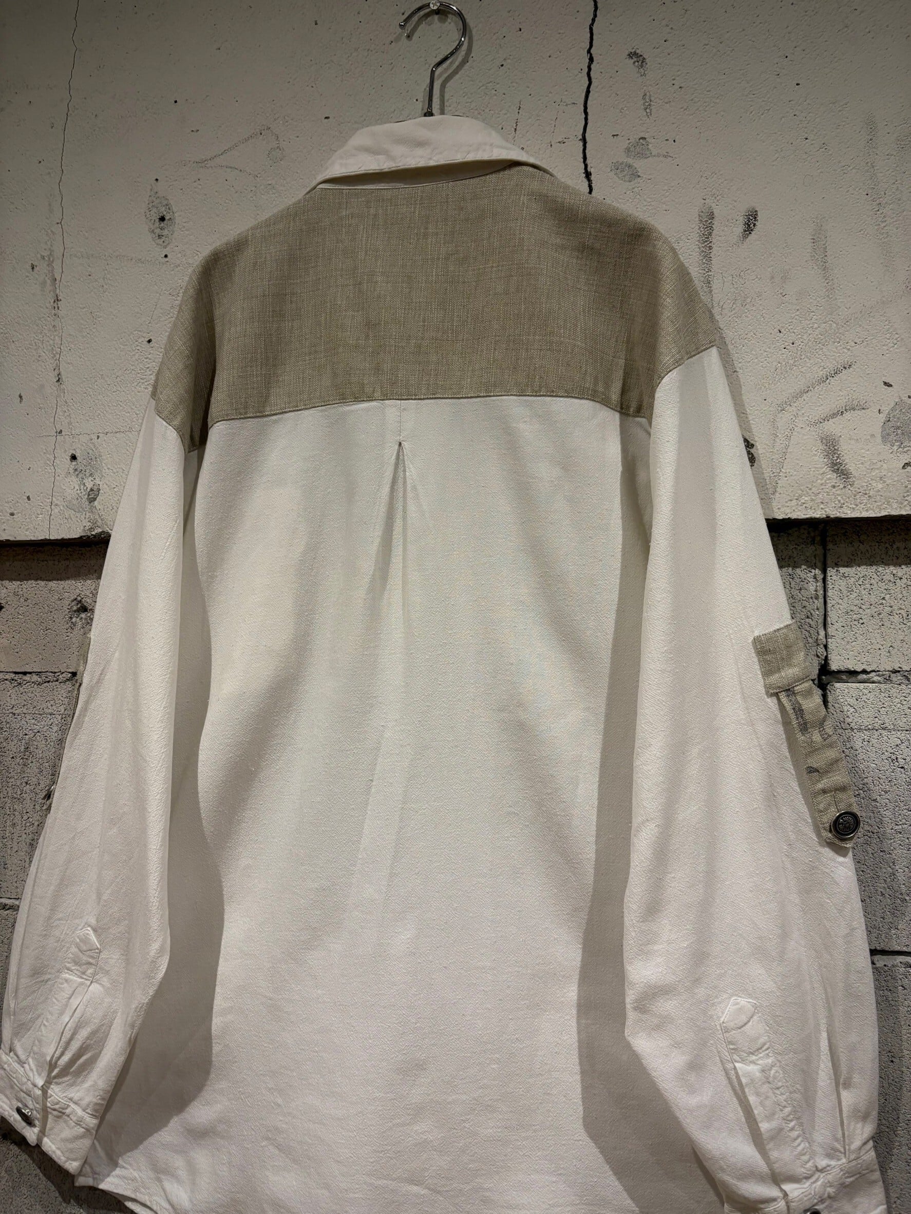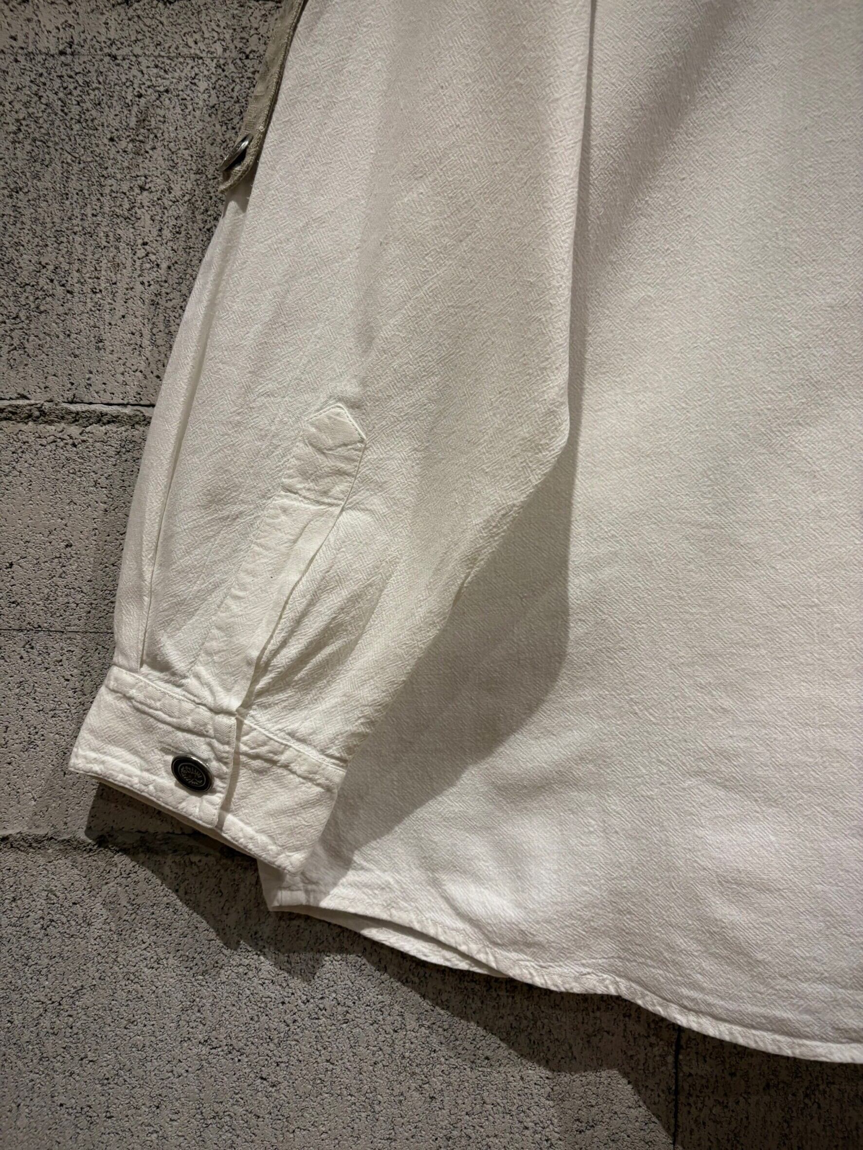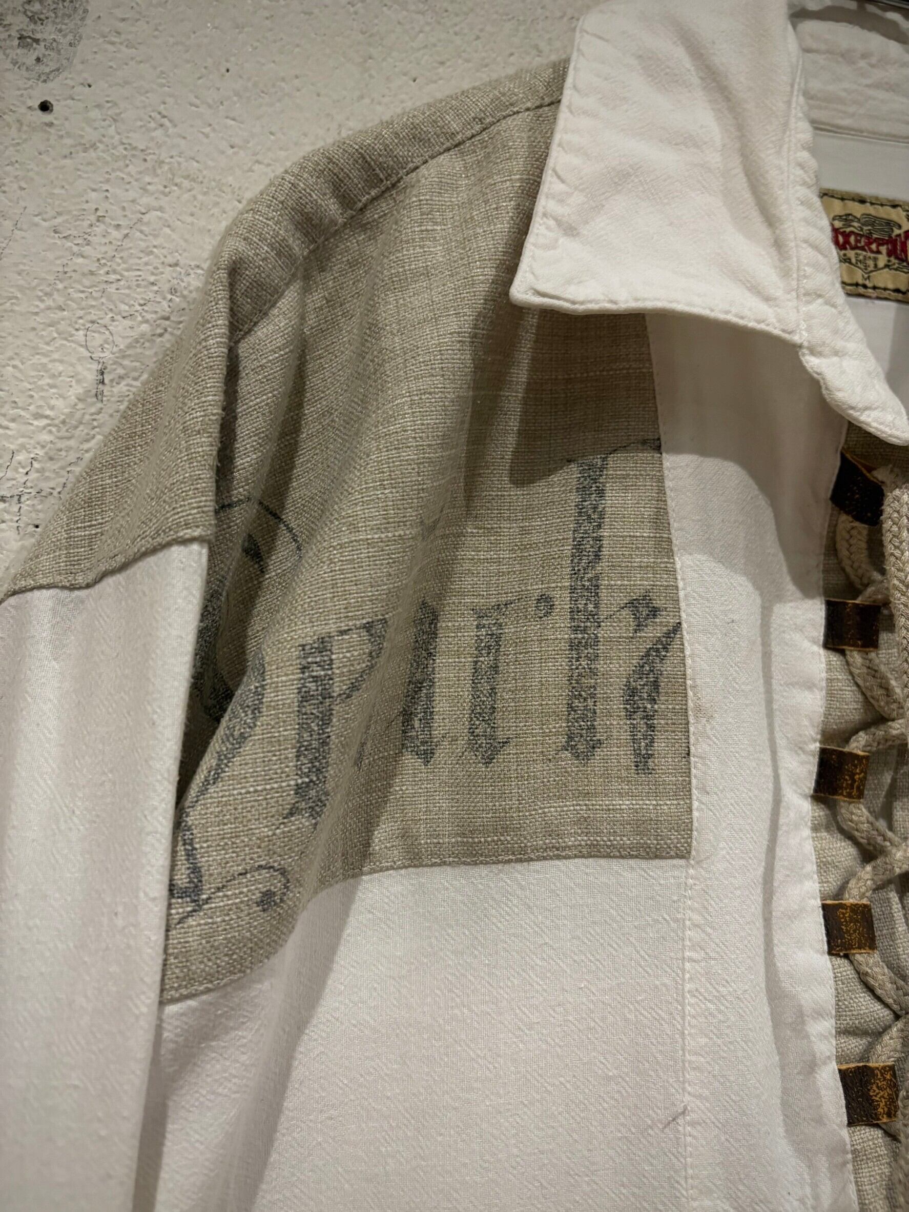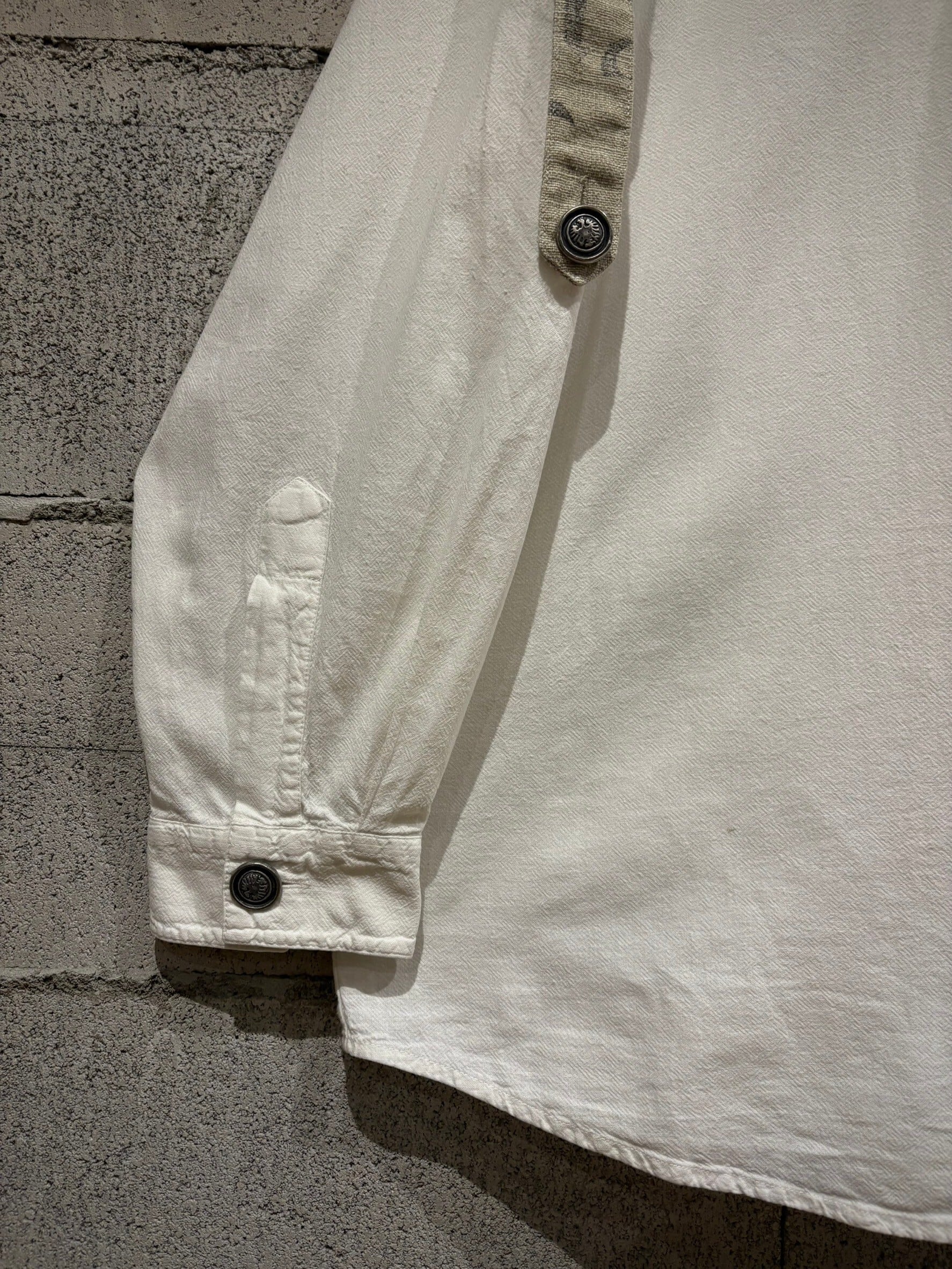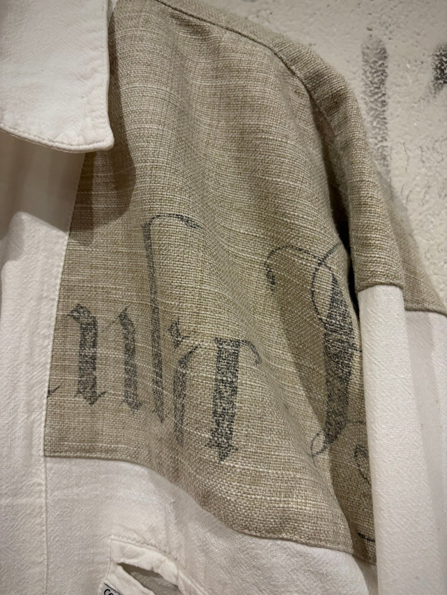 織りで柄模様が表現されたホワイトのボディにリネンの様なドライな質感のベージュ生地を切り替え、ベージュ部分にはレタリング風のデザインをON。そしてポケットやアームにはチロリアンのアイテムで見られるメタルボタン、ループボタンの装飾。