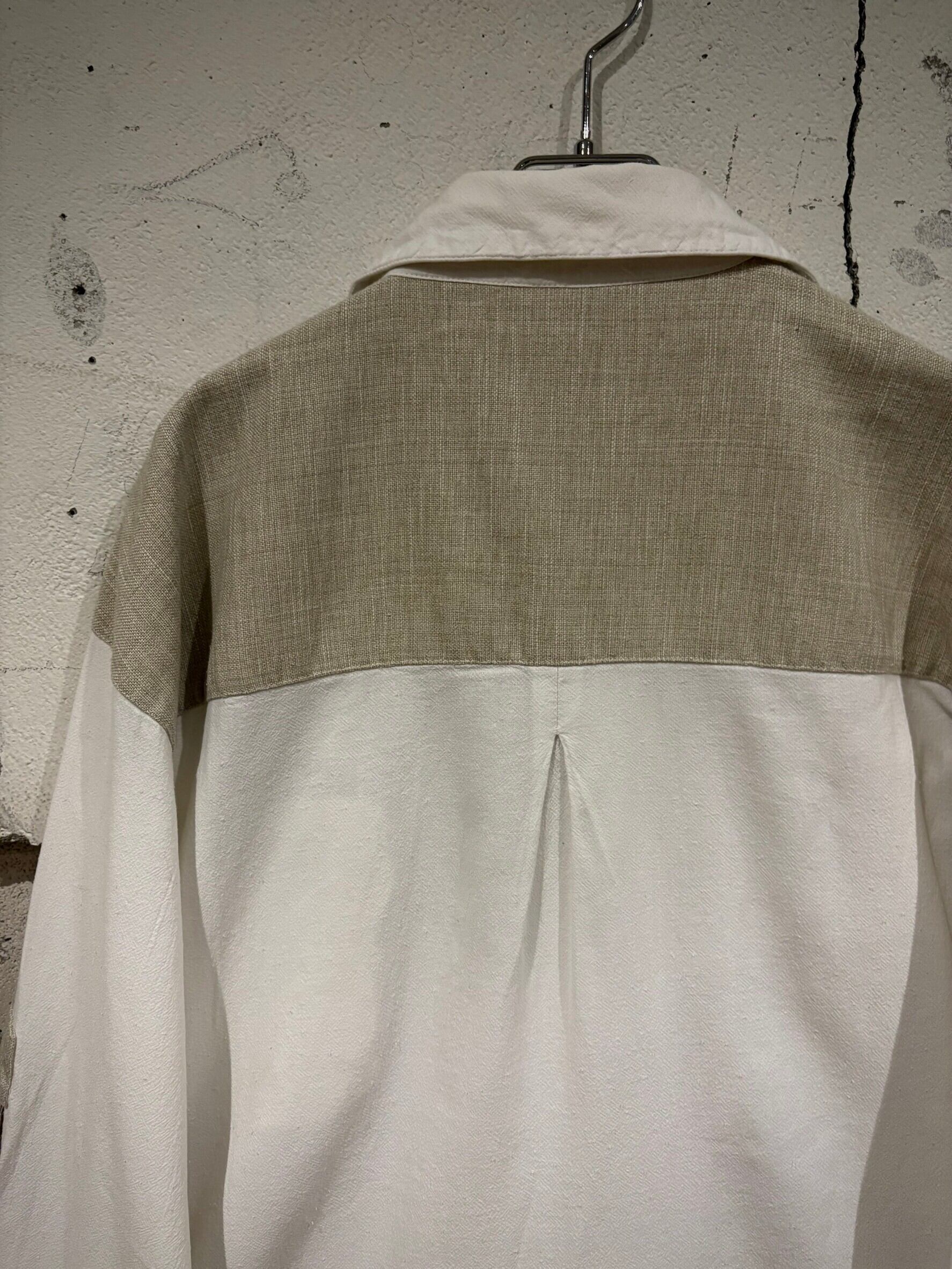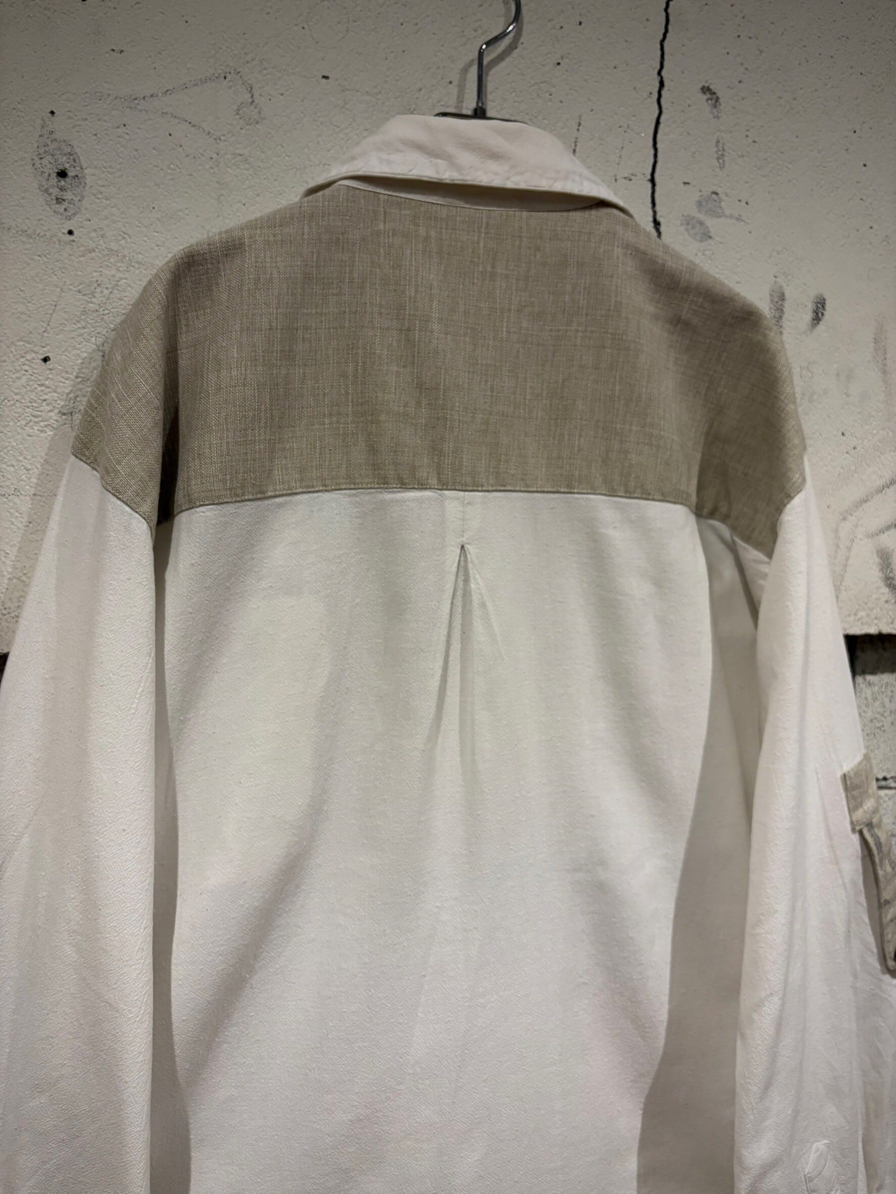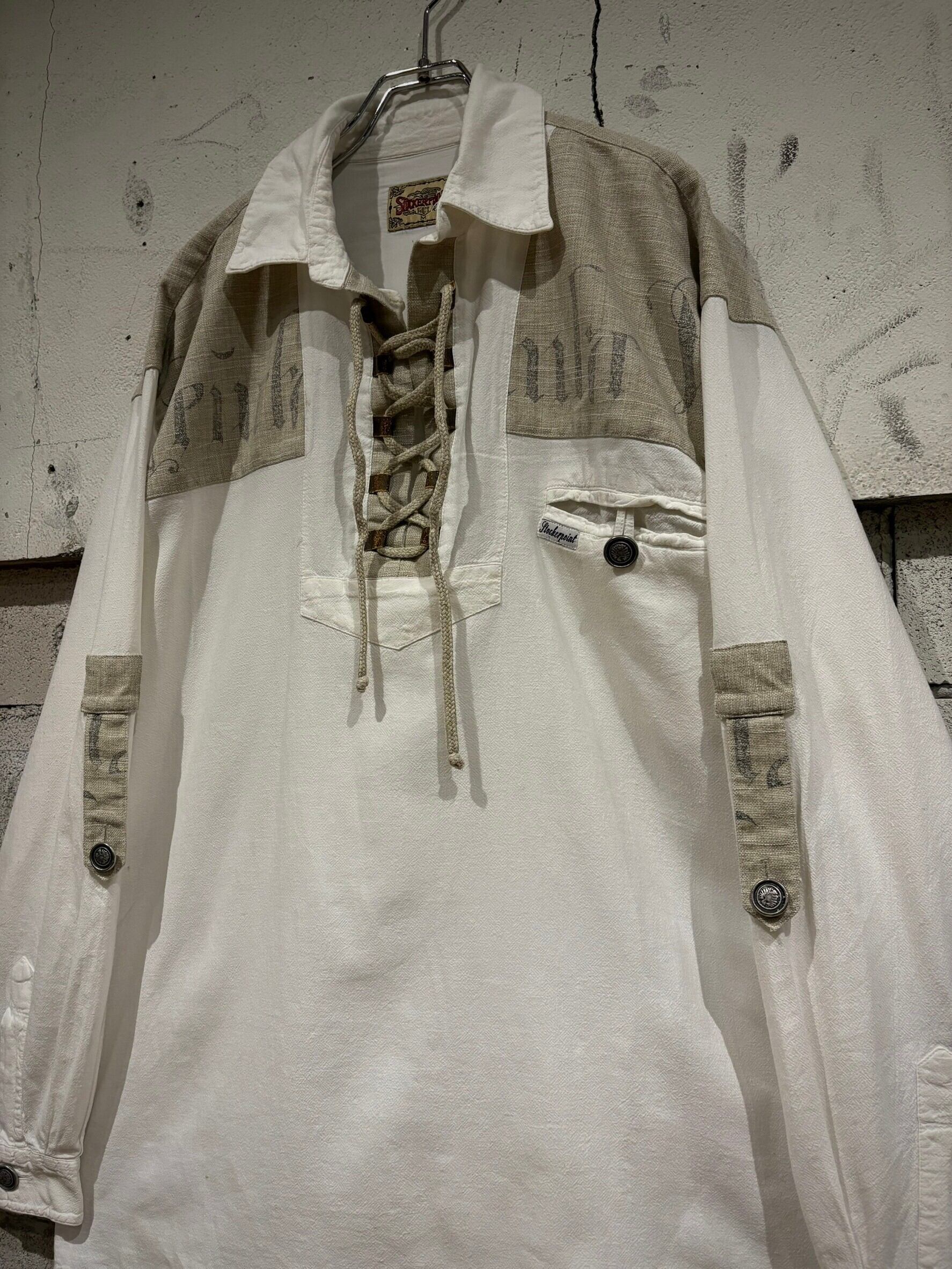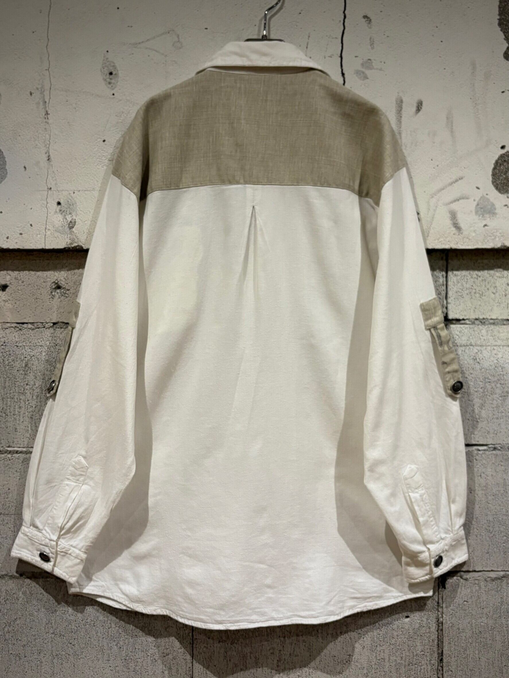 織りで柄模様が表現されたホワイトのボディにリネンの様なドライな質感のベージュ生地を切り替え、ベージュ部分にはレタリング風のデザインをON。そしてポケットやアームにはチロリアンのアイテムで見られるメタルボタン、ループボタンの装飾。