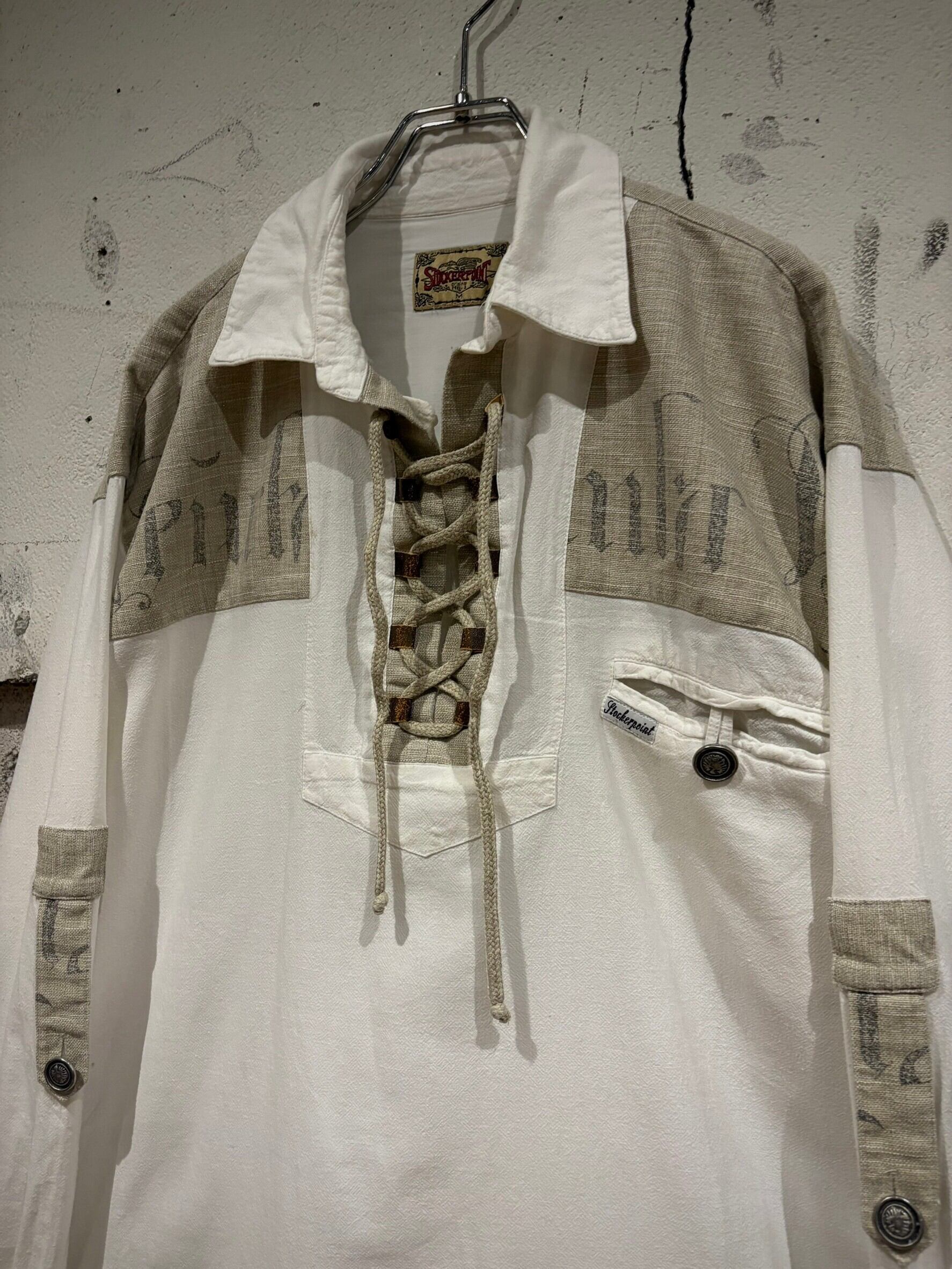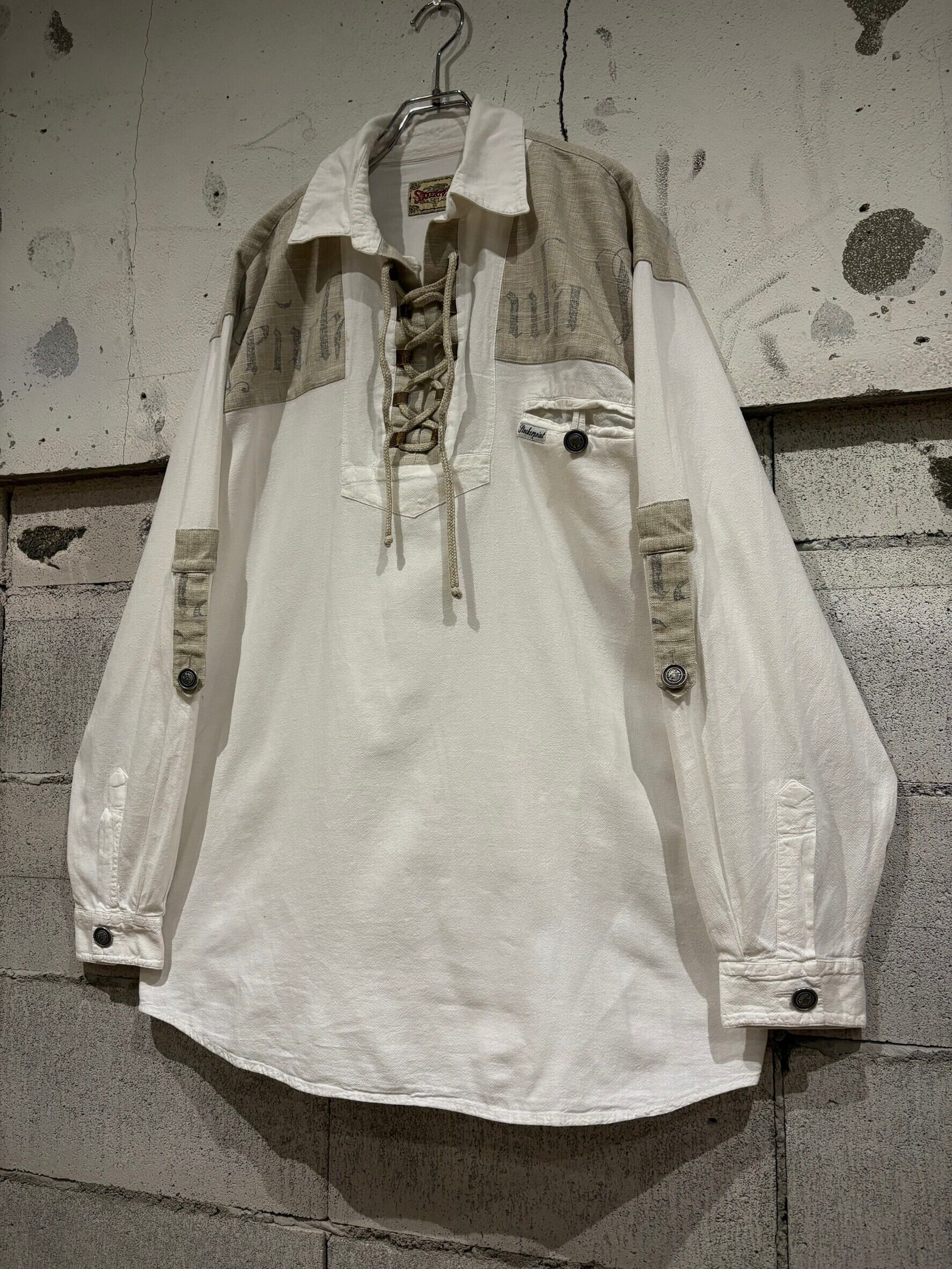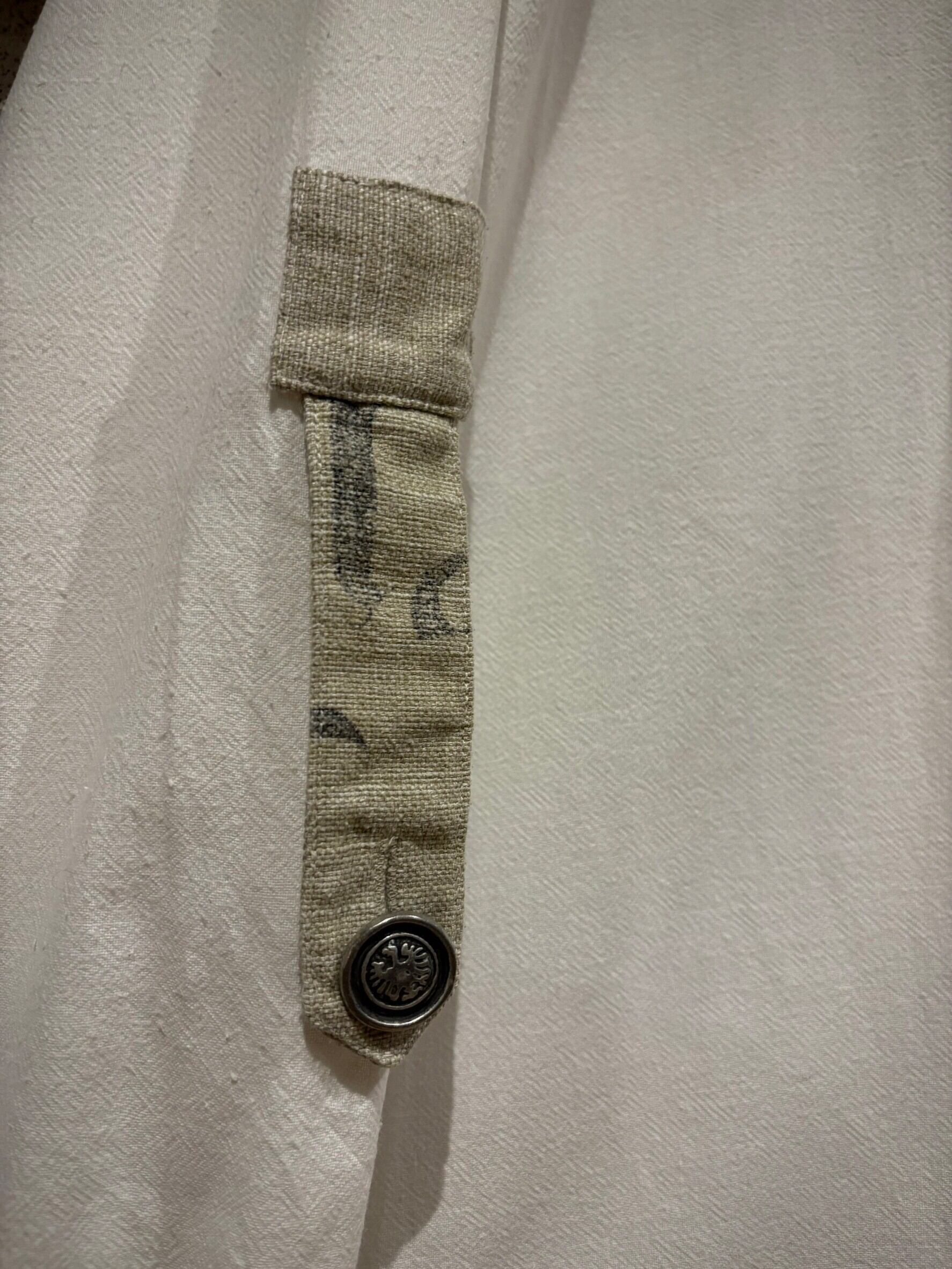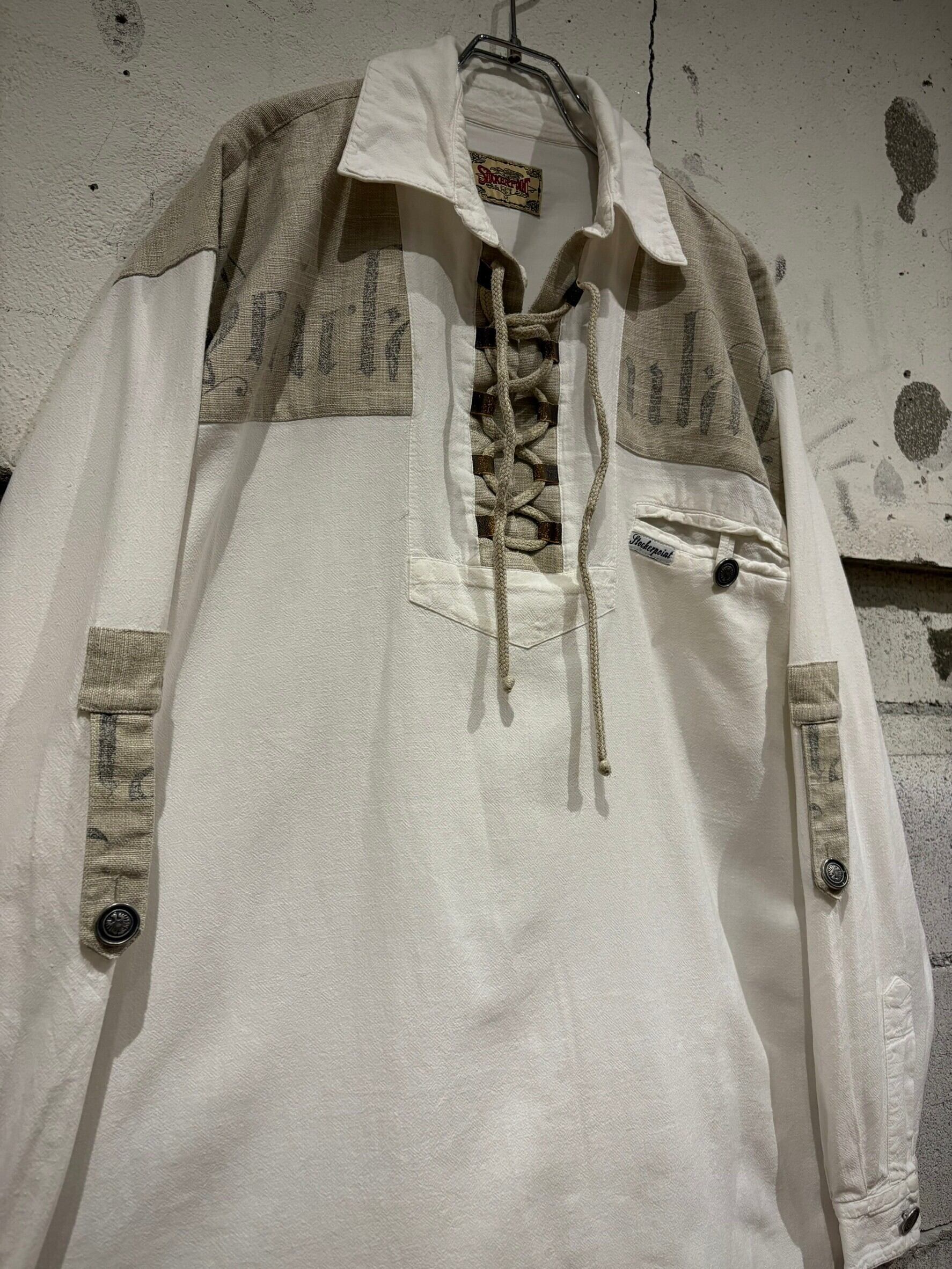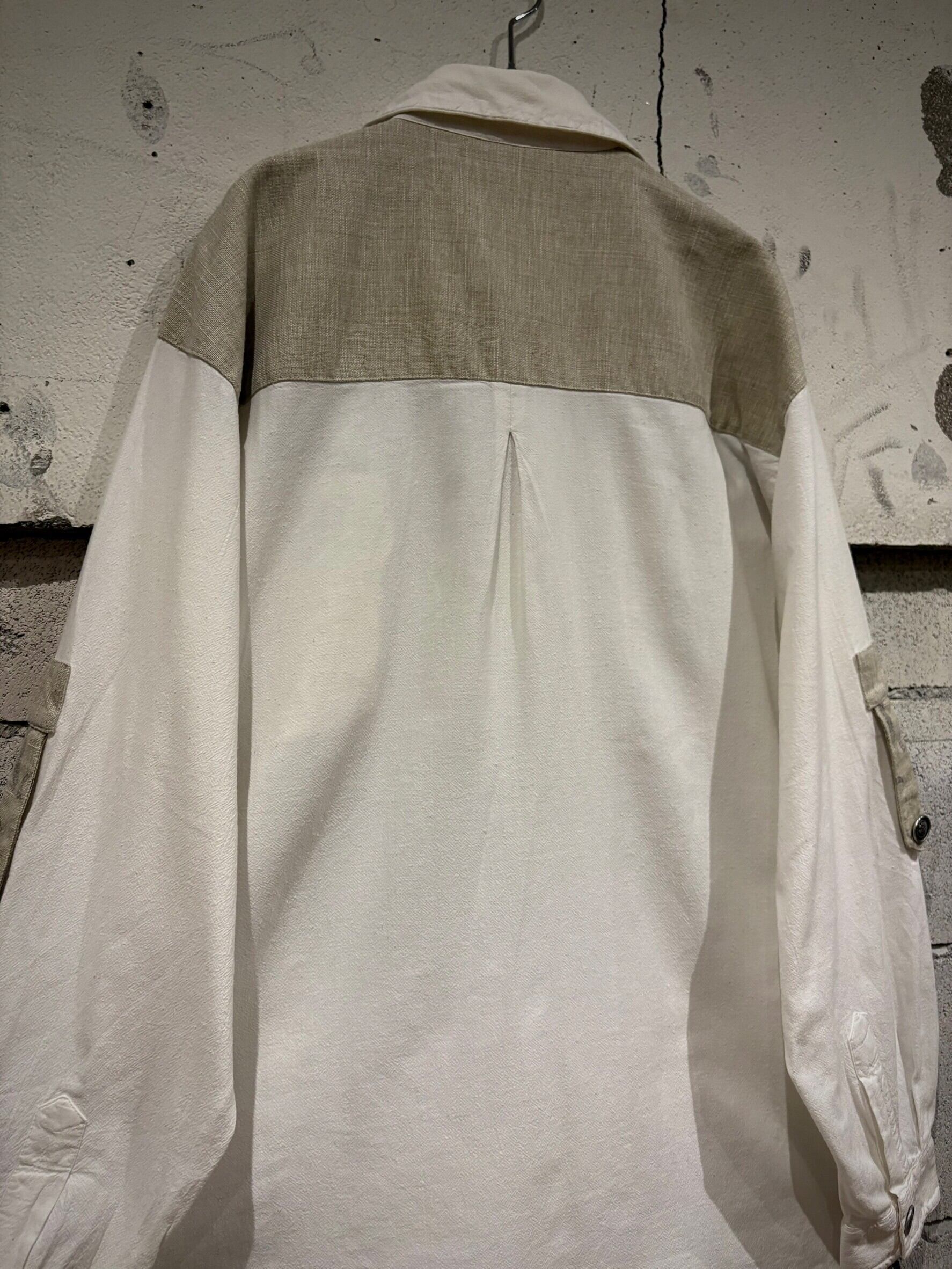 織りで柄模様が表現されたホワイトのボディにリネンの様なドライな質感のベージュ生地を切り替え、ベージュ部分にはレタリング風のデザインをON。そしてポケットやアームにはチロリアンのアイテムで見られるメタルボタン、ループボタンの装飾。