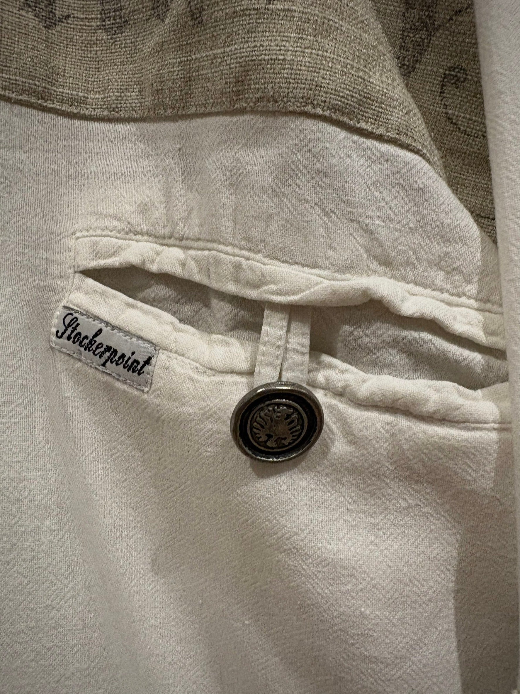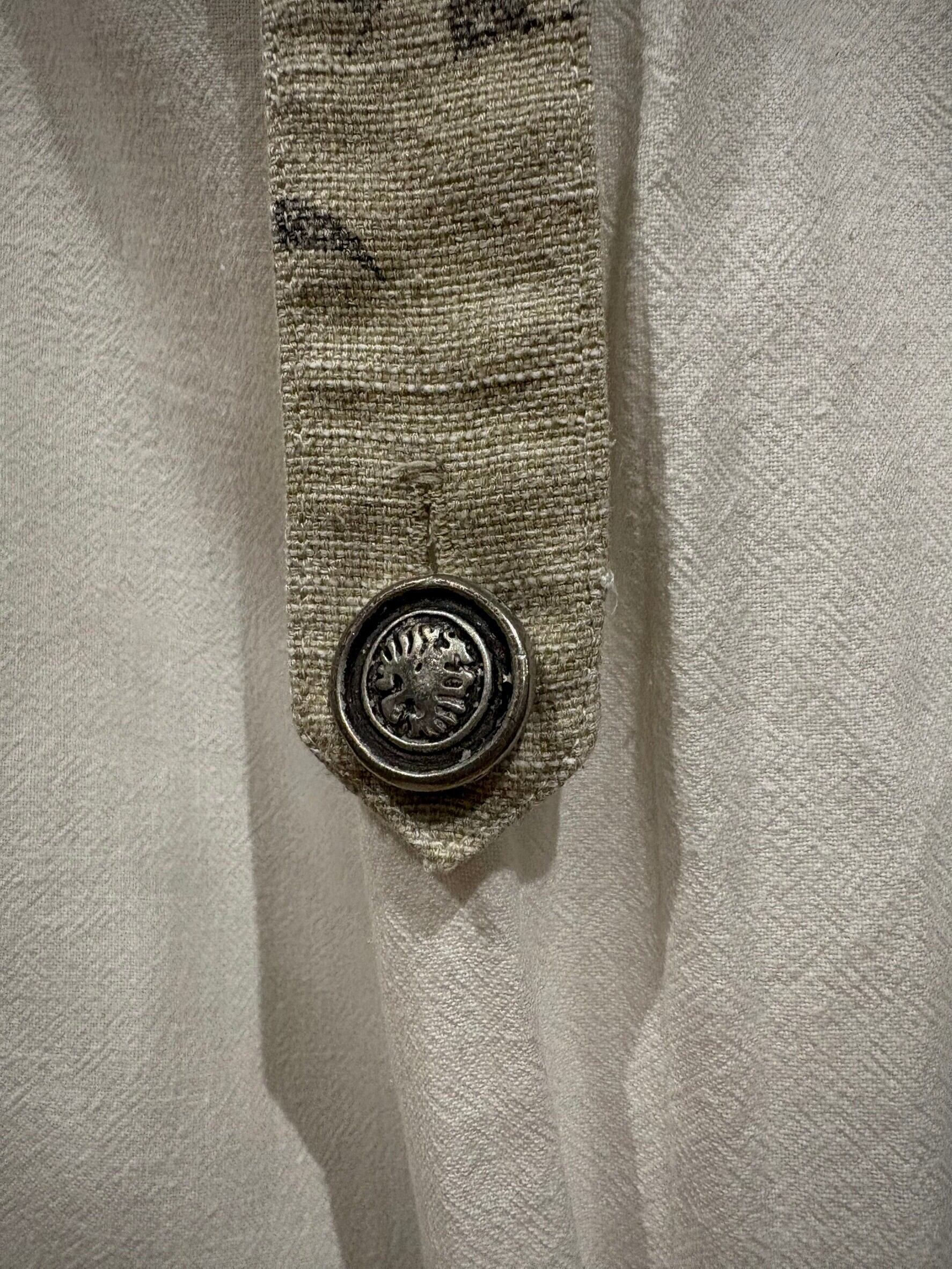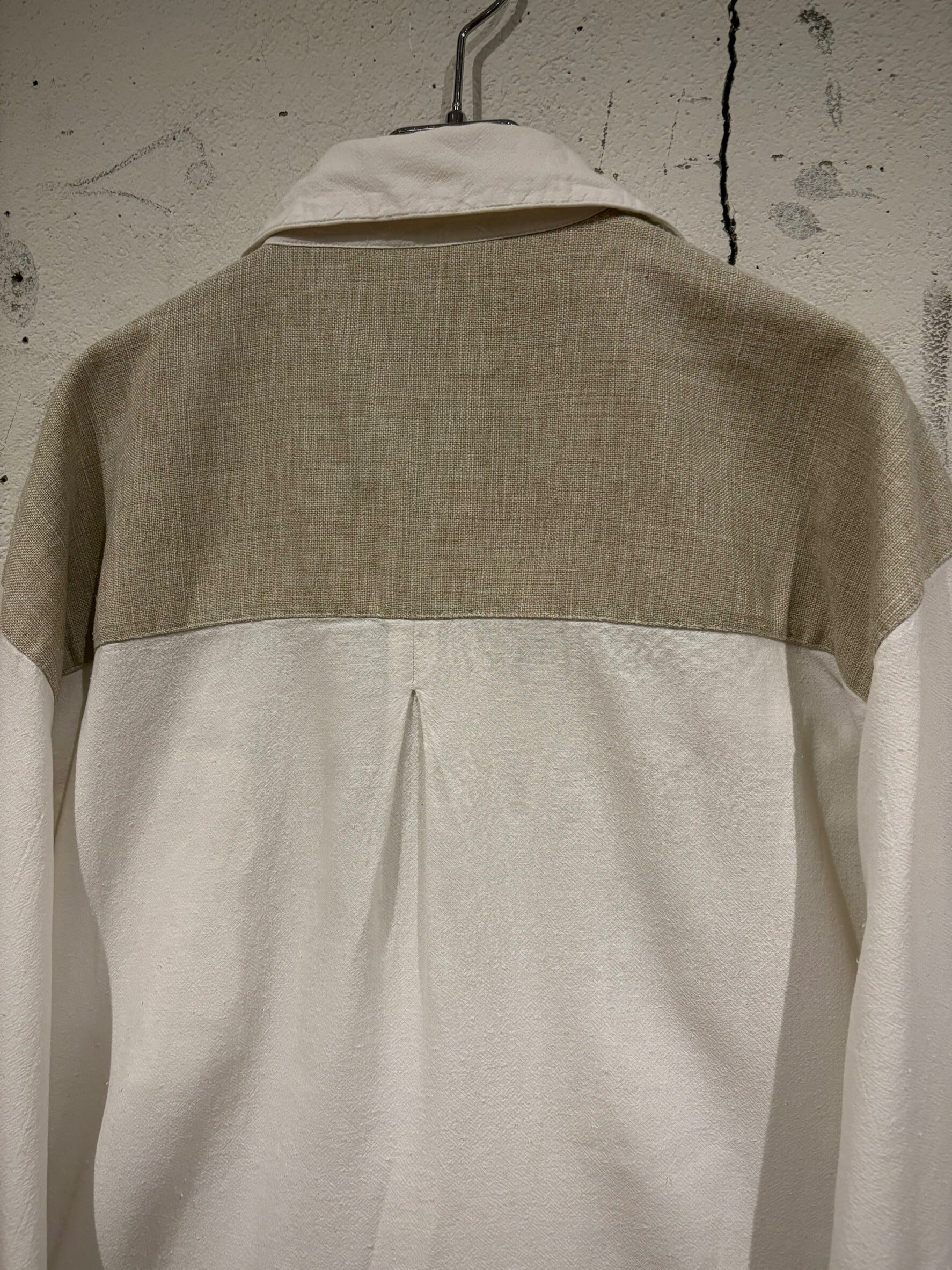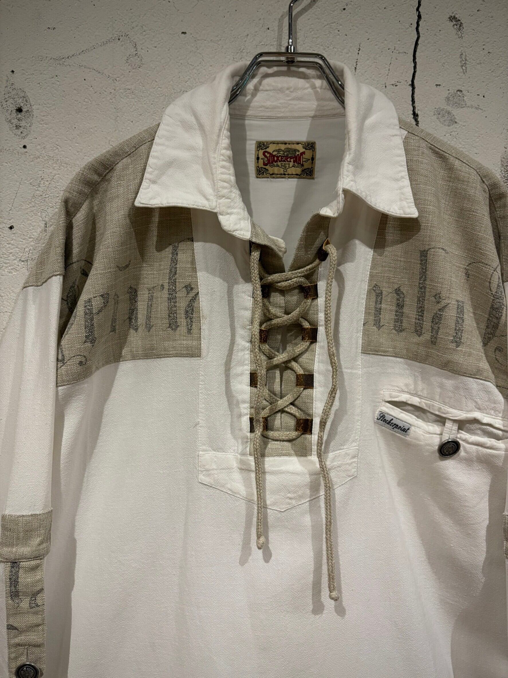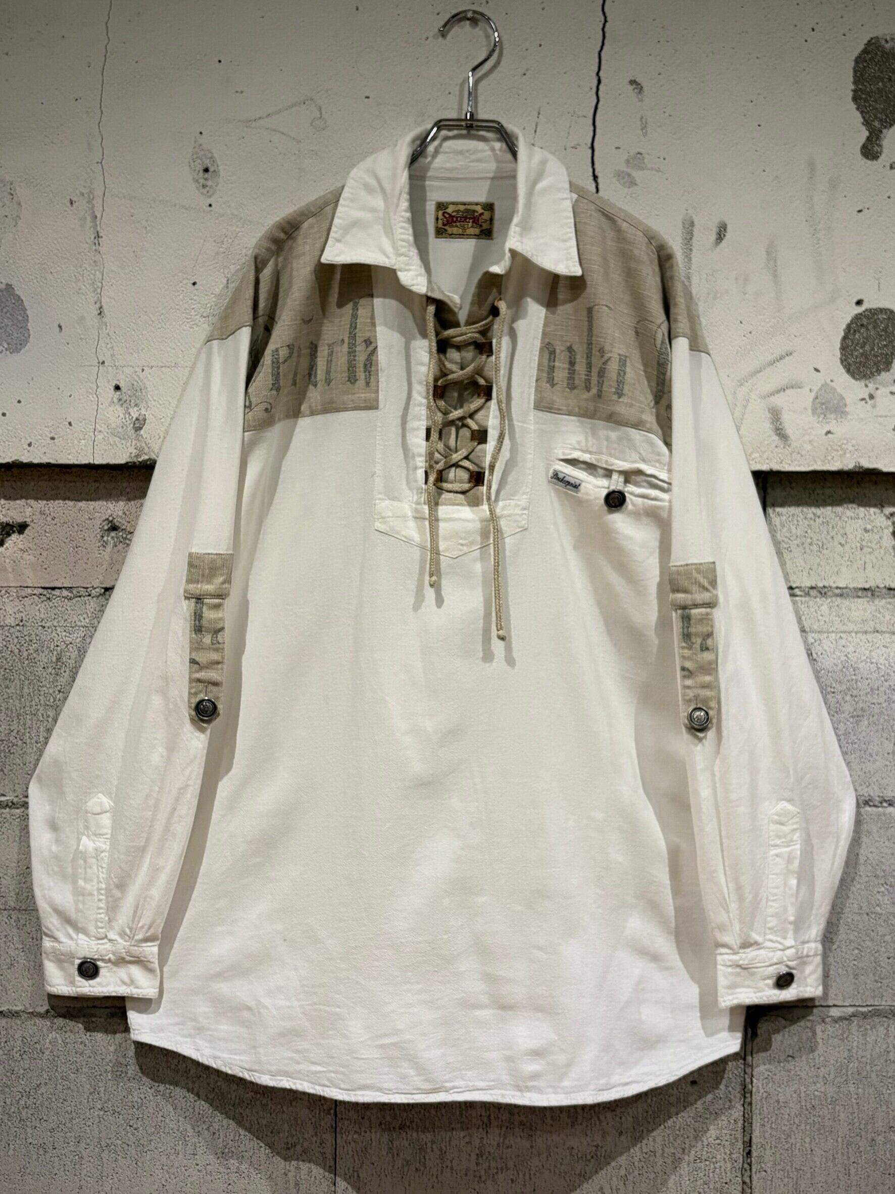 織りで柄模様が表現されたホワイトのボディにリネンの様なドライな質感のベージュ生地を切り替え、ベージュ部分にはレタリング風のデザインをON。そしてポケットやアームにはチロリアンのアイテムで見られるメタルボタン、ループボタンの装飾。