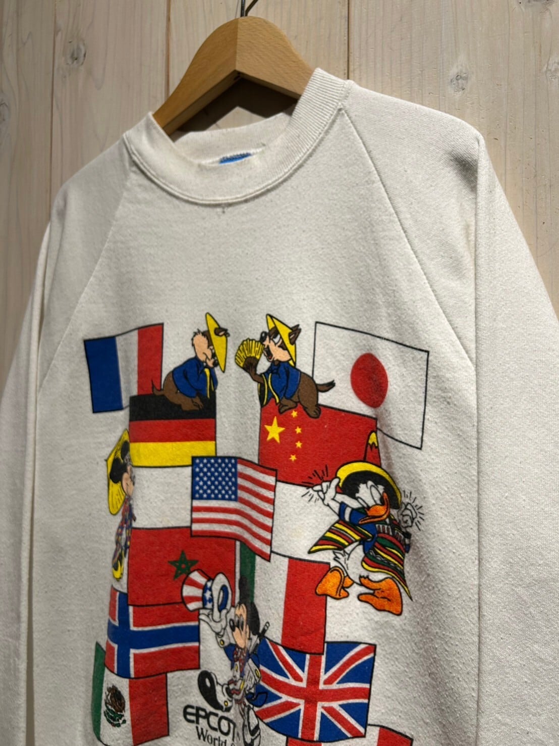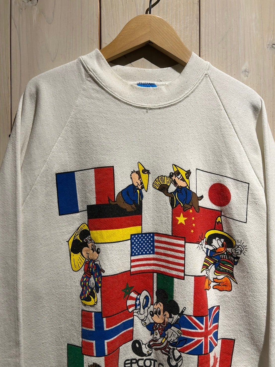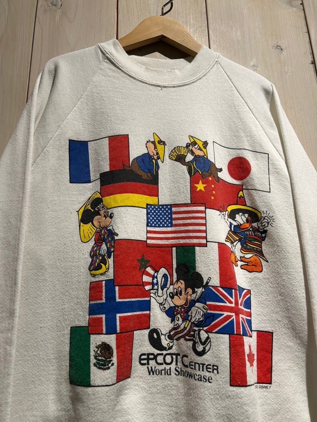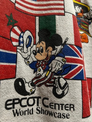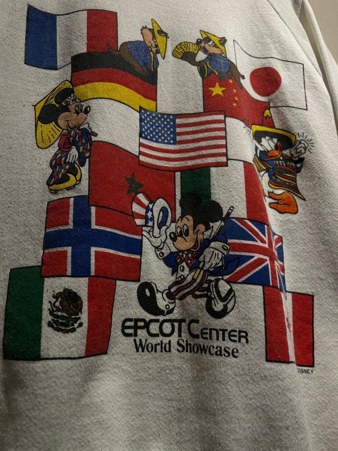 エプコットの中でもパークの中央にある湖の奥側にある世界文化をテーマにしたエリア"World Showcase"のスウェットで、体験できる国々の国旗にミッキー&ミニー、ドナルドダック、チップ&デールのプリントが載せられています。