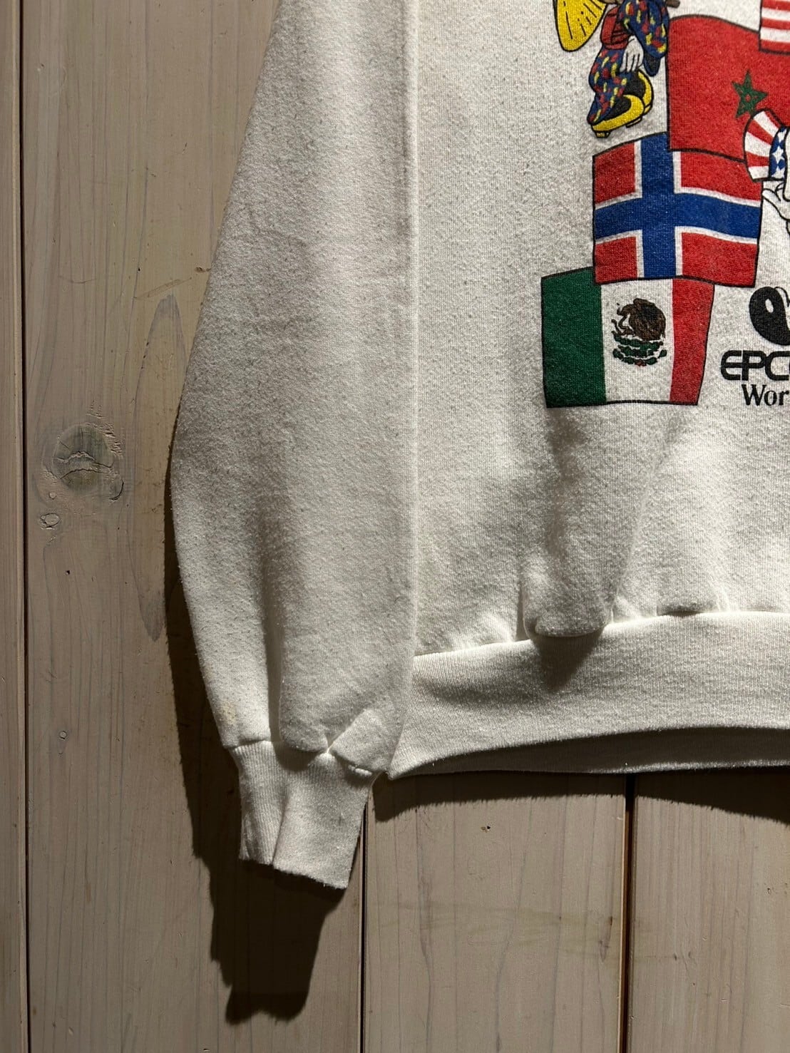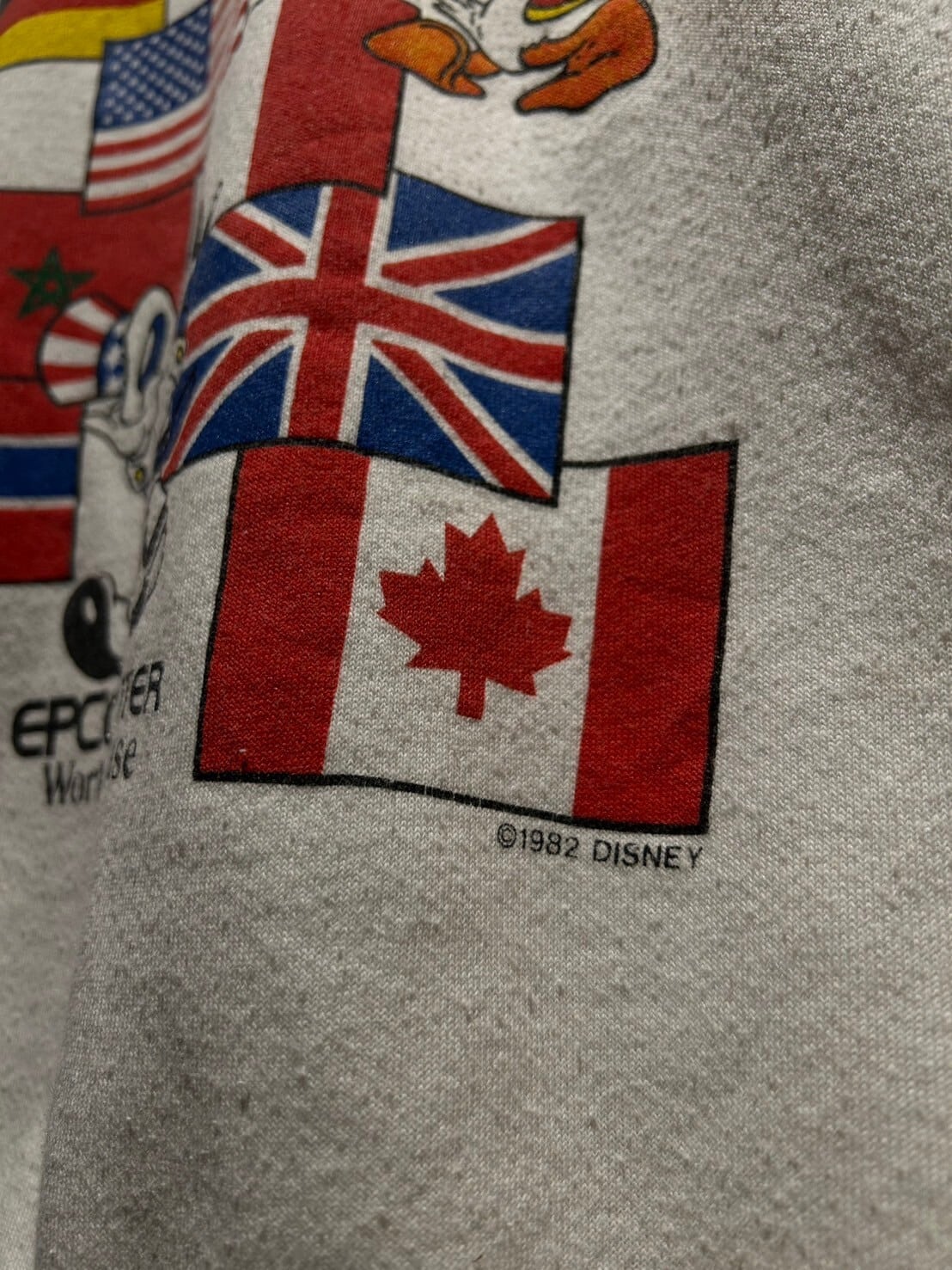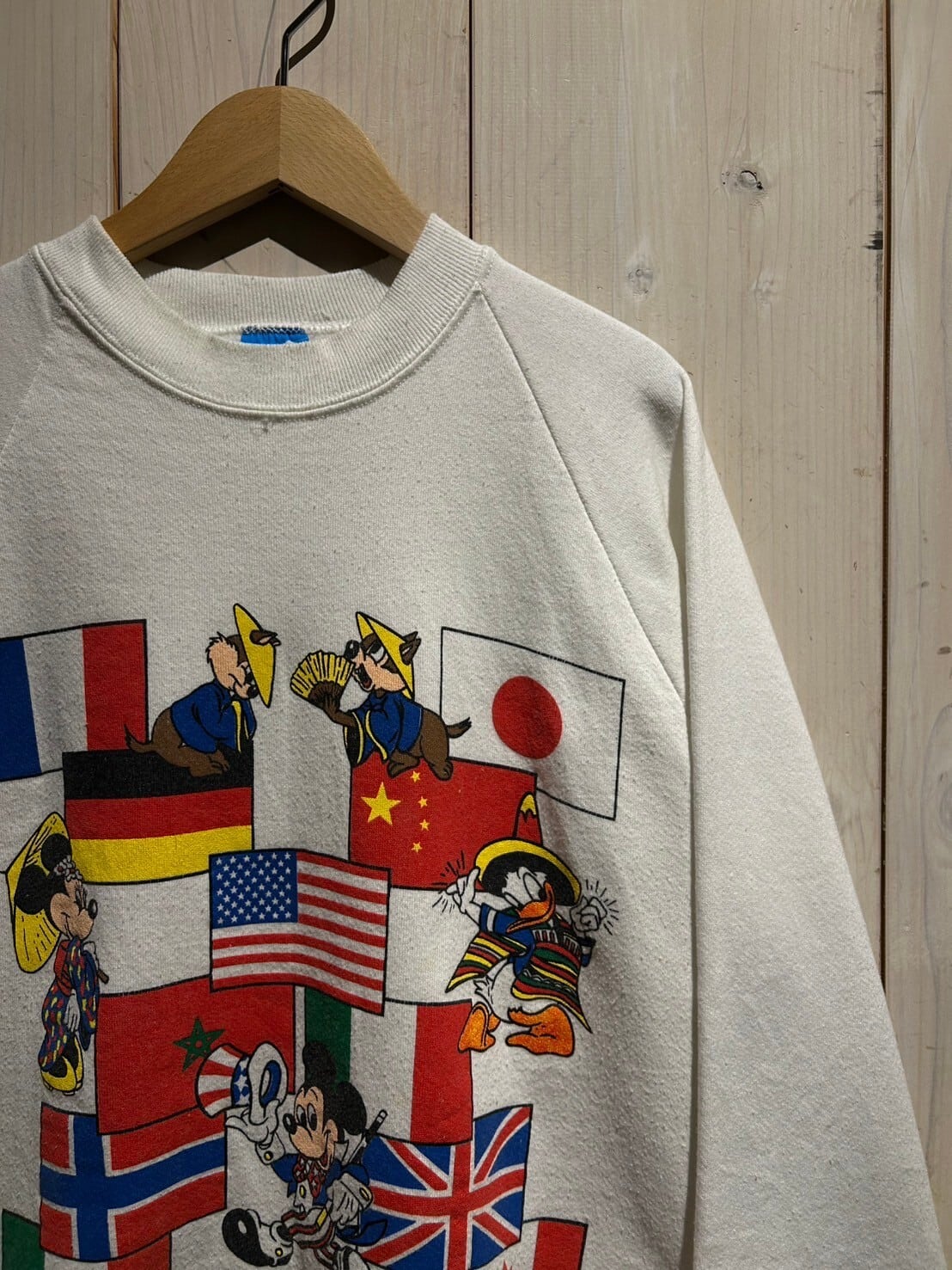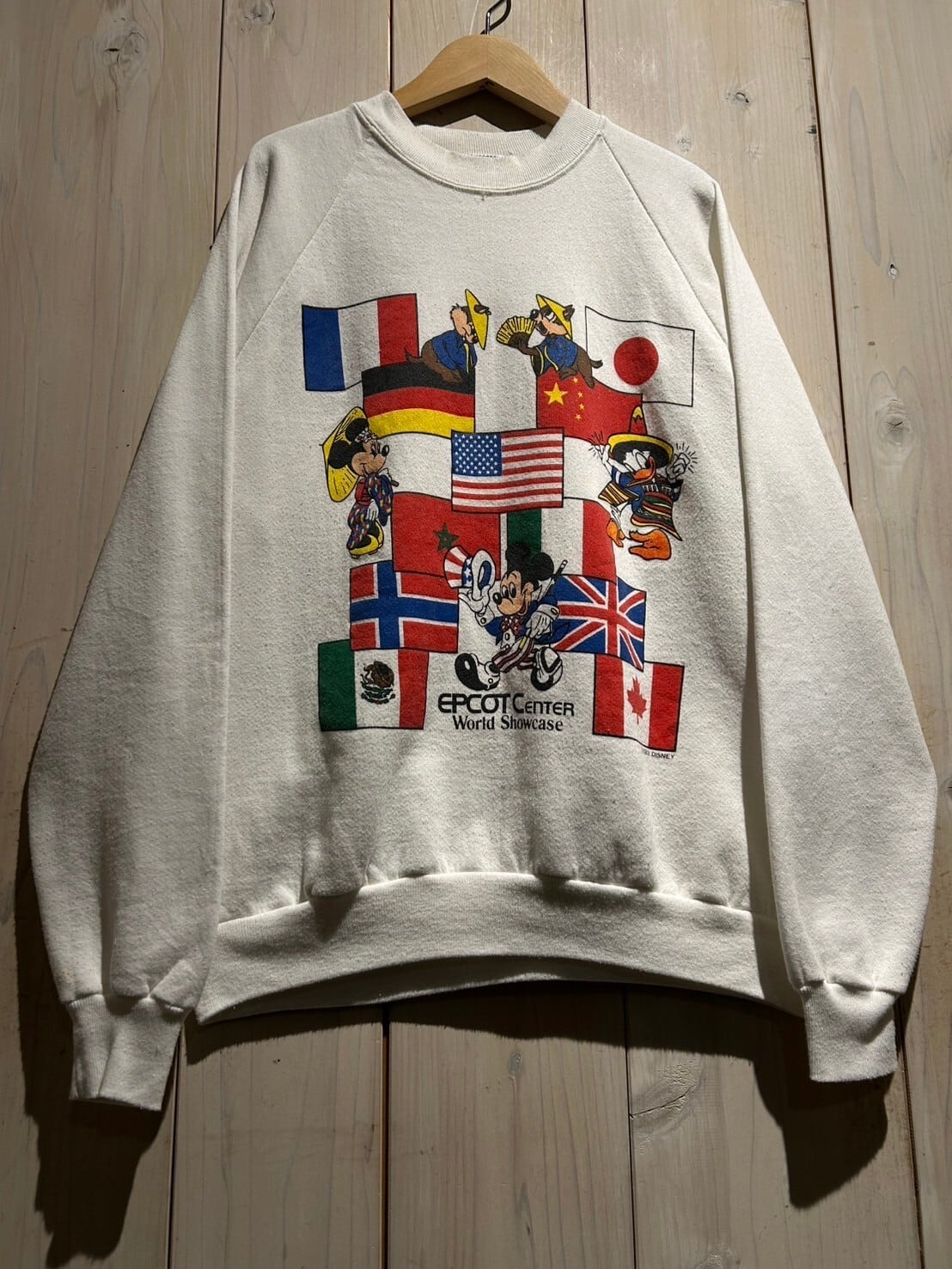 エプコットの中でもパークの中央にある湖の奥側にある世界文化をテーマにしたエリア"World Showcase"のスウェットで、体験できる国々の国旗にミッキー&ミニー、ドナルドダック、チップ&デールのプリントが載せられています。