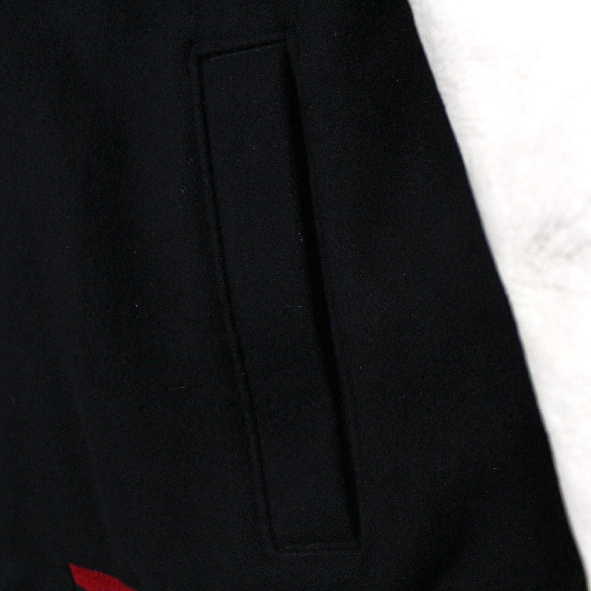 ギュッと目の詰まったブラックのウールを用いたボディに、アームにはレザーを切り替えたスタジャン。