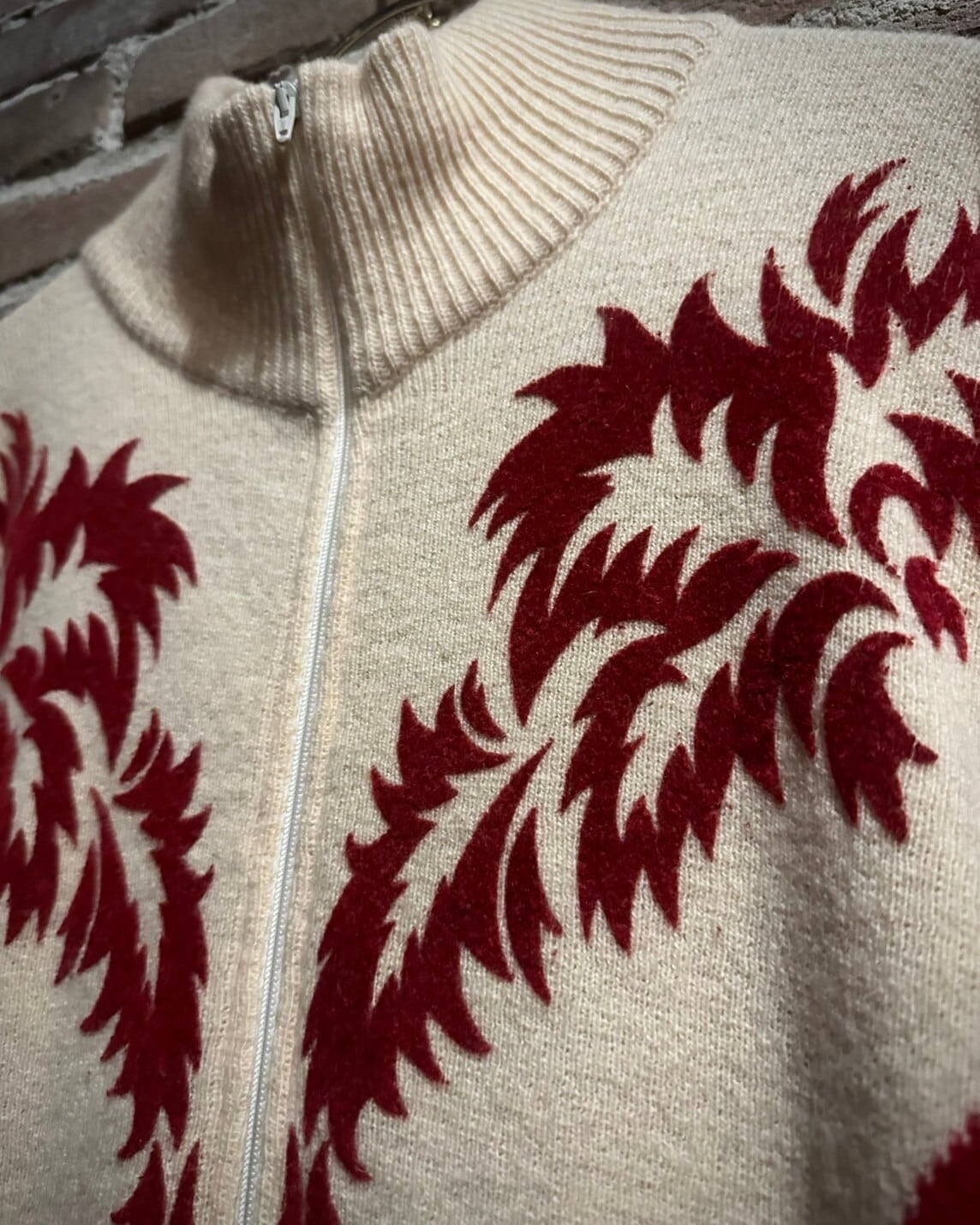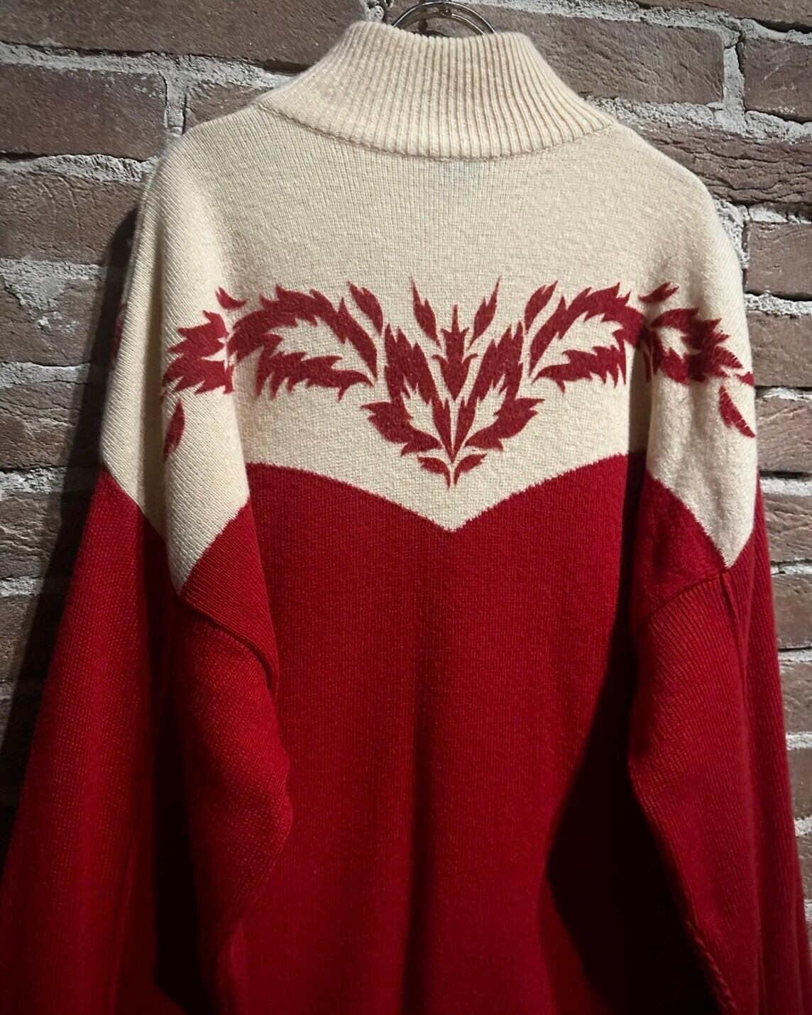 パキッとした赤、白をウエスタンヨークで切り替えたボディに、ウエスタン調のデザインをフロッキープリントで載せたハーフジップニット。