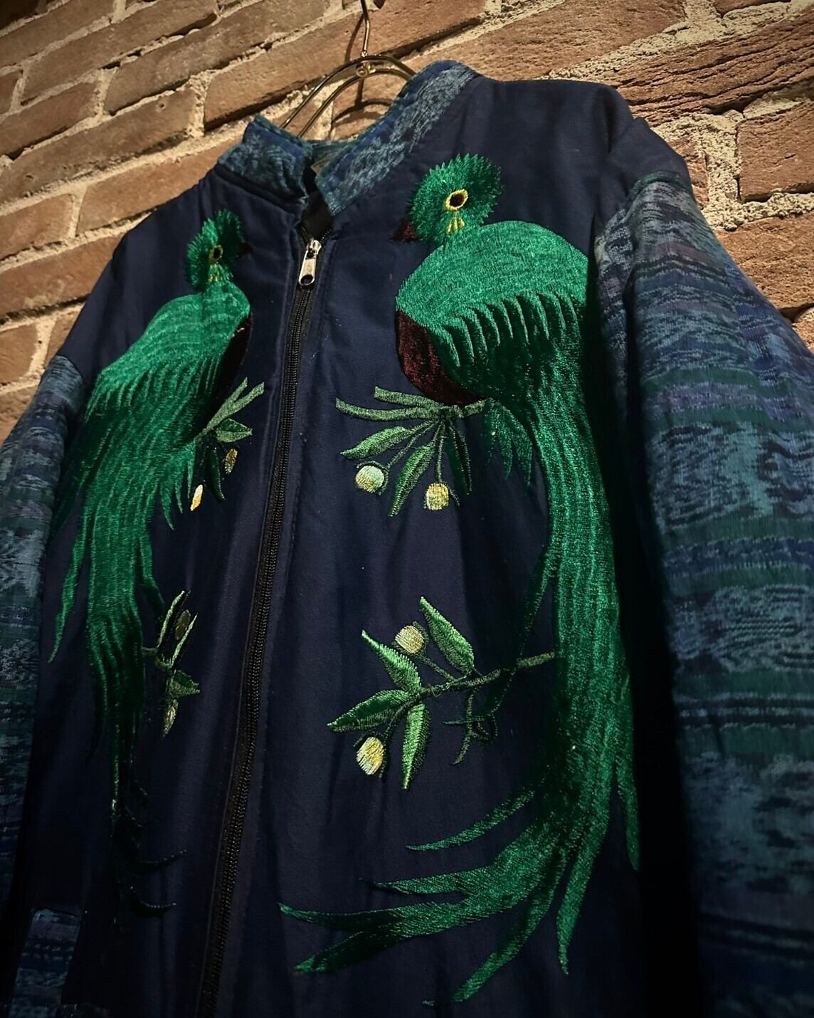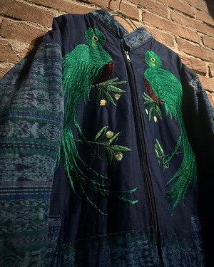 グアテマラ地方の伝統的な織を用いたボディに、フロントには緻密な刺繍で尾の長い美しい鳥をを刻んだグアテマラジャケット。