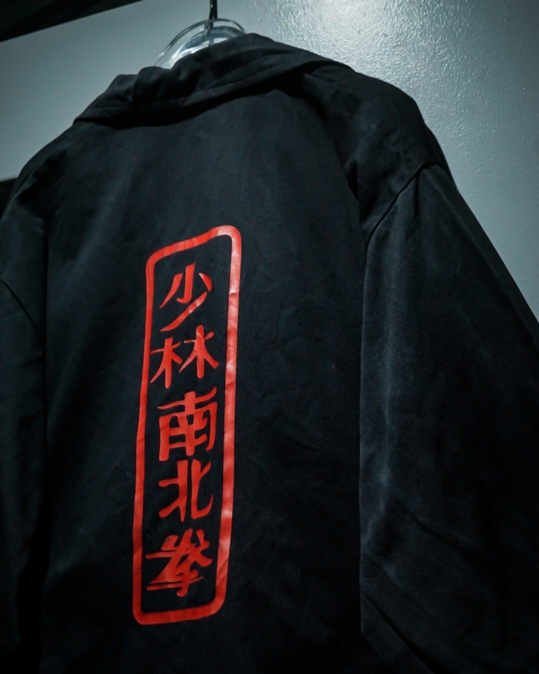 イギリスのウェールズで作られたこちらのシャツ。皆様ご存知、蹴り技を主体としたダイナミックで素早い動作が特徴であるあの"少林南北拳"がバックにデカデカとプリント。希少なブラックスモックにふざけたこのプリントと刺繍が最高にギークな1着。たまりません。