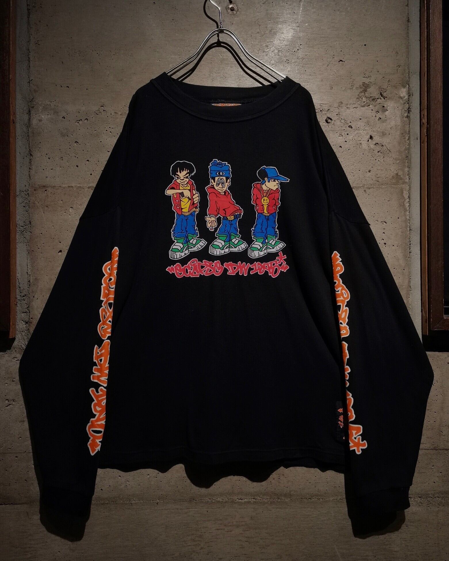 ブラックのボディに、フロントにB-Boy3人組をプリントによって載せたロンティー。