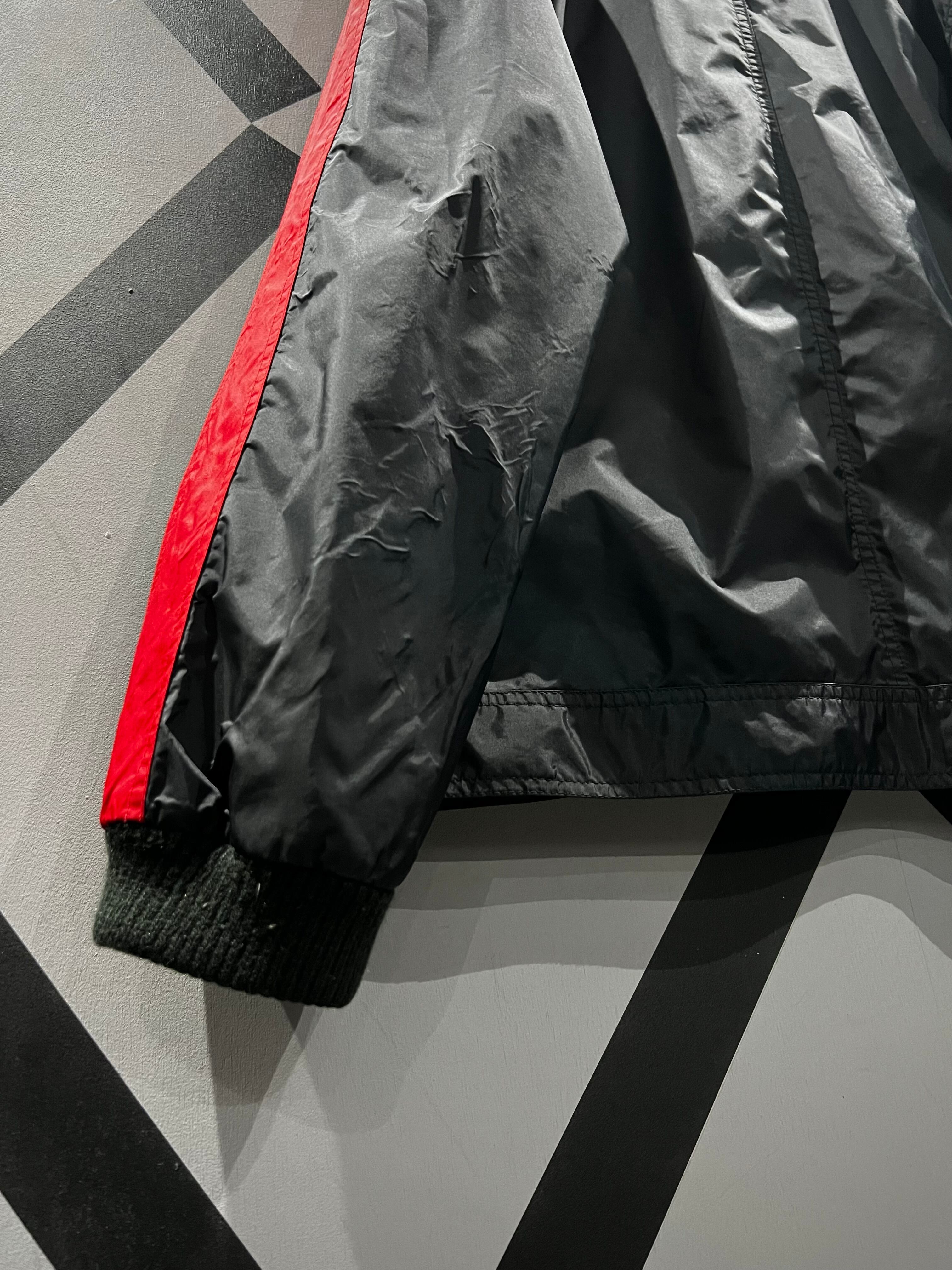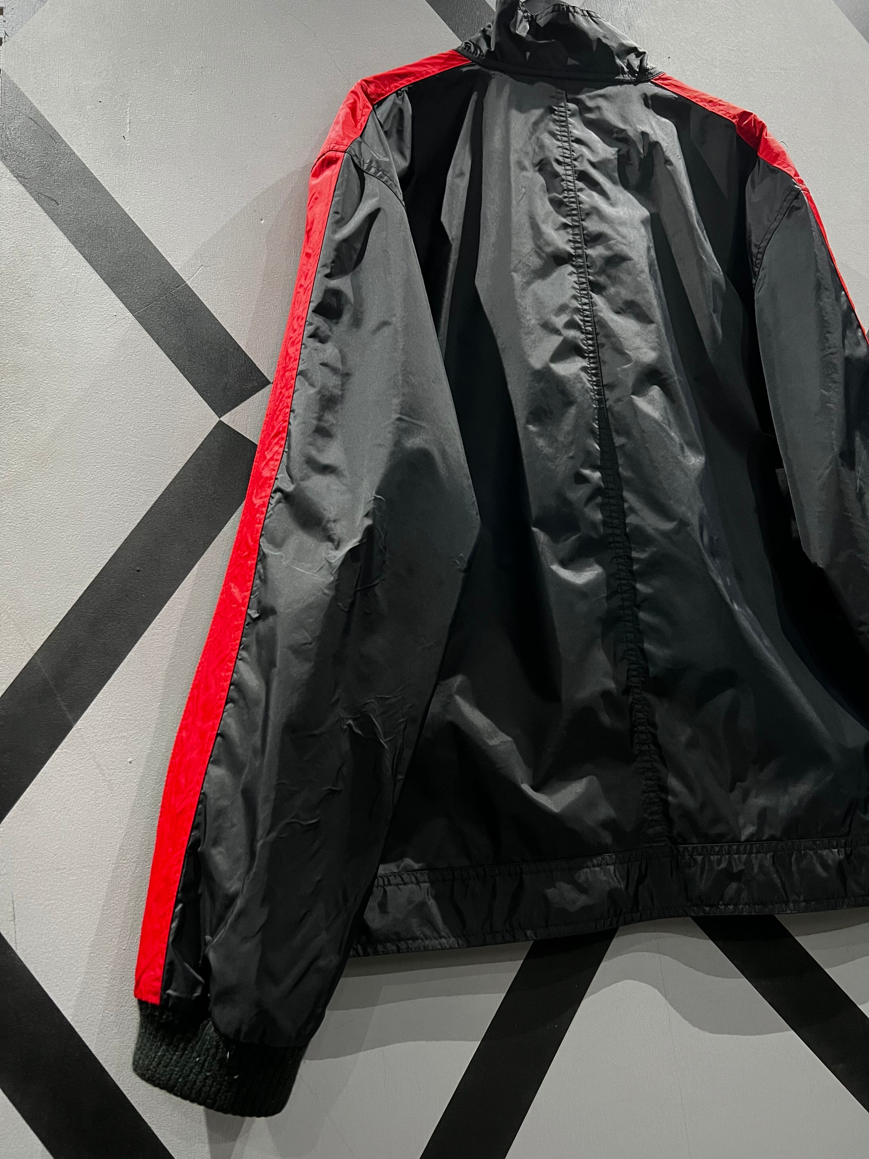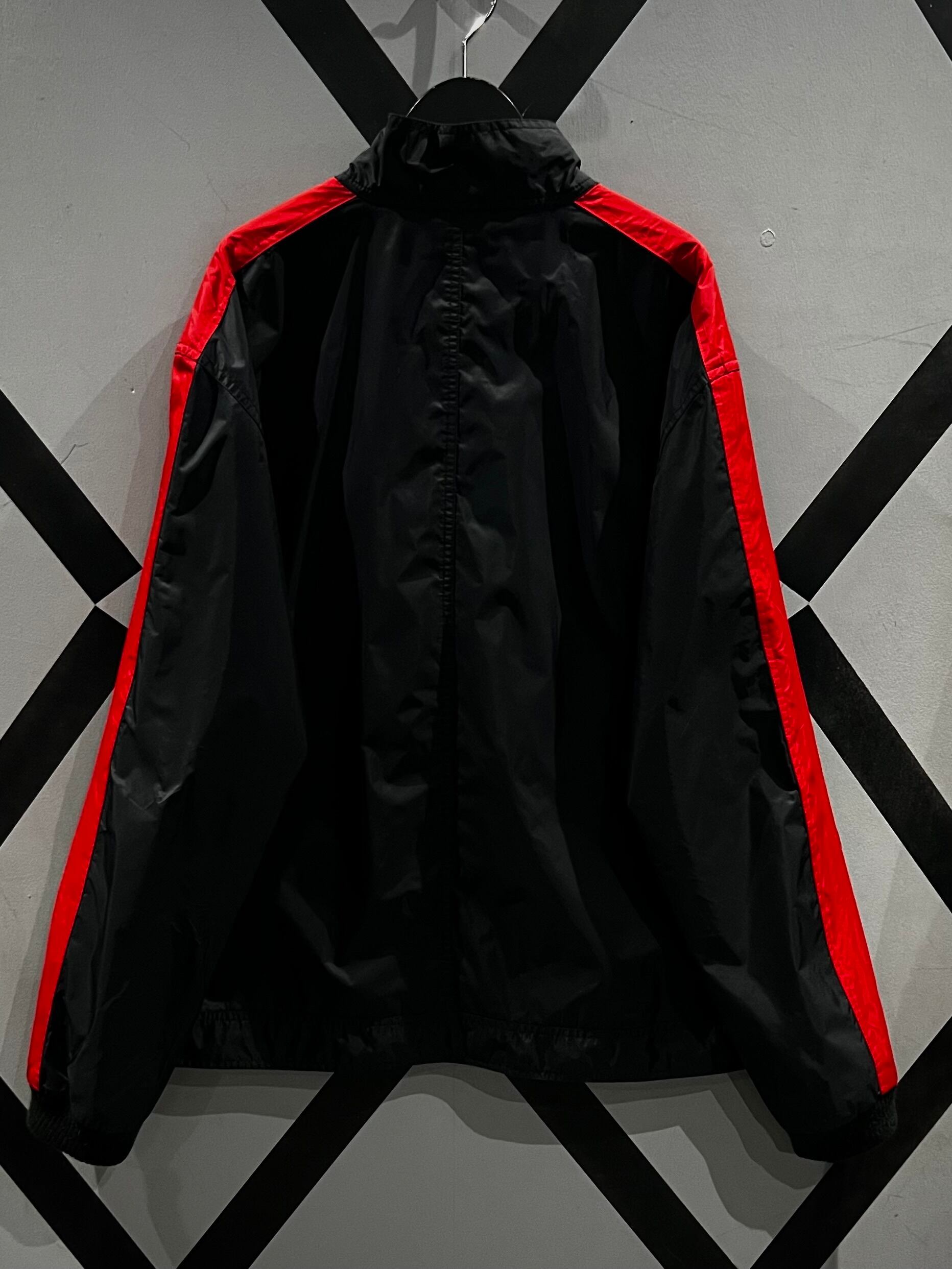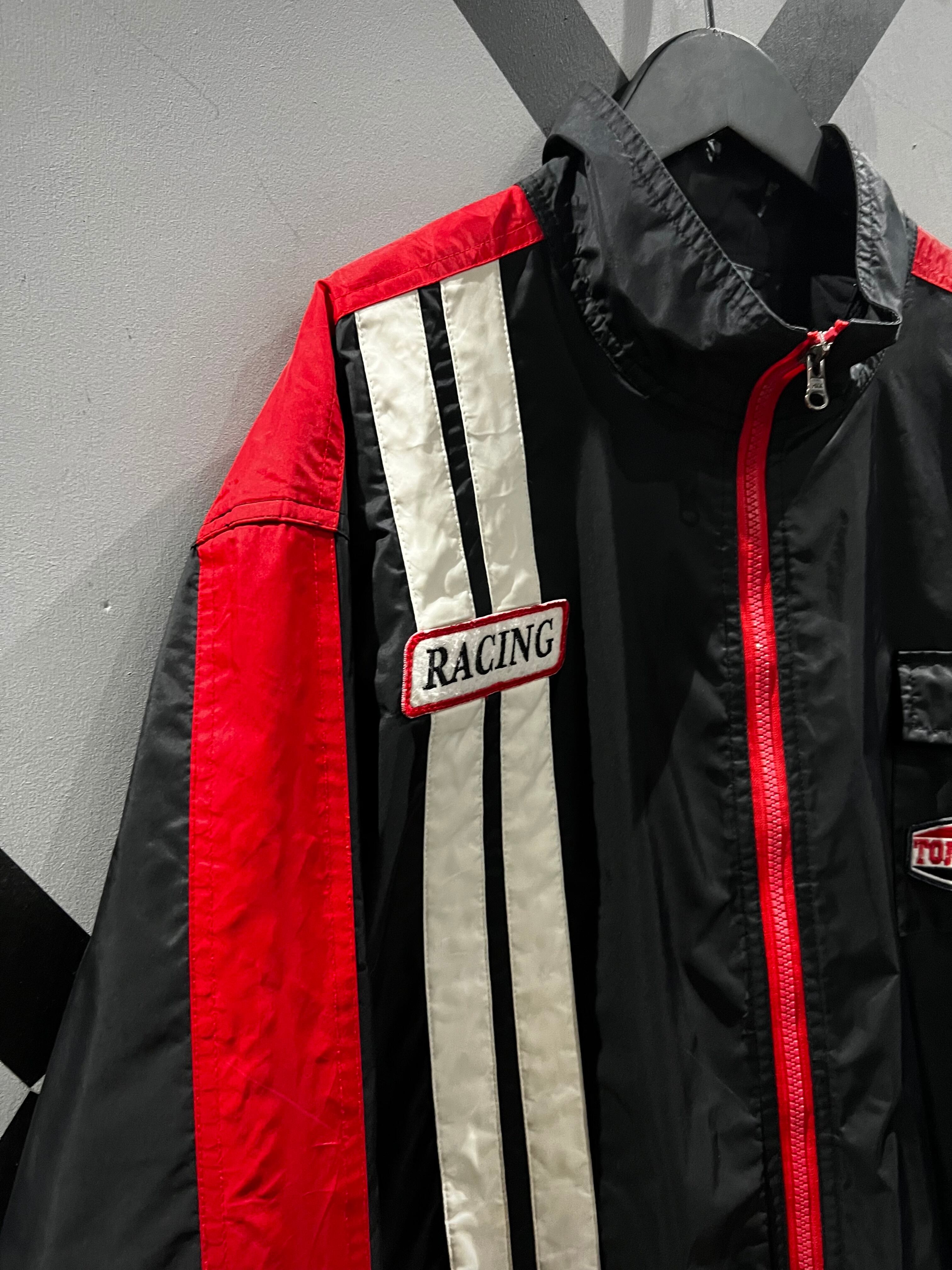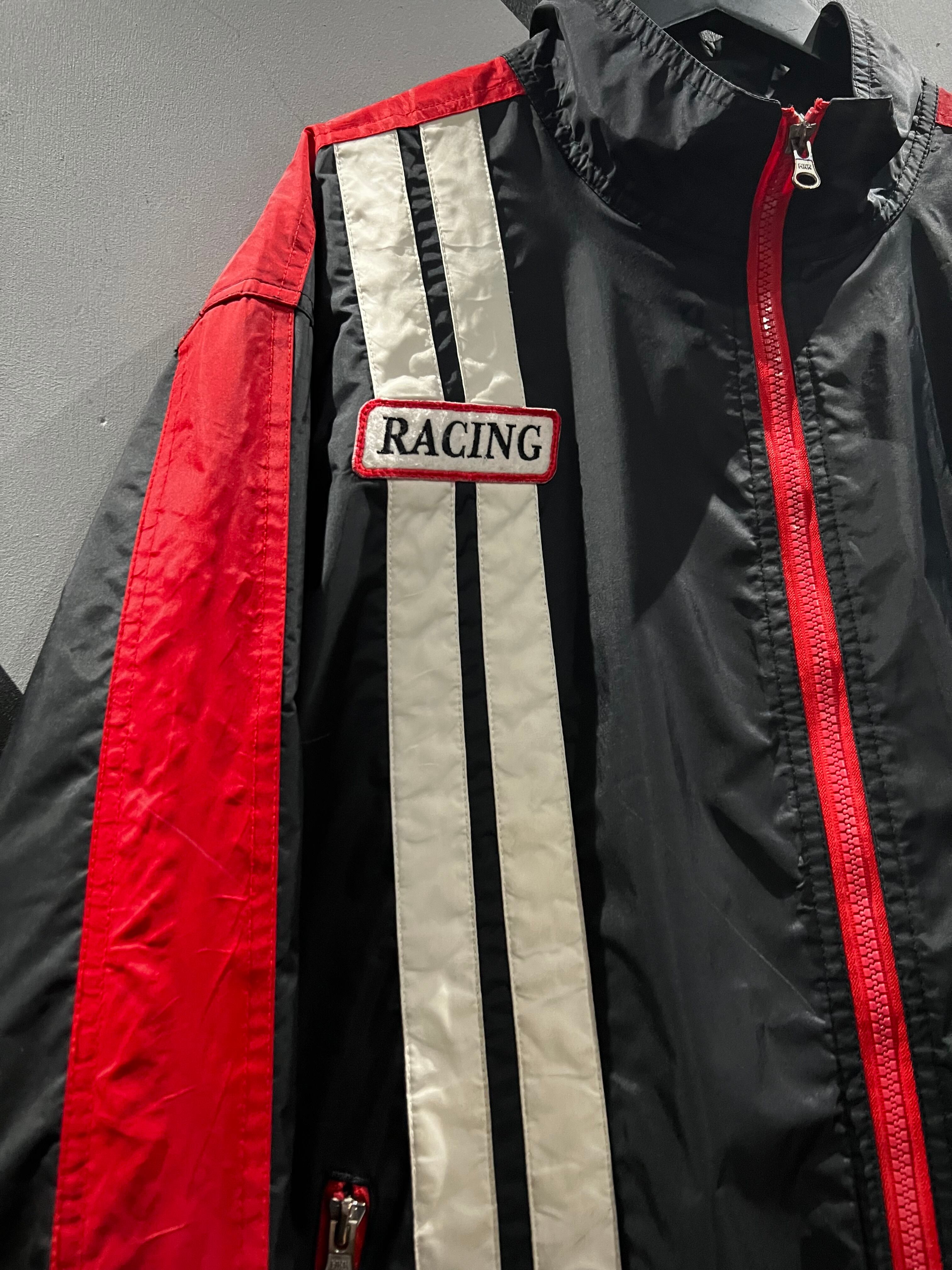 ブラックのナイロンボディをベースに、袖やジップラインには赤のライン切り替え、フロント右には白のラインにRACINGのワッペン、右胸にはフラップポケットにブランドワッペンを施したジャケット。