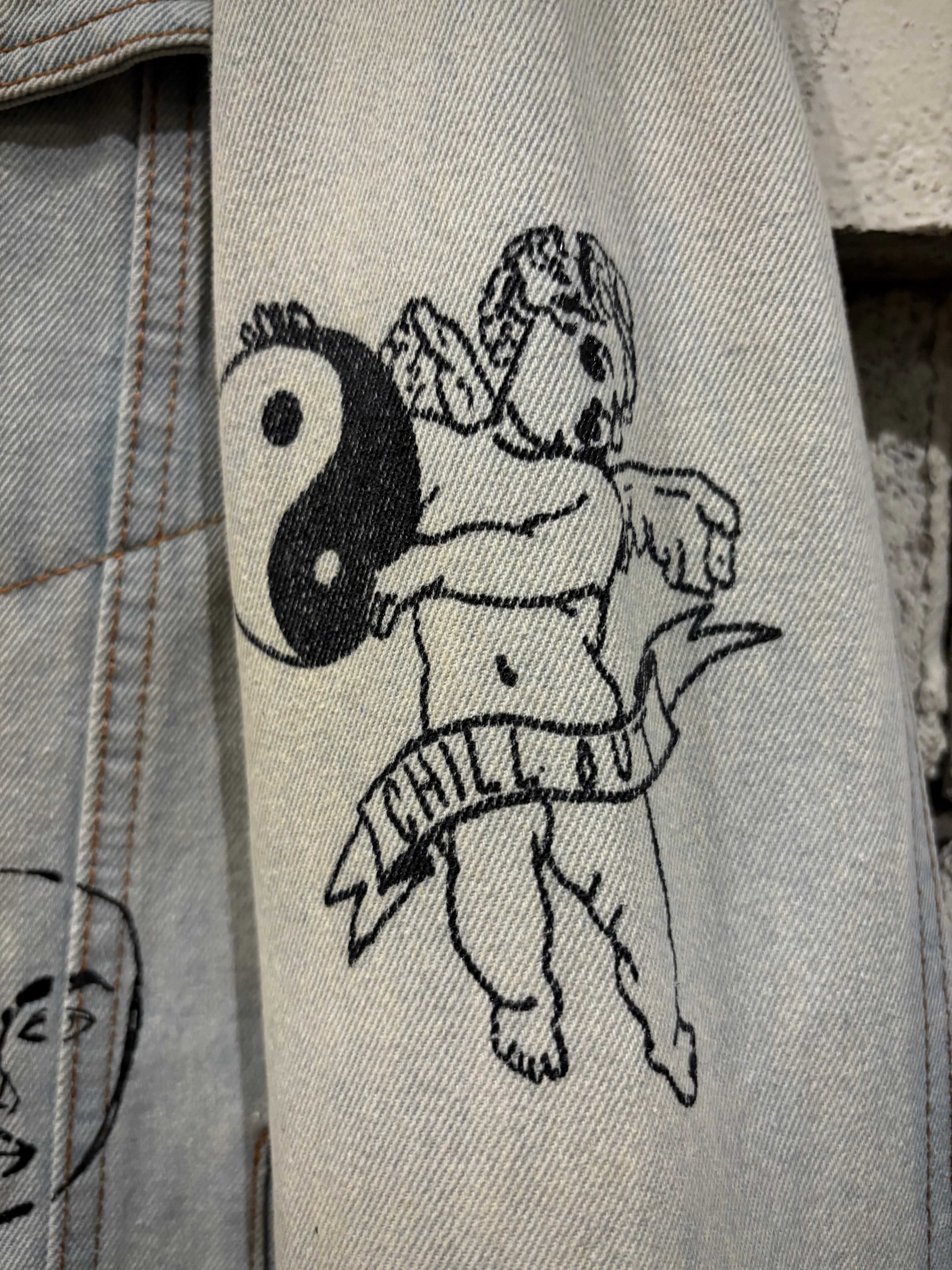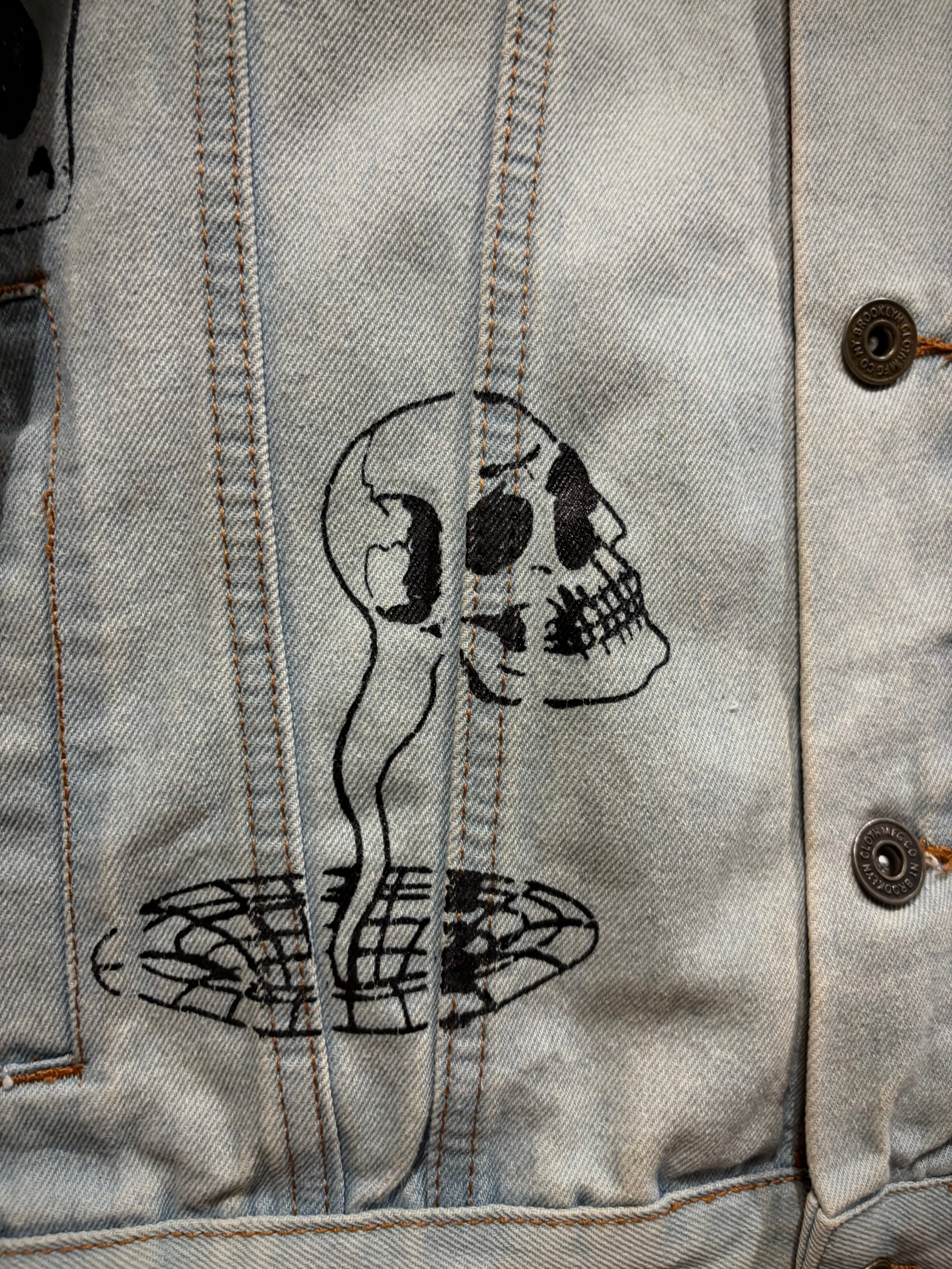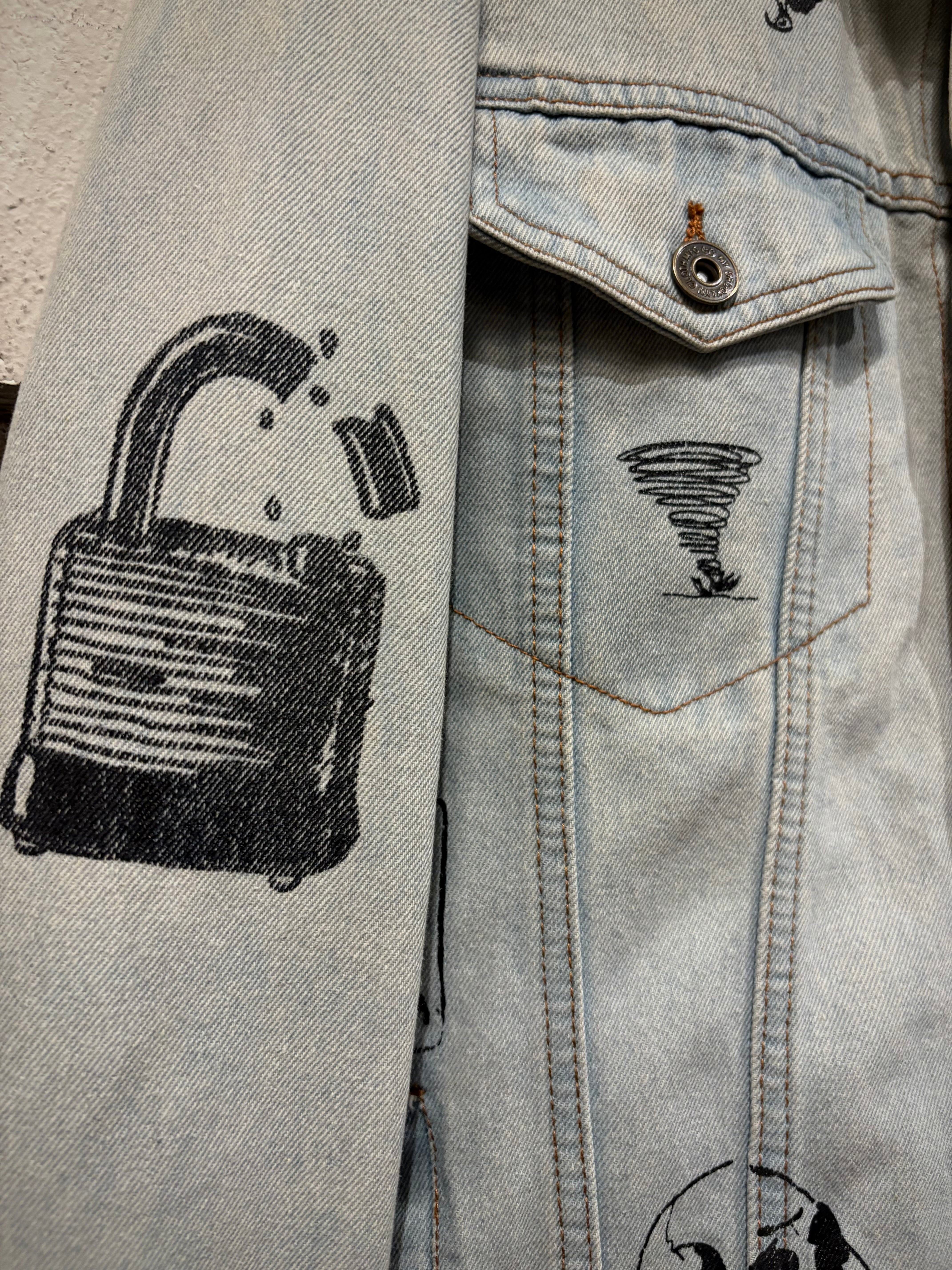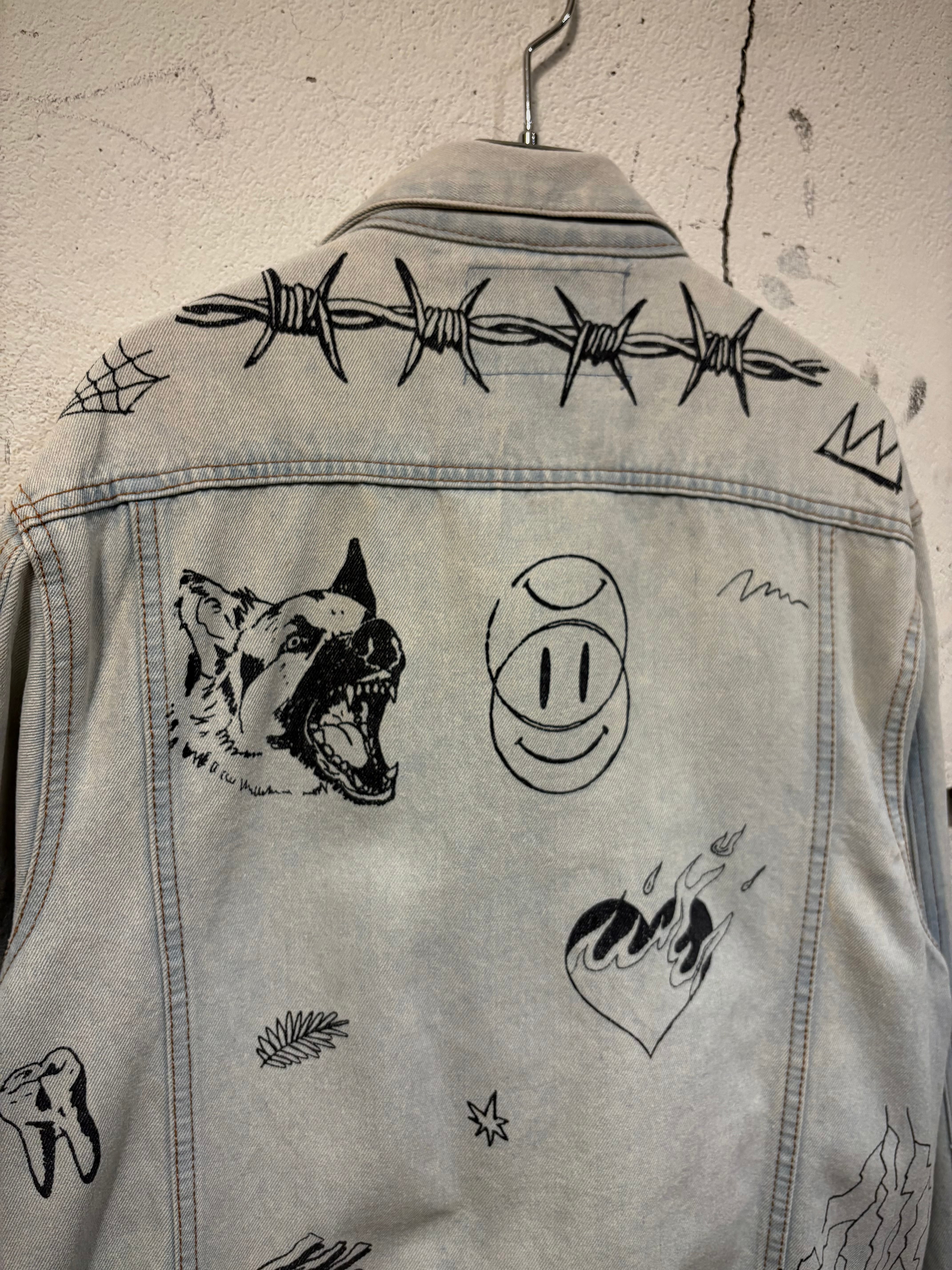 経年変化により、絶妙なスレ感、フェード感が美しいデニムジャケットのボディに、全所有者によって施されたペイントカスタムの載った1着。