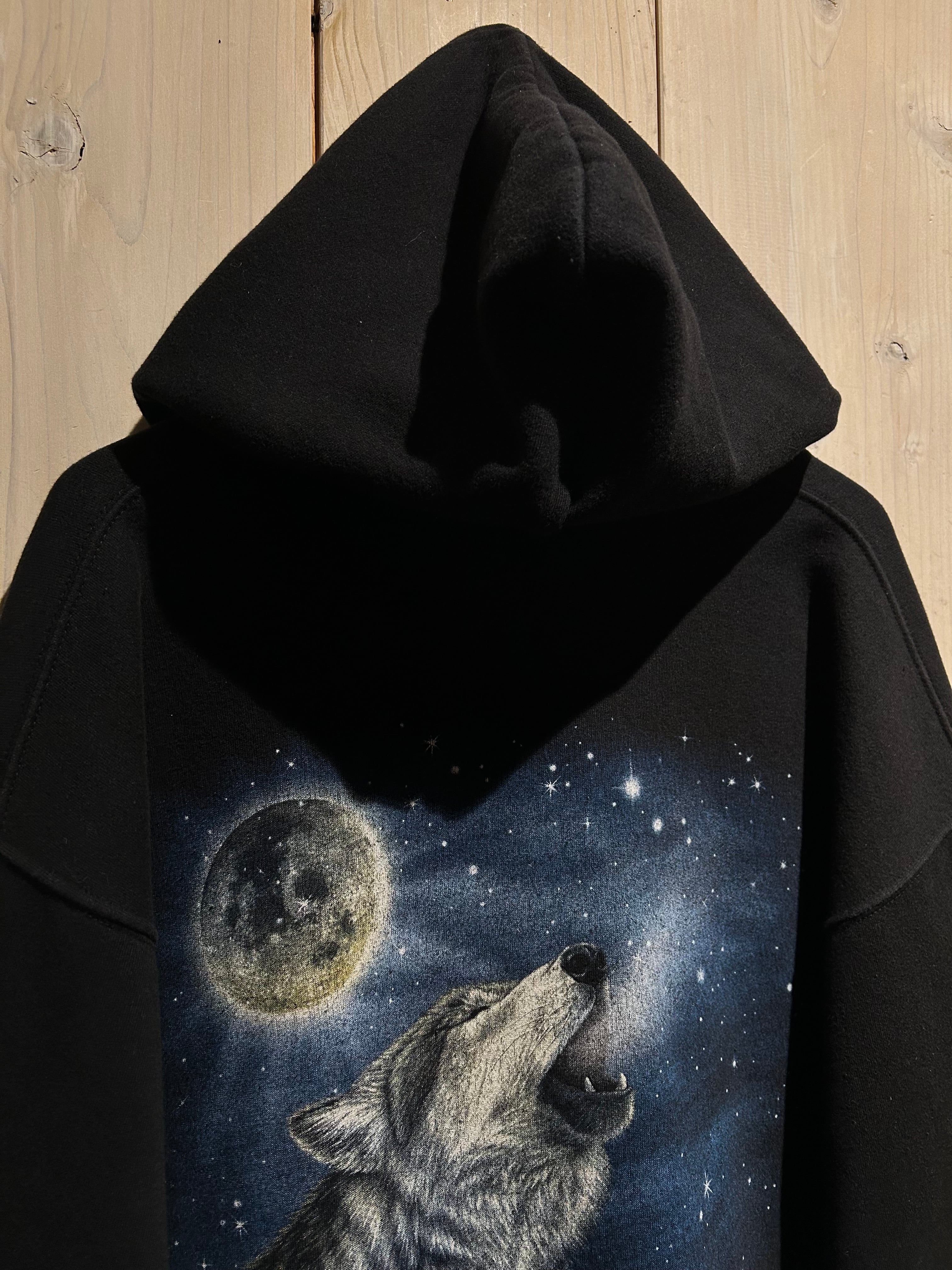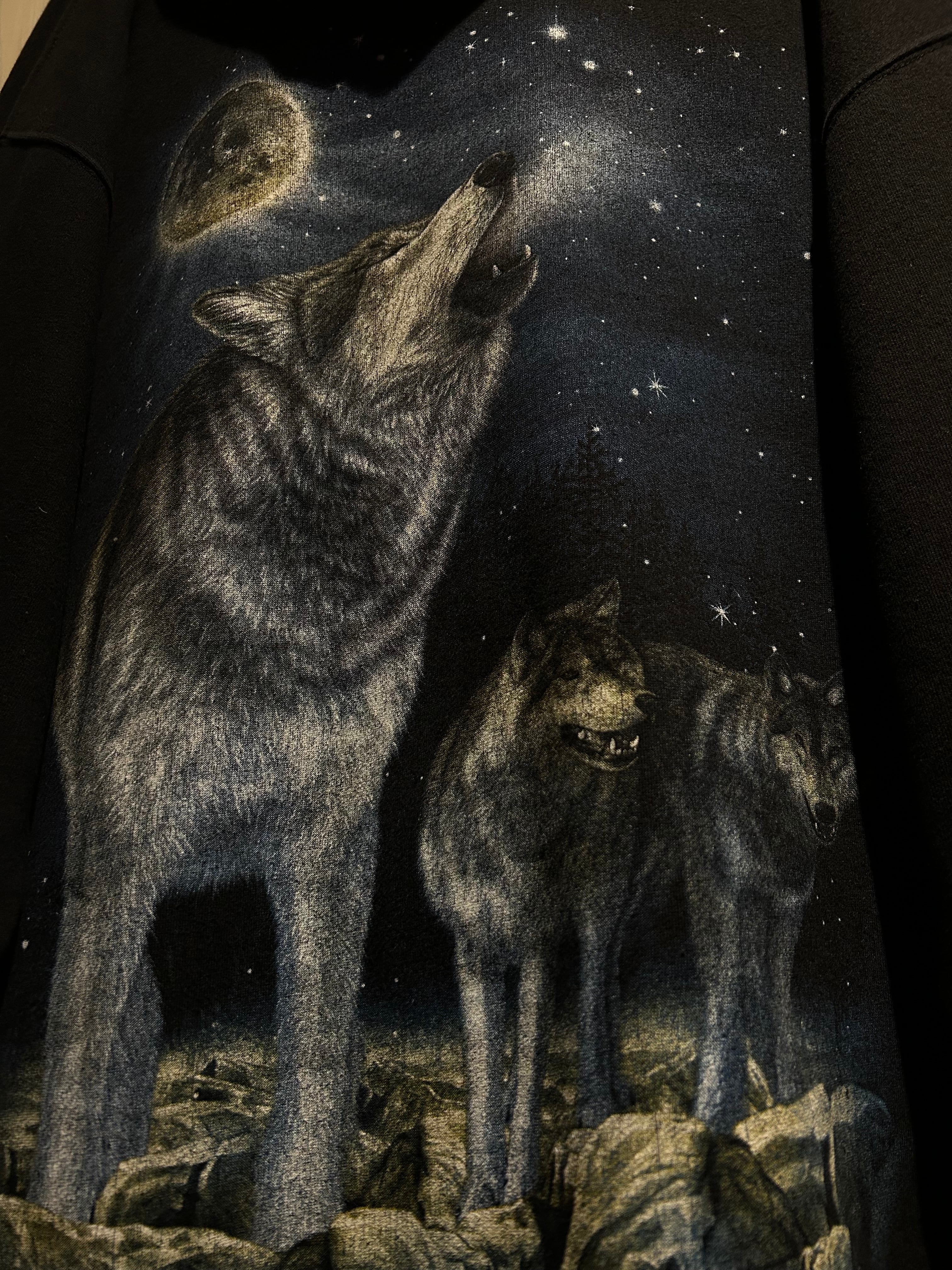 程よく肉厚で着心地の良いネイビーのボディに、月夜の下、凛としたオオカミや遠吠えするオオカミをプリントした1着。繊細なプリントによって表現されたオオカミのリアルさが◎