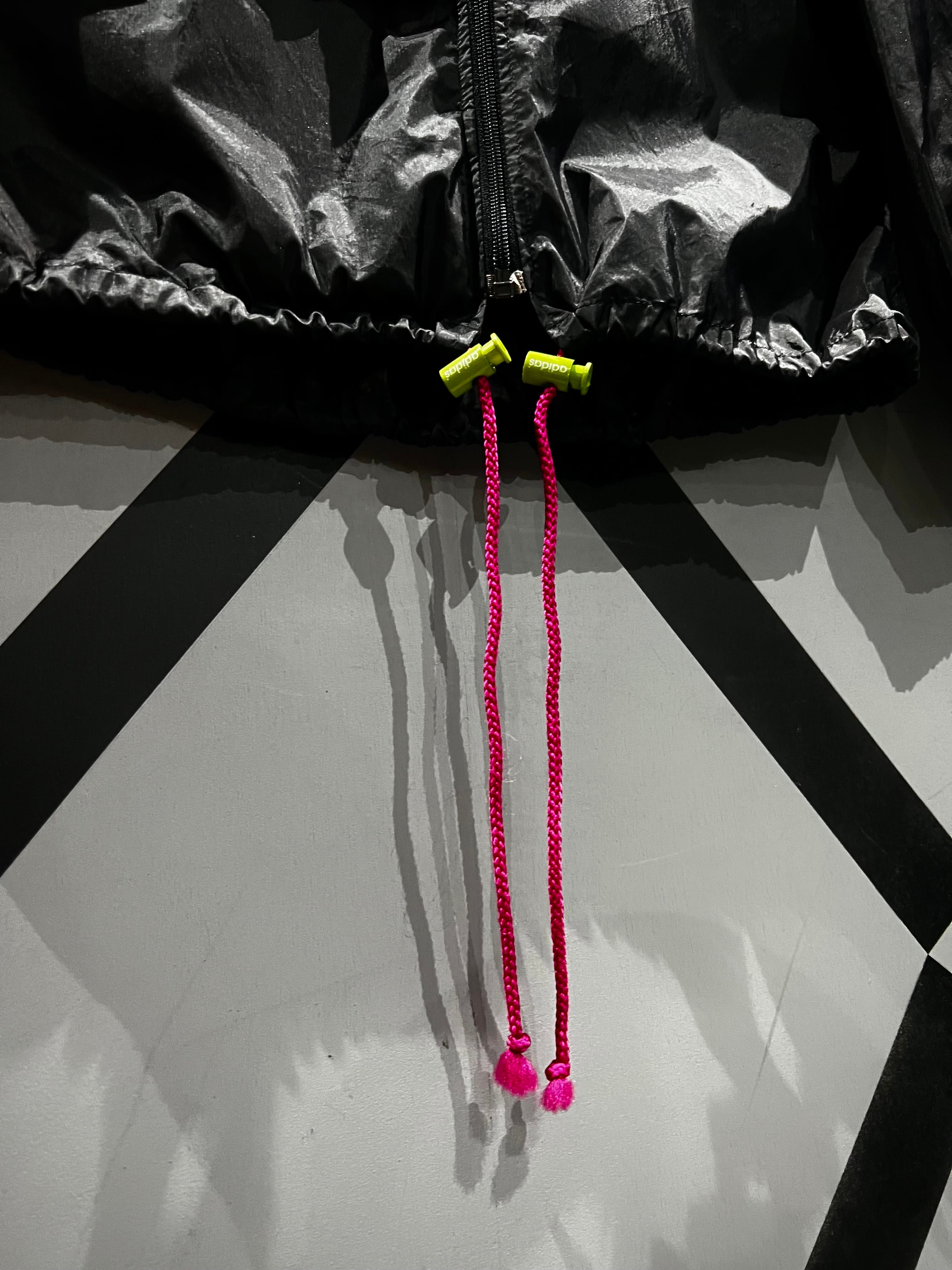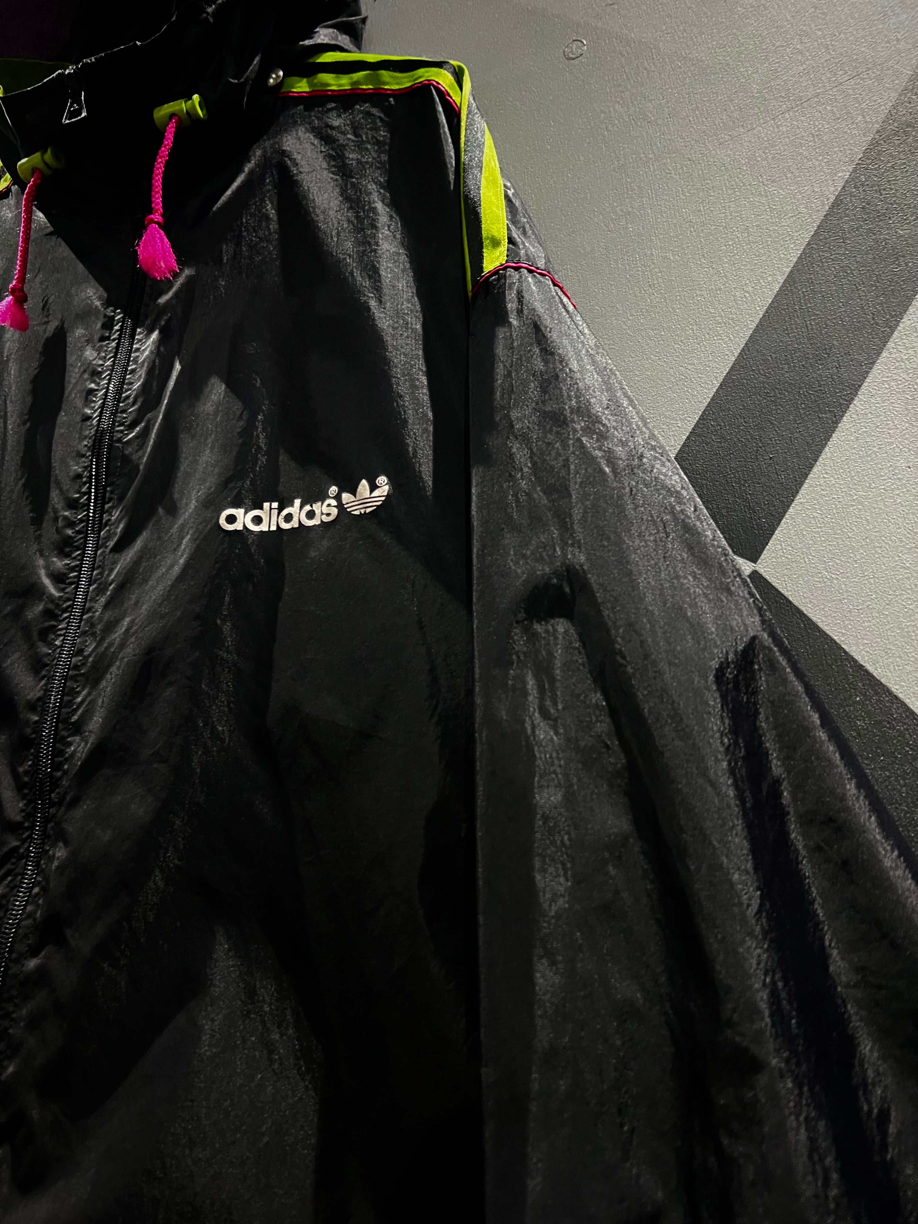 シャリ感のあるポリ素材を用いたブラックのボディに、イエロー×ピンクのネオンカラーを切り替えた、ヴィンテージながら近未来感の漂うジャケット。