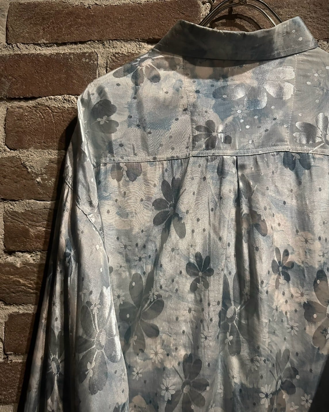 白×水色の淡い花柄を載せたボディに、さらにシルバーのジャガード織りで花柄を載せた長袖シャツ。