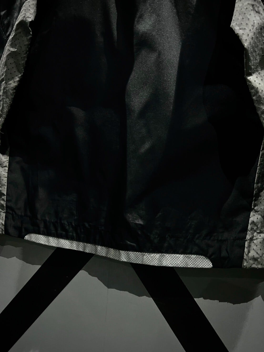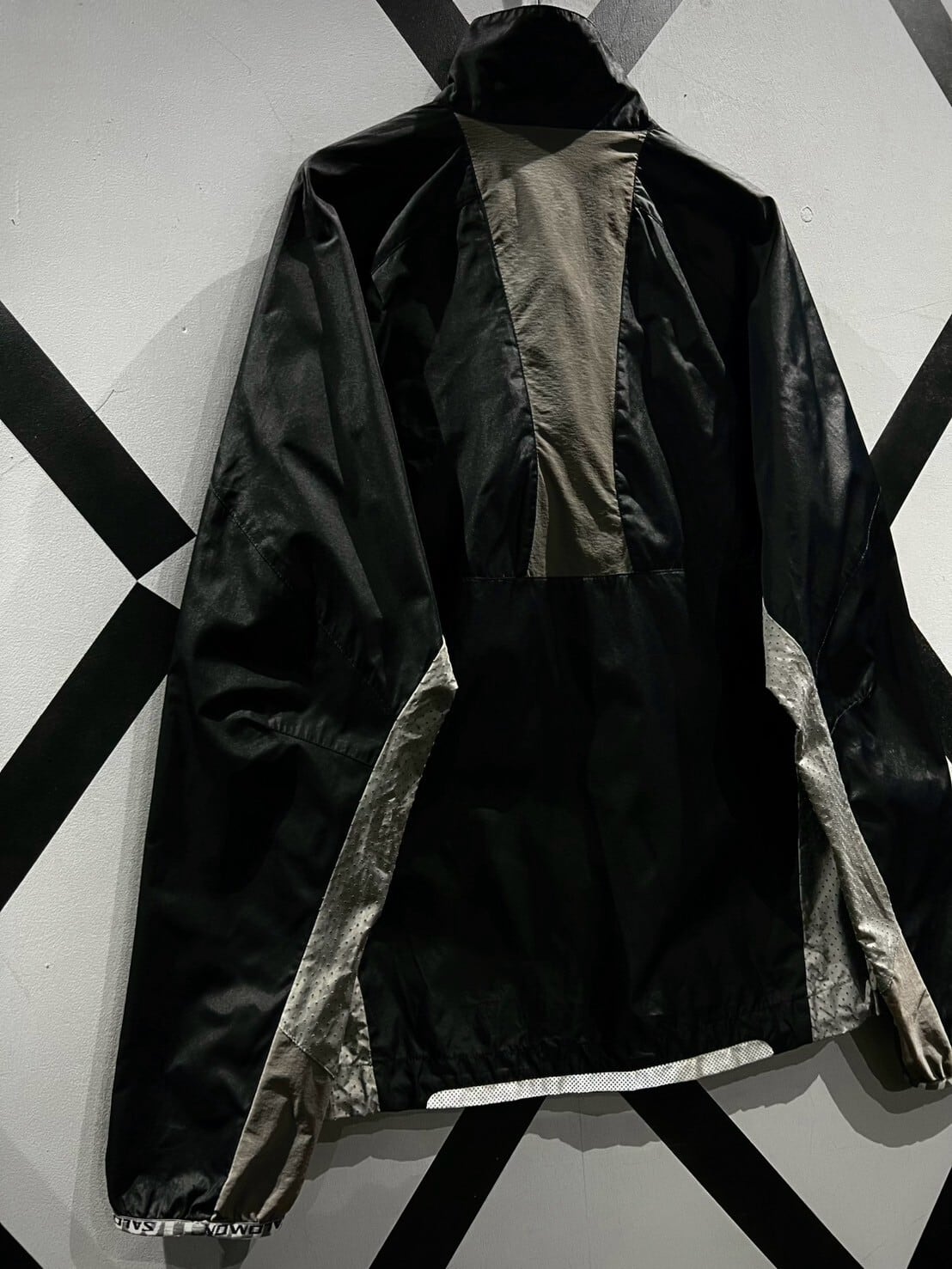 ハリのあるブラックのボディに、フロントにはブランドネームを載せたジップポケット、アームからボディサイドにかけてメッシュ生地を切り替えたギアジャケット。