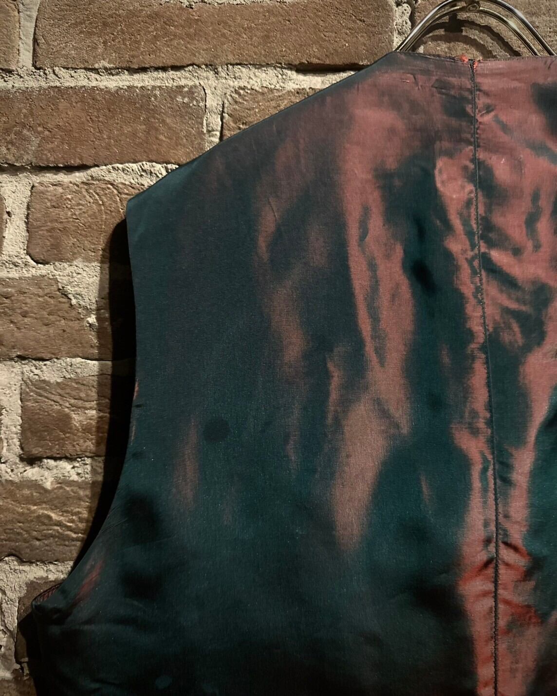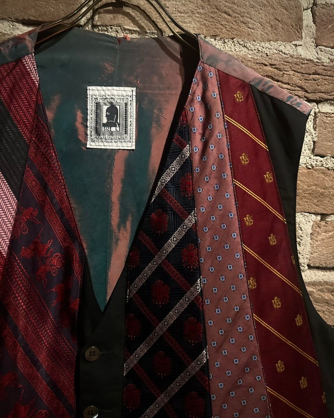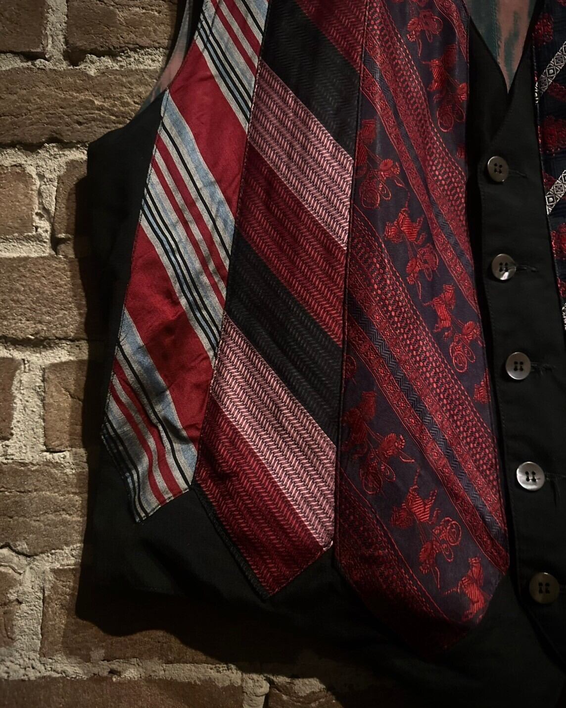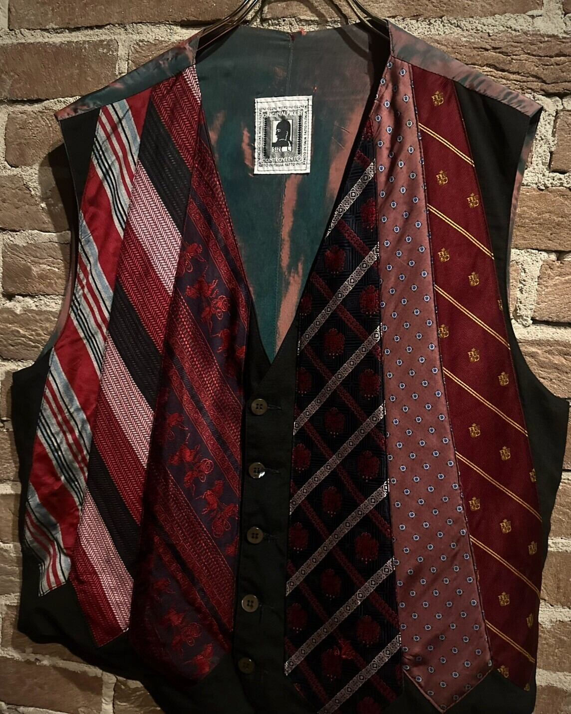 前身頃に様々な柄模様のネクタイをパッチワーク風に繋ぎ合わせ、デザインに落とし込んだベスト。