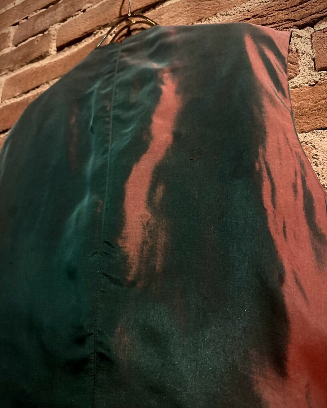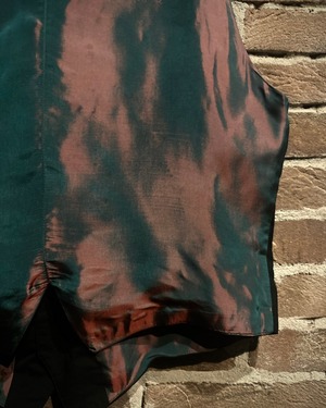 ボディにはピンクからグリーンへと移りゆく玉虫カラーの生地を用いており、前後で切り替えた事で異なる表情を楽しめるのもポイント。ネクタイを繋ぎ合わせるという、デザインアプローチの面白味も◎