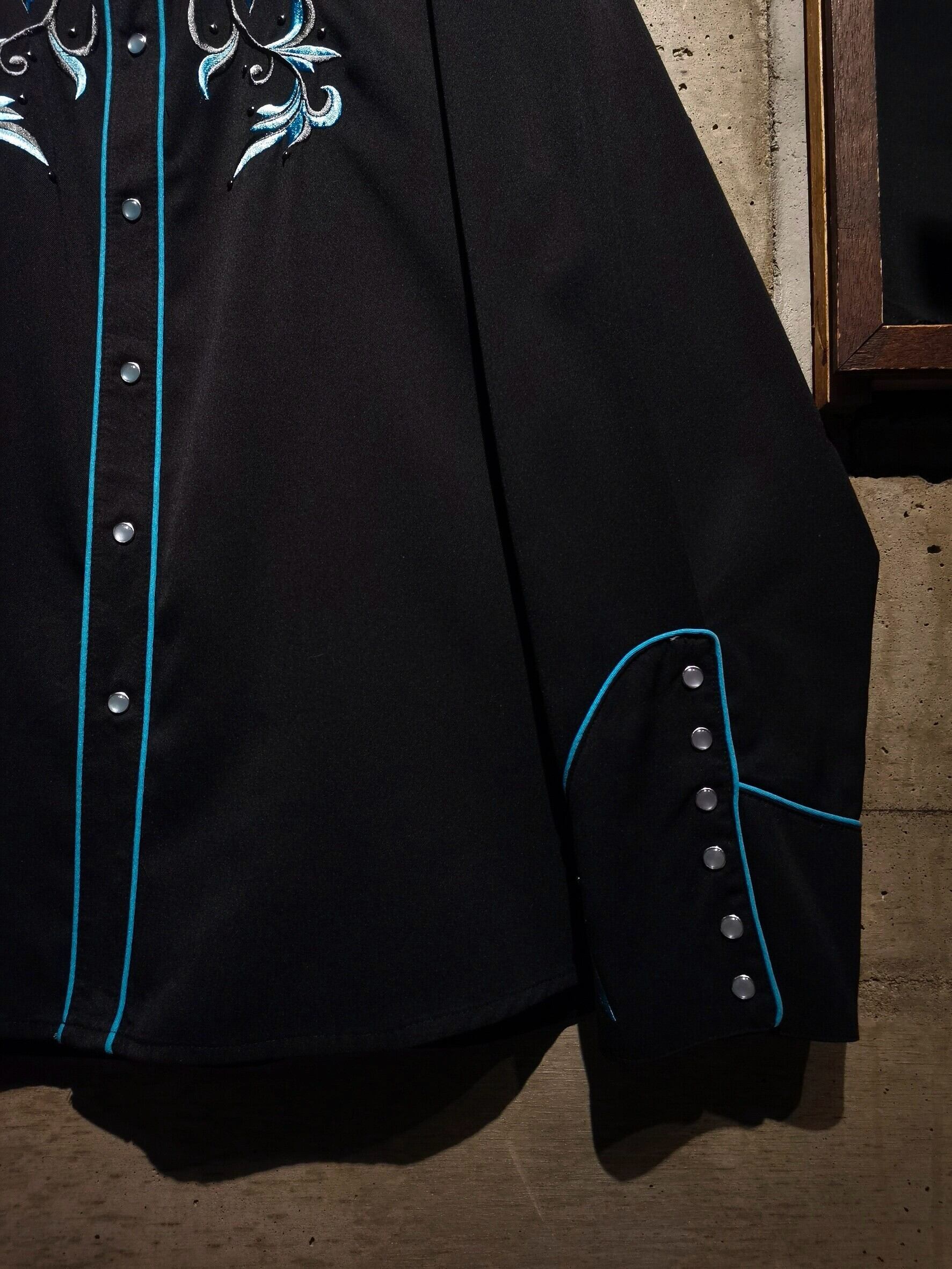 グレー×ライトブルーの配色も非常に良い、、、刺繍の周りにはシルバーのスタッズを施しデザインのアクセントになりつつ、煌びやかな表情に心奪われてしまいます。アローポケットにパイピング、スナップボタンとウエスタンならではのデザインも◎