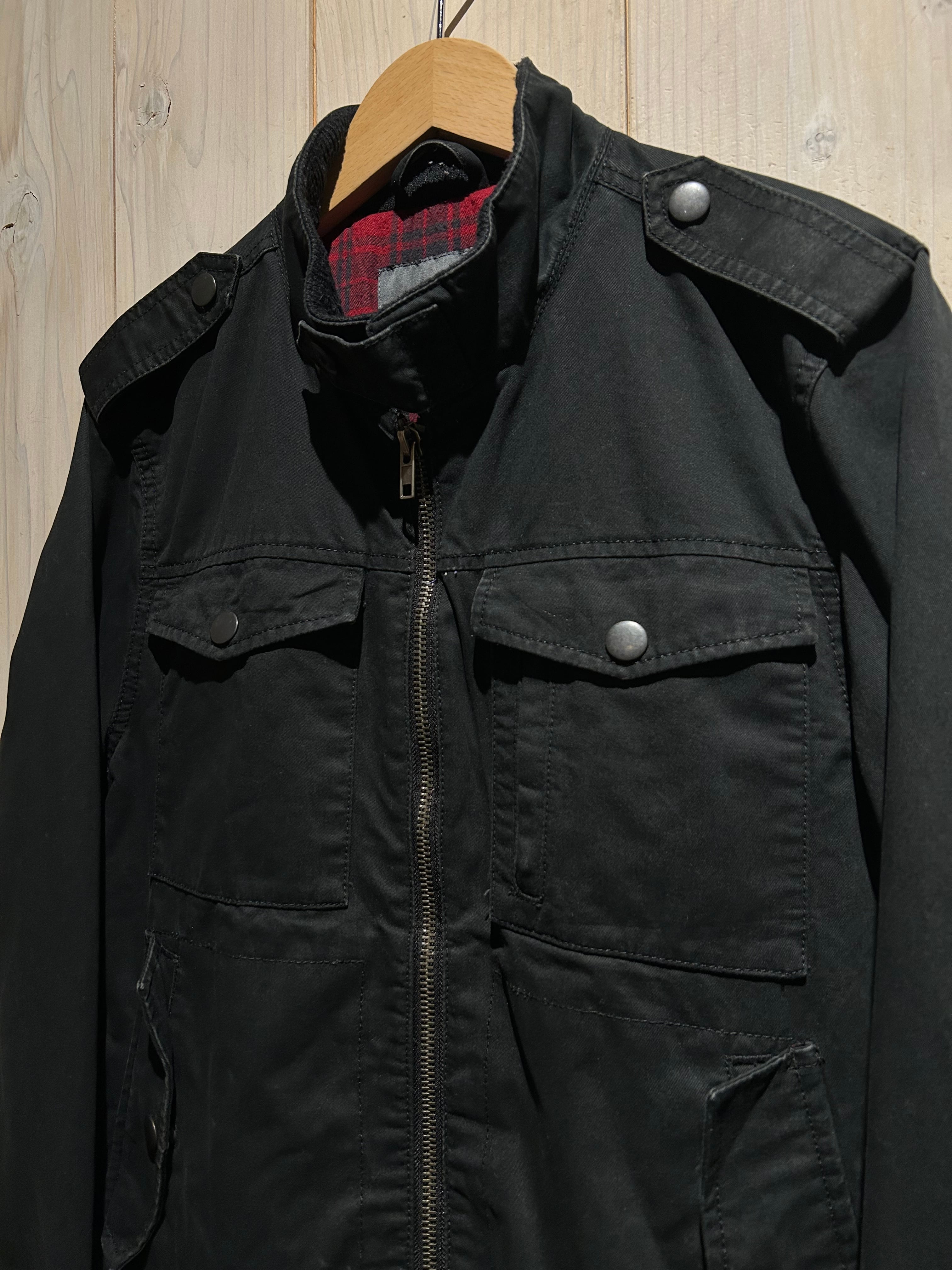 フロントにはポケットを4つ配置し、肩にはエポレット、首にはチンストラップと、無骨さがありながらミニマルで洗練されたデザインバランスが素晴らしい、、、裏地の赤のタータンチェックも◎