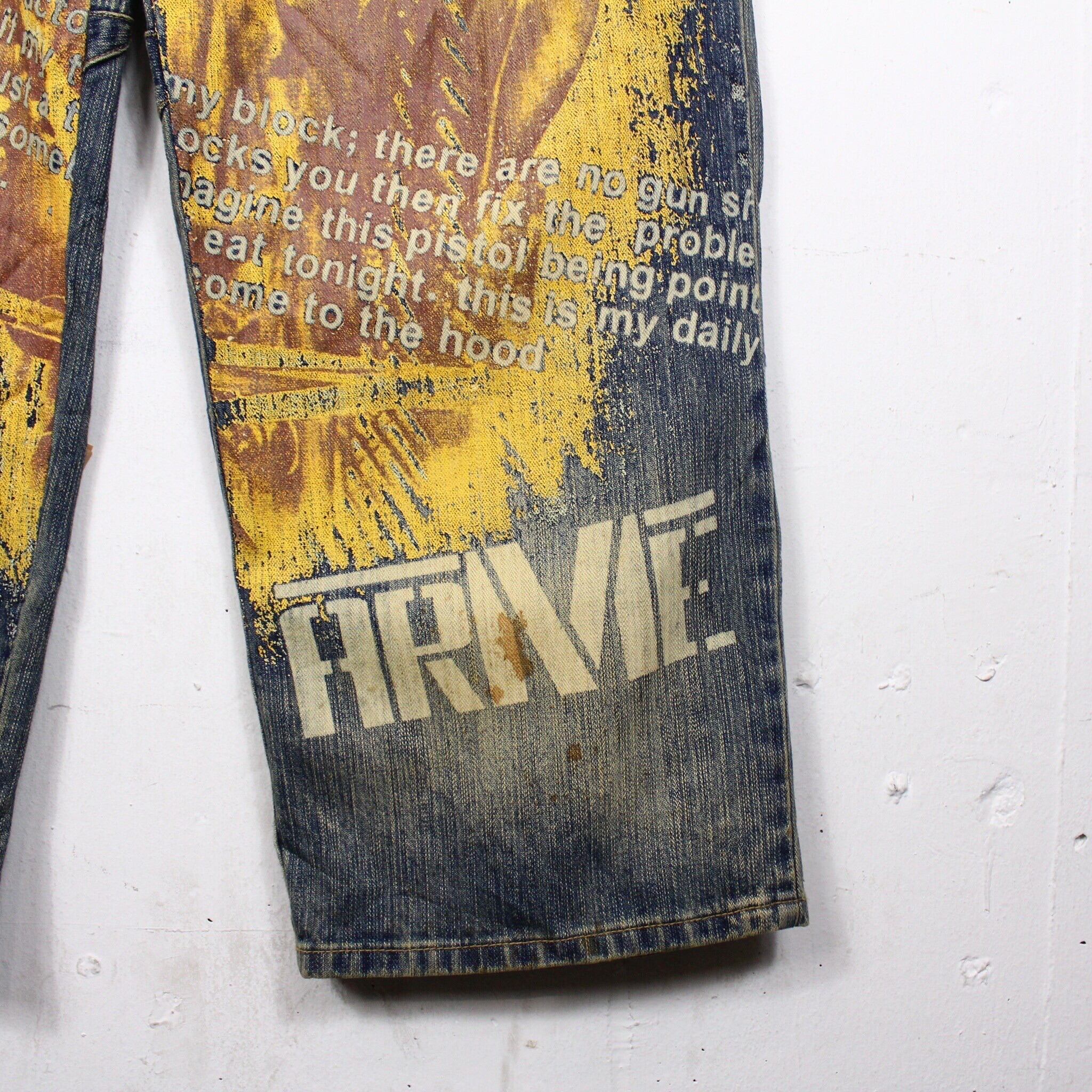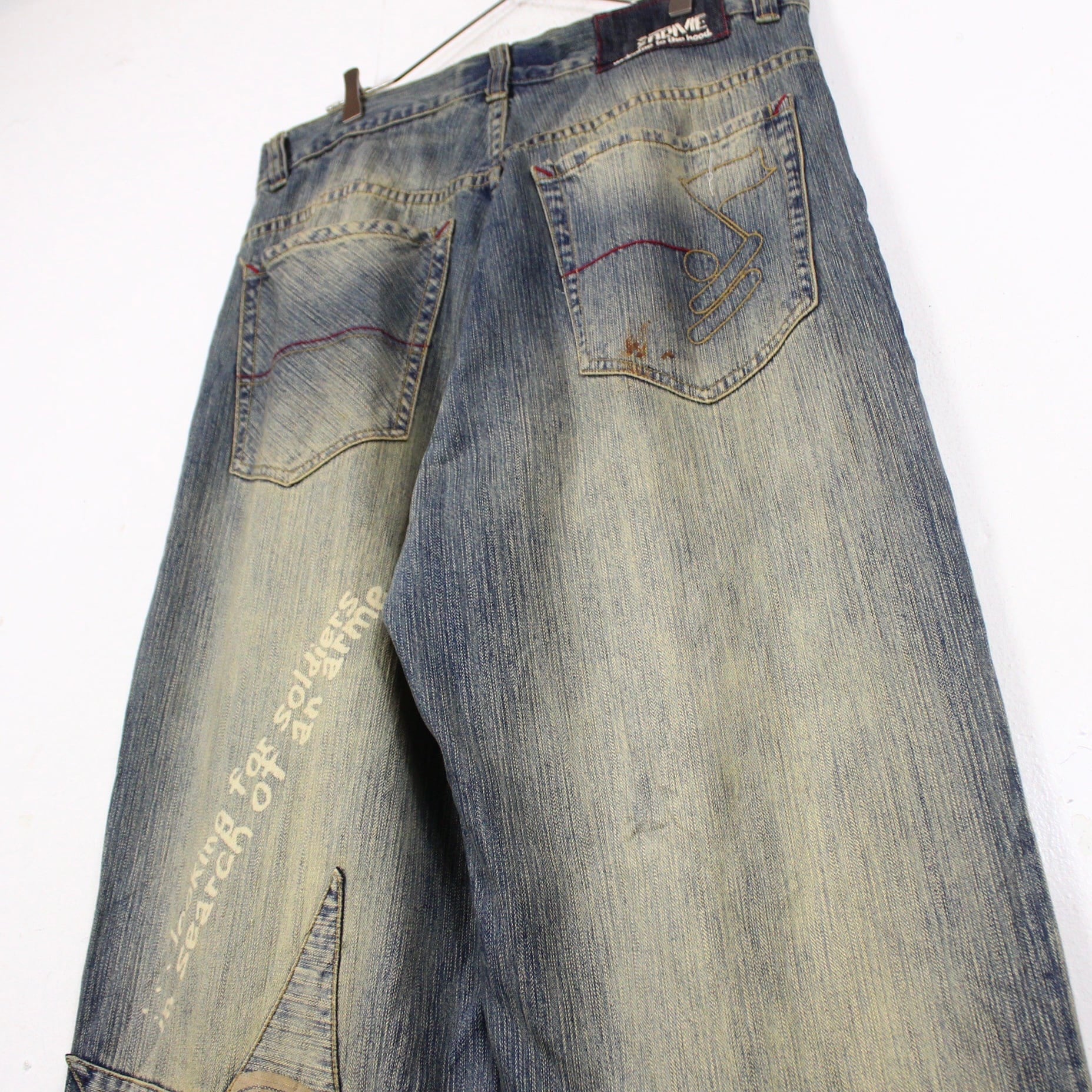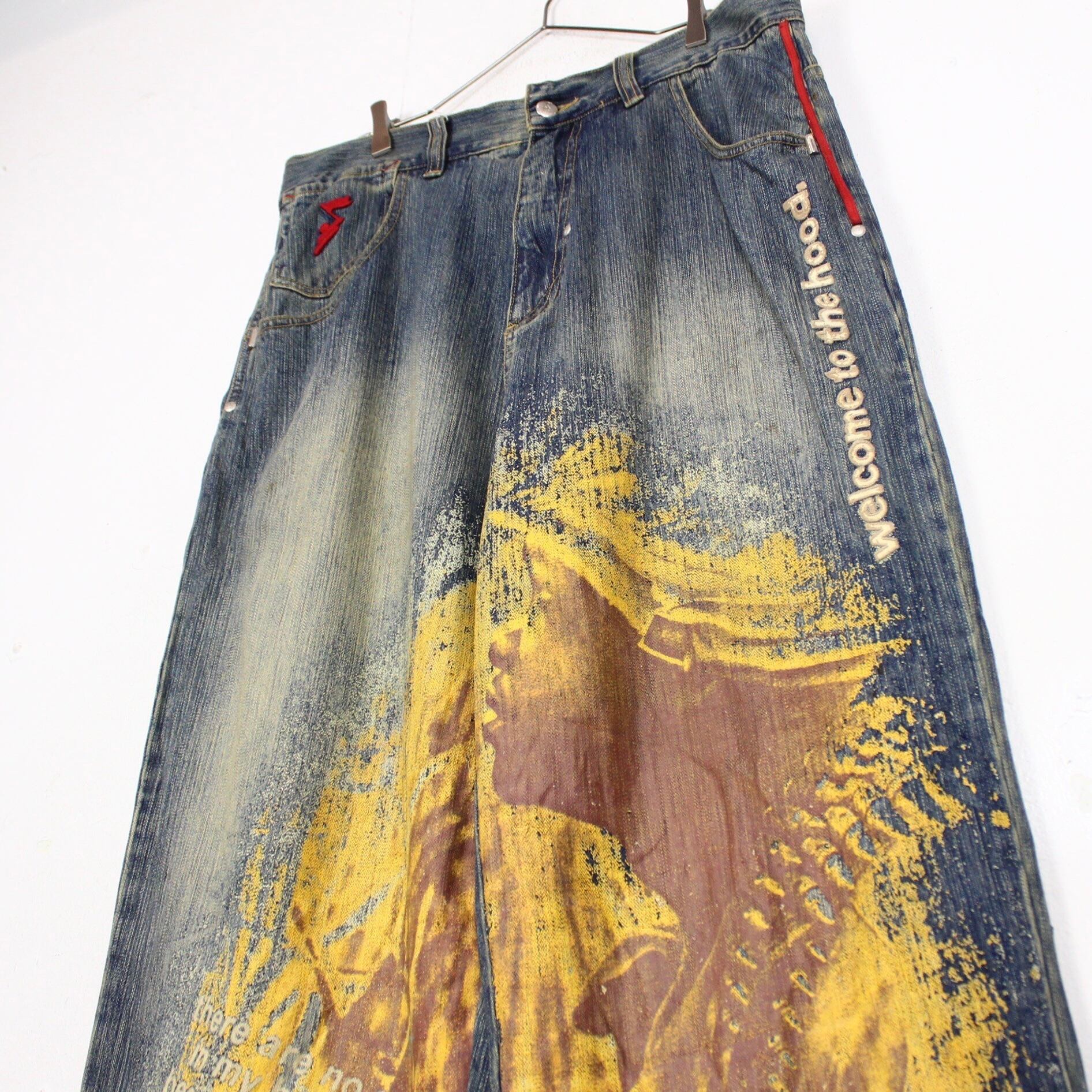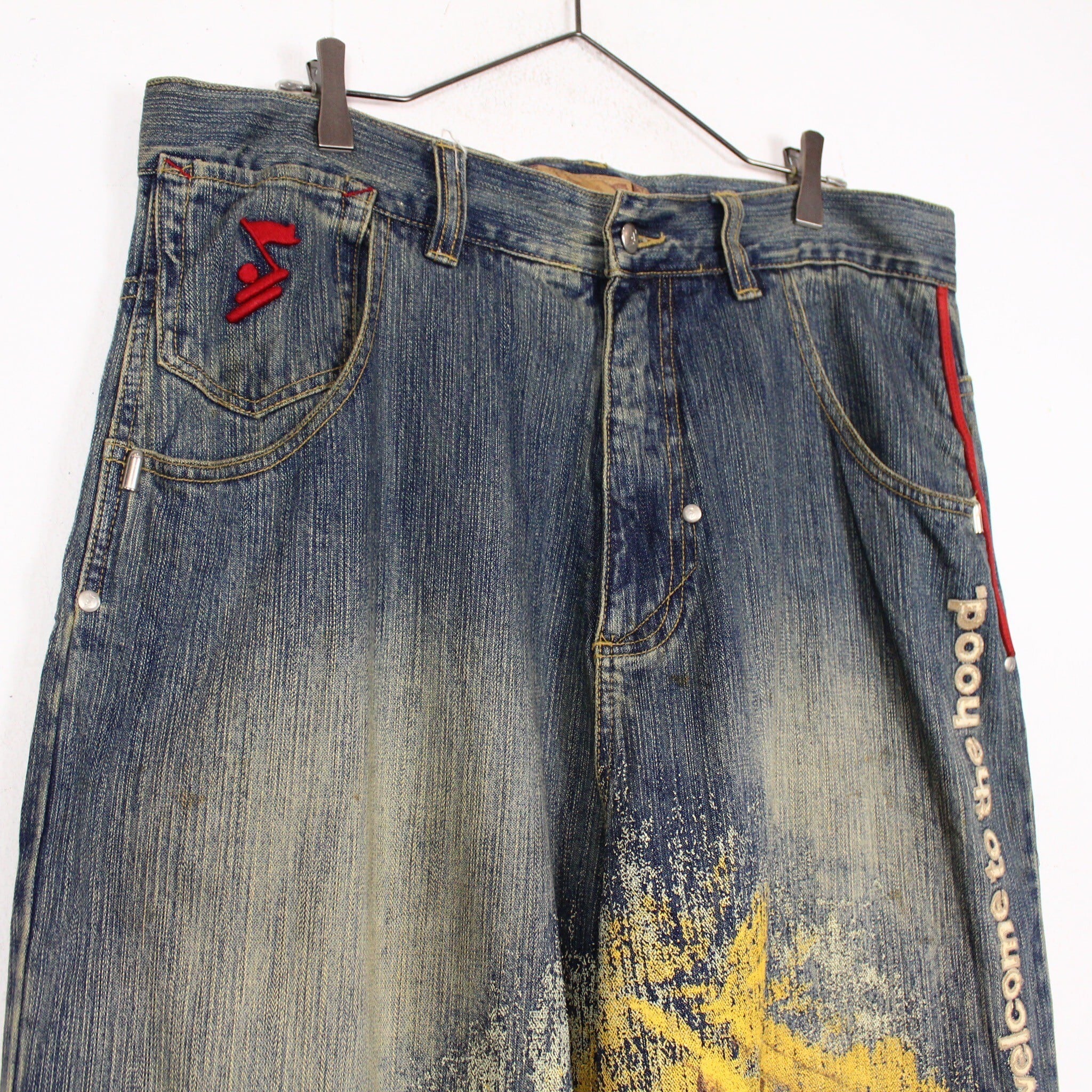 フェード加工がされたボディに、迫力のあるグラフィックをプリントで載せ、レタリング調のデザインを施したバギーパンツ。