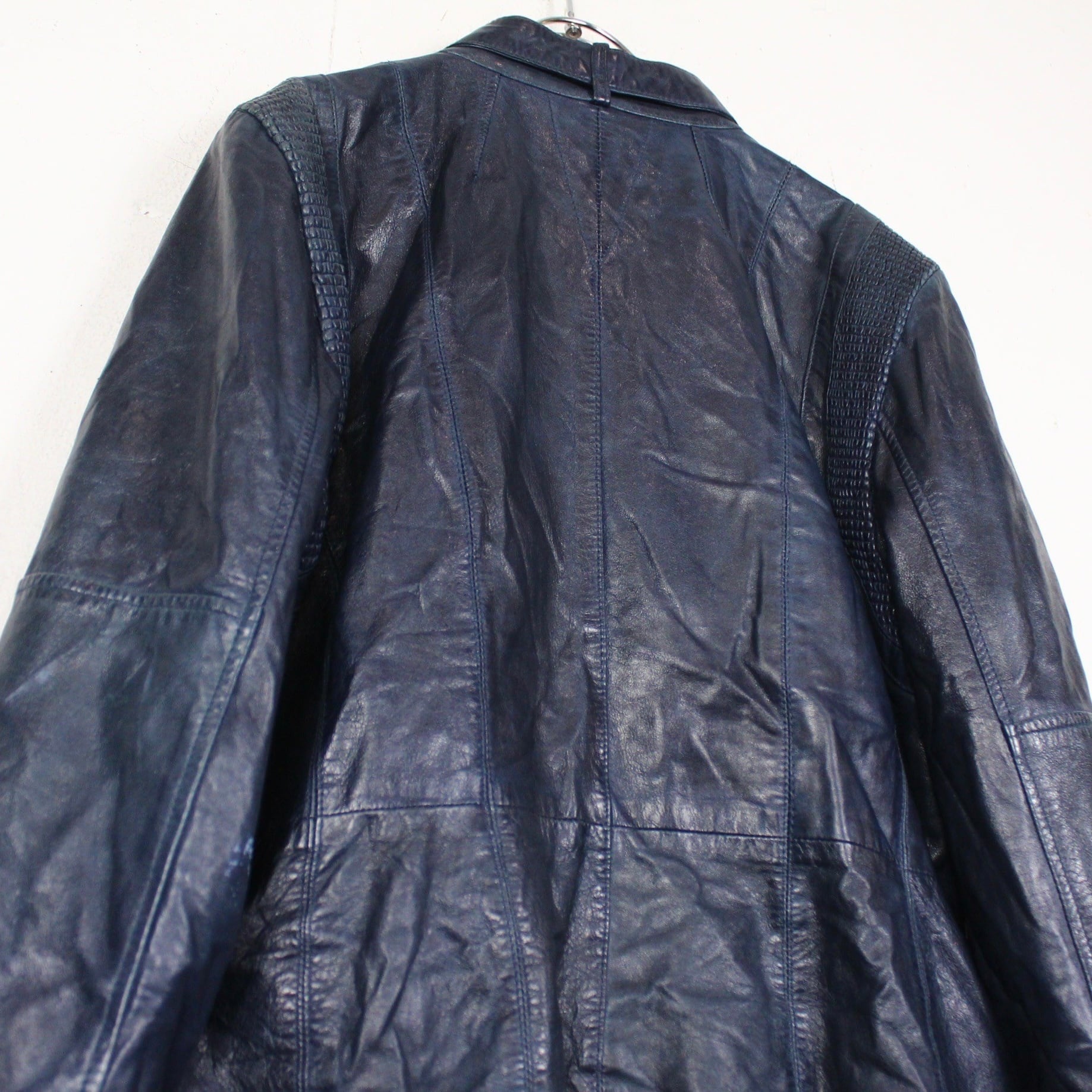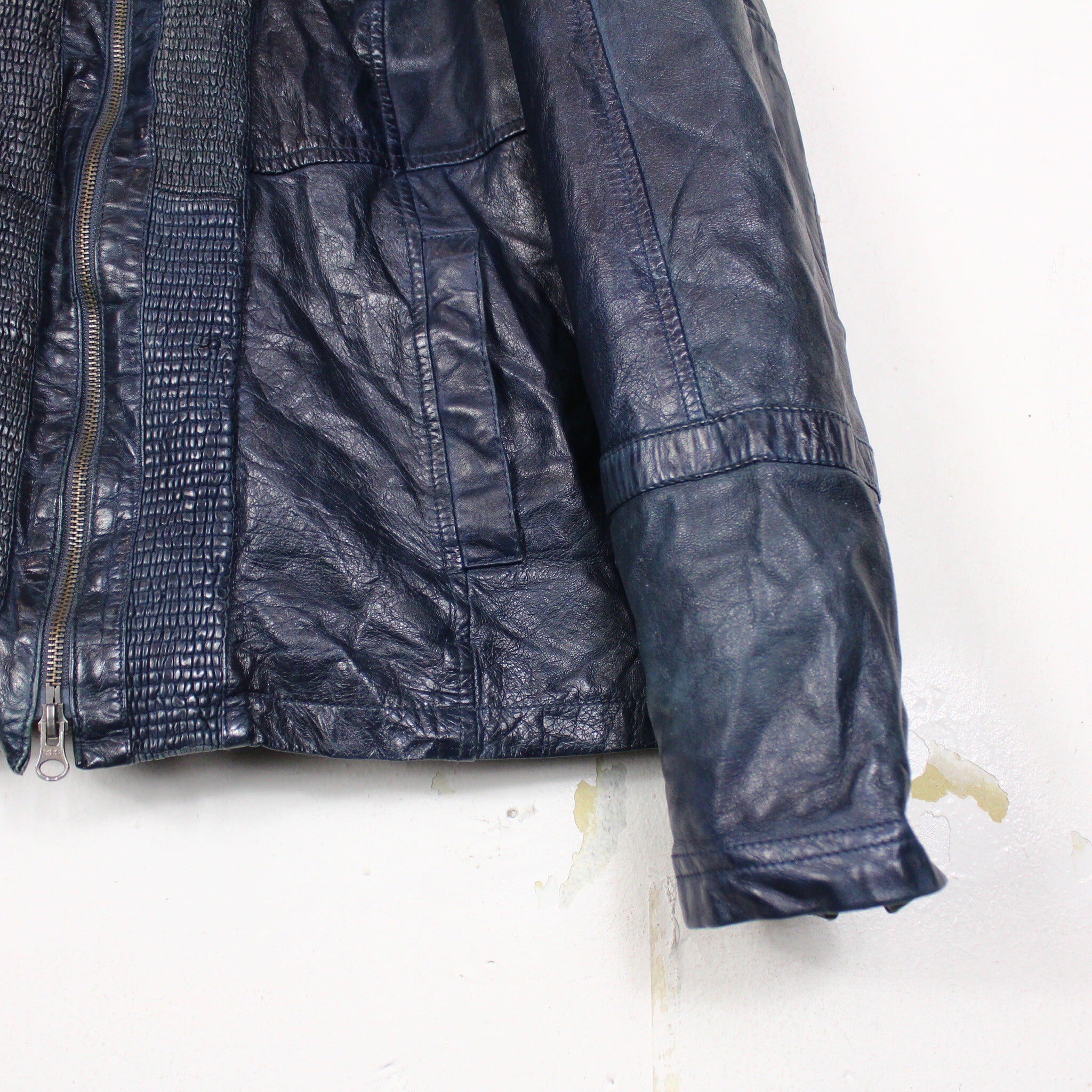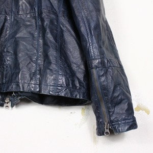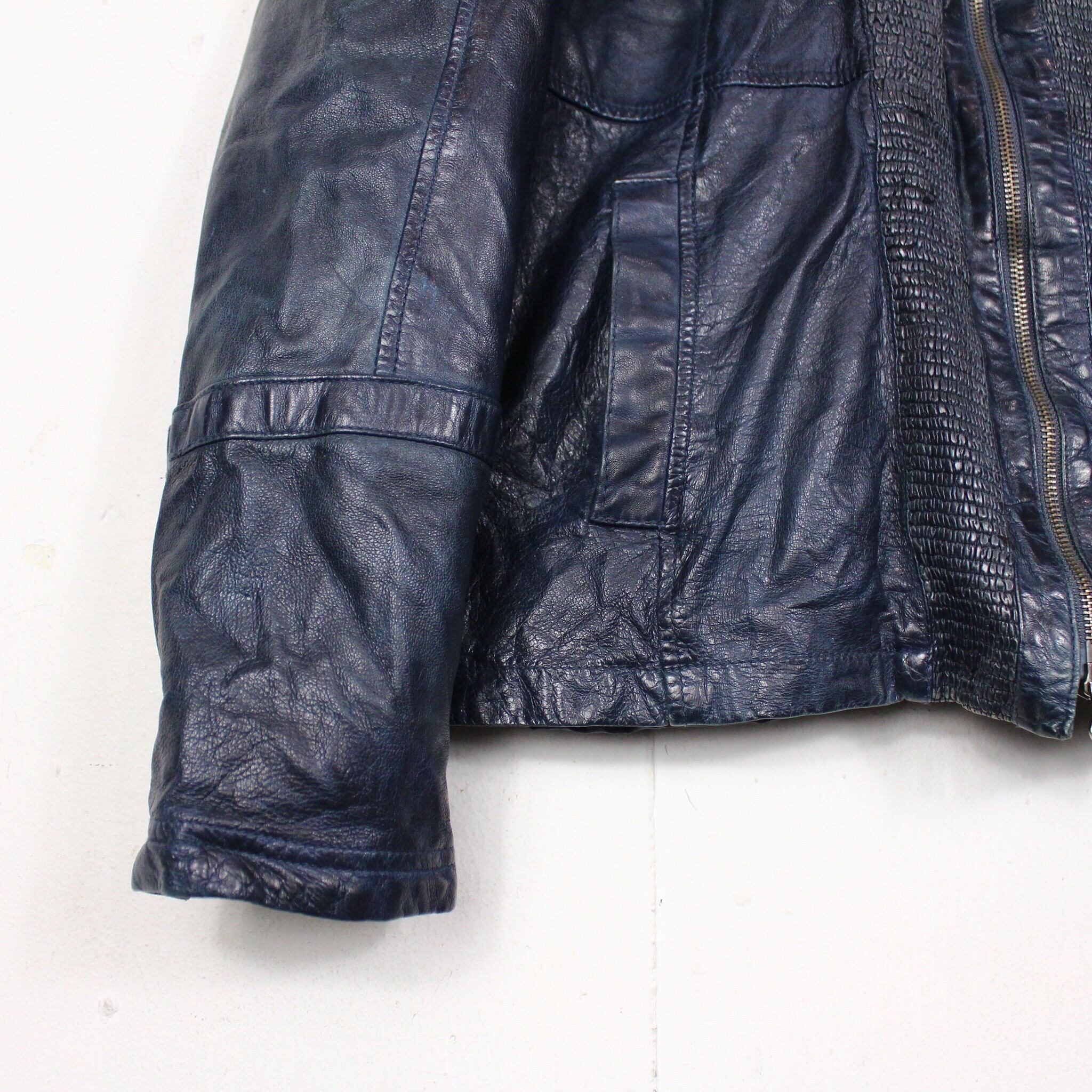 レザーの中でも稀少なブルーレザーを用いたボディに、シュリンク加工を施したスペシャルなシングルレザーライダースジャケット。