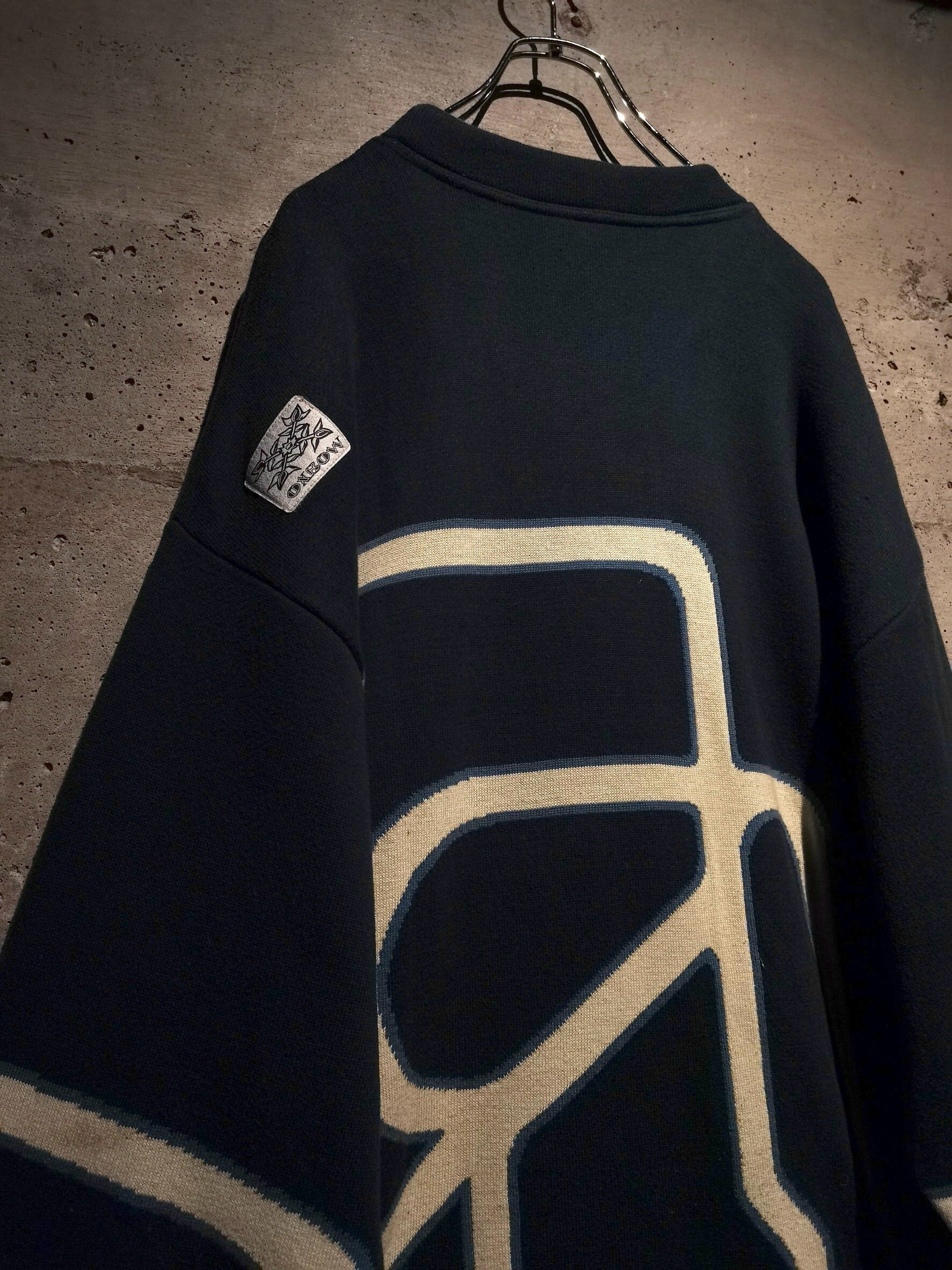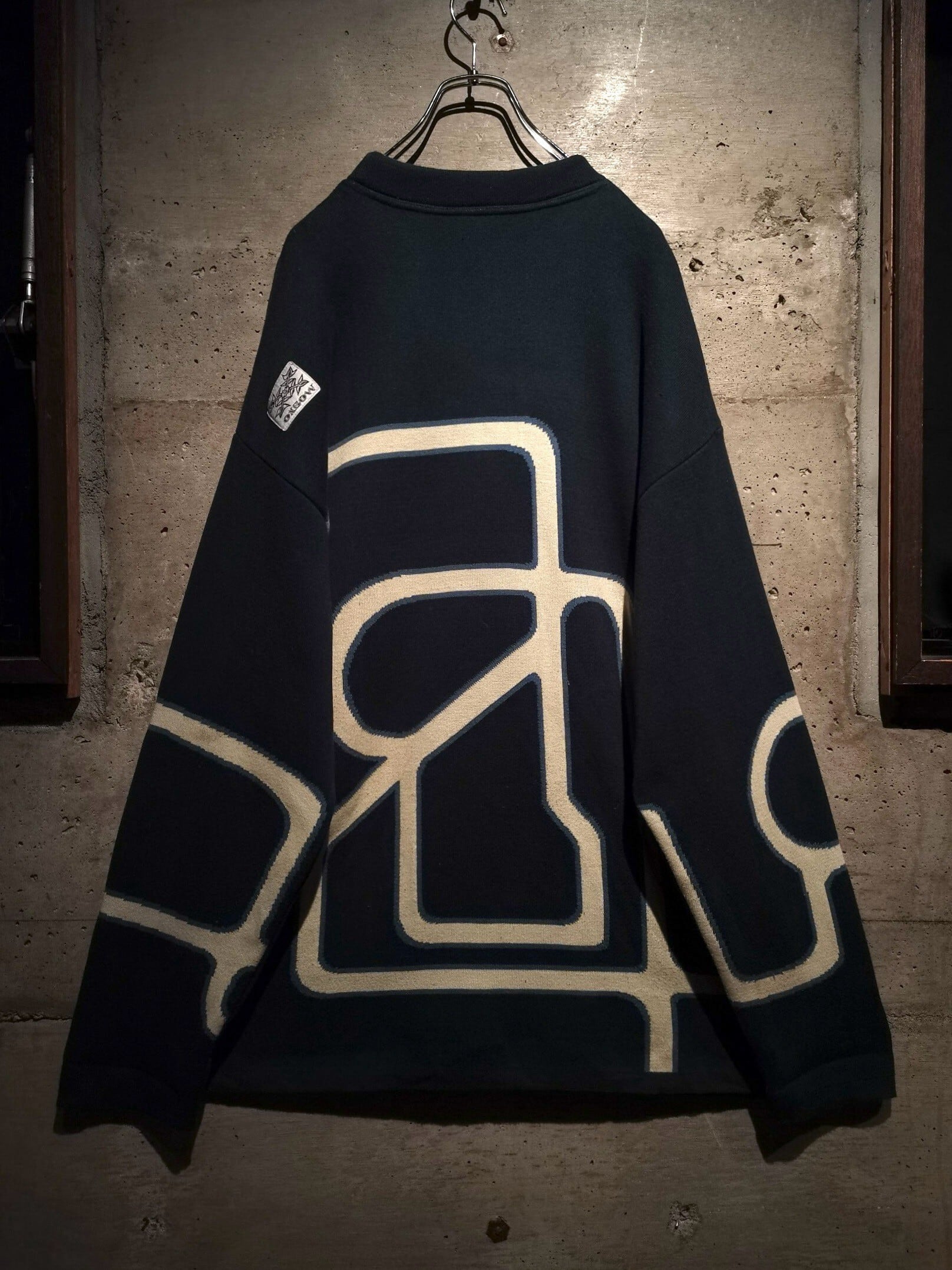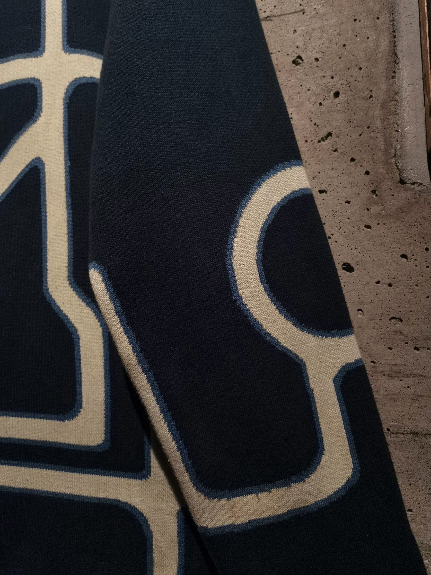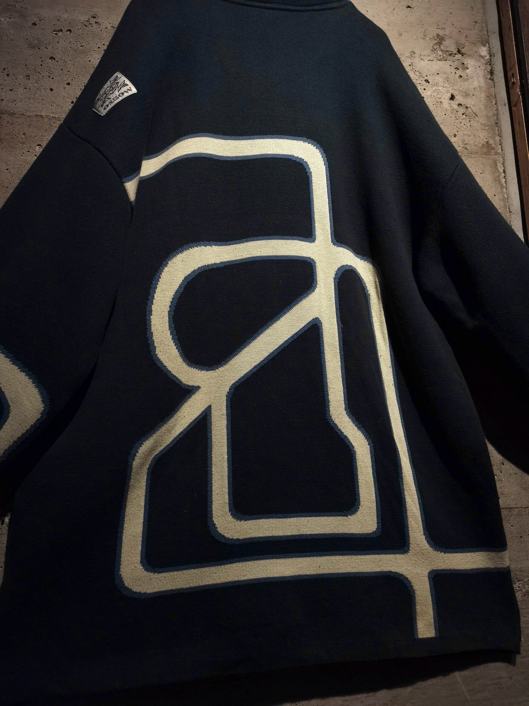 ネイビーのボディをベースに、背面、袖に曲線的なデザインを載せた1着。