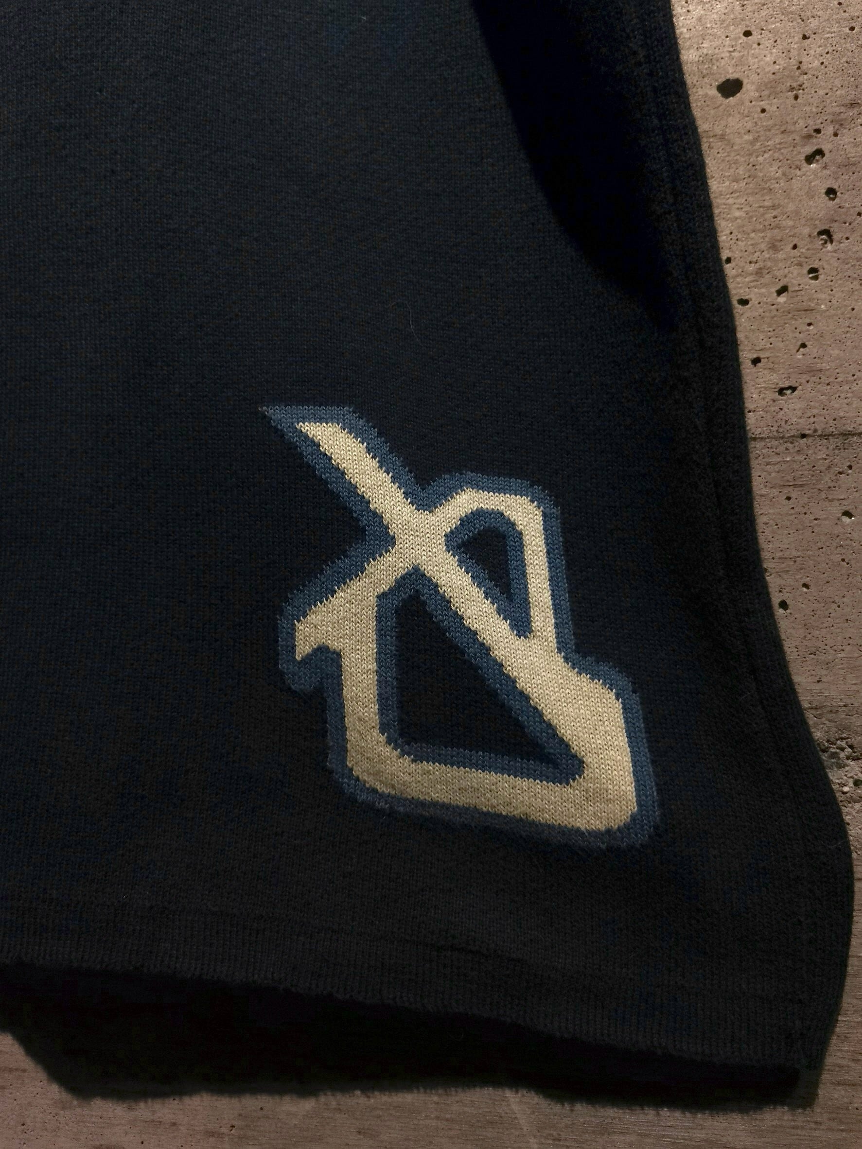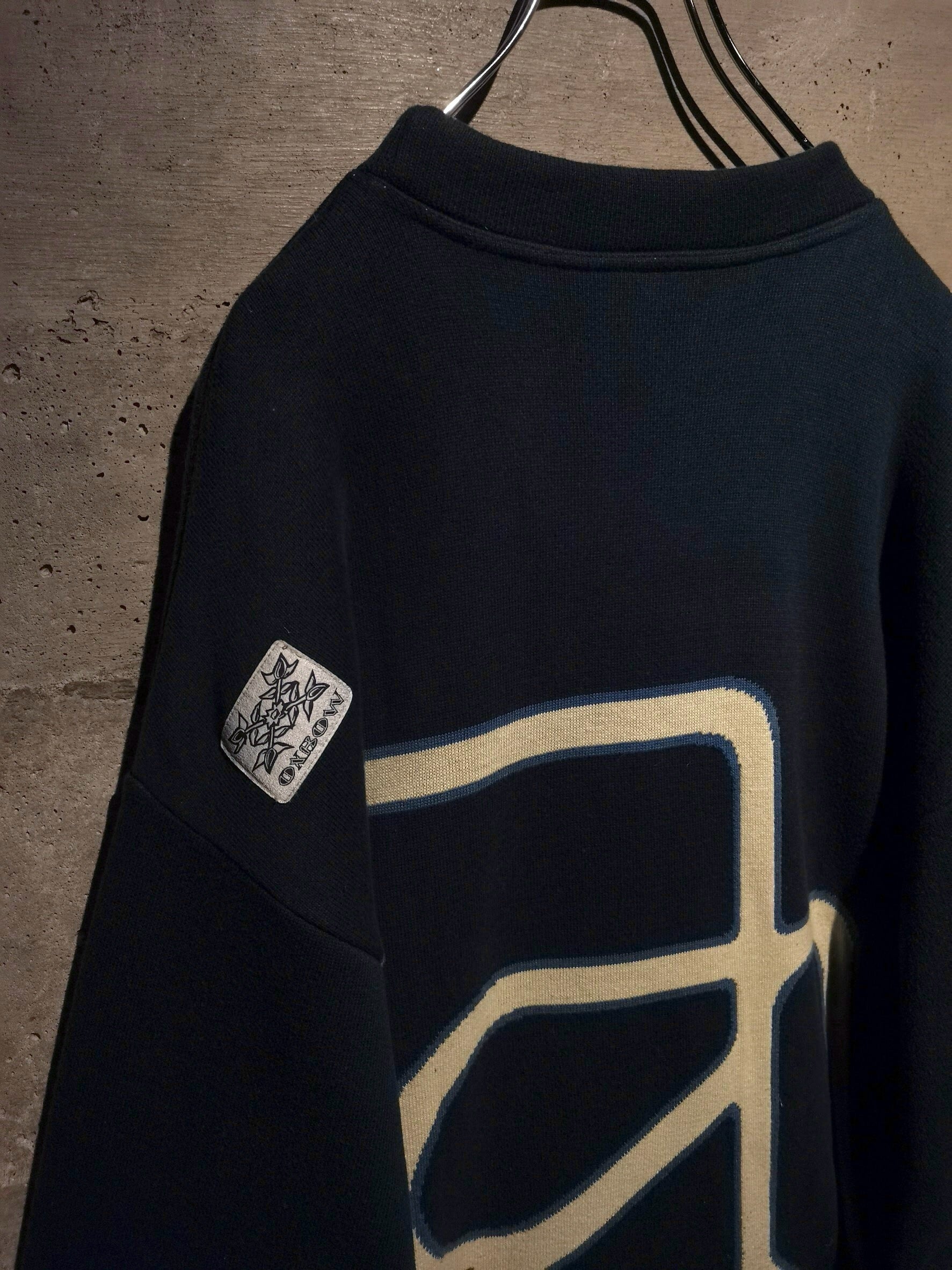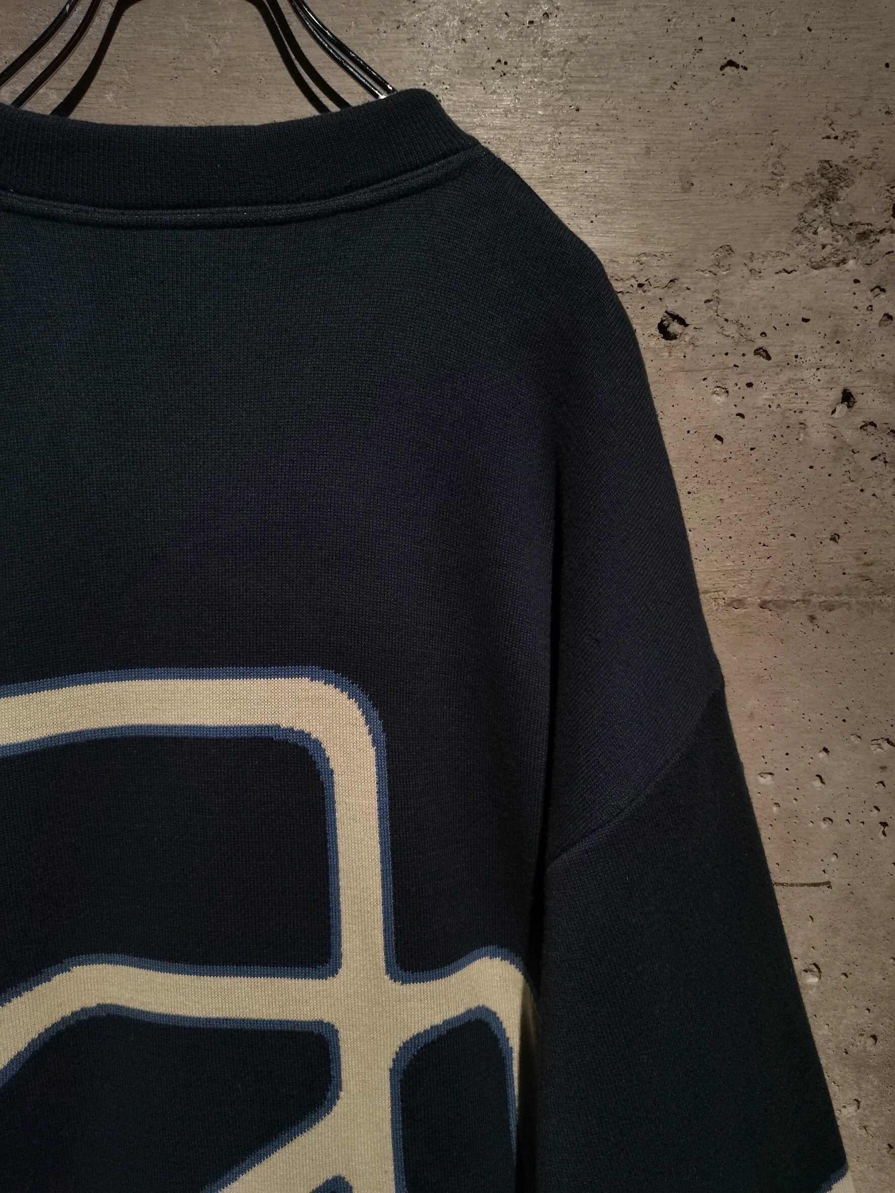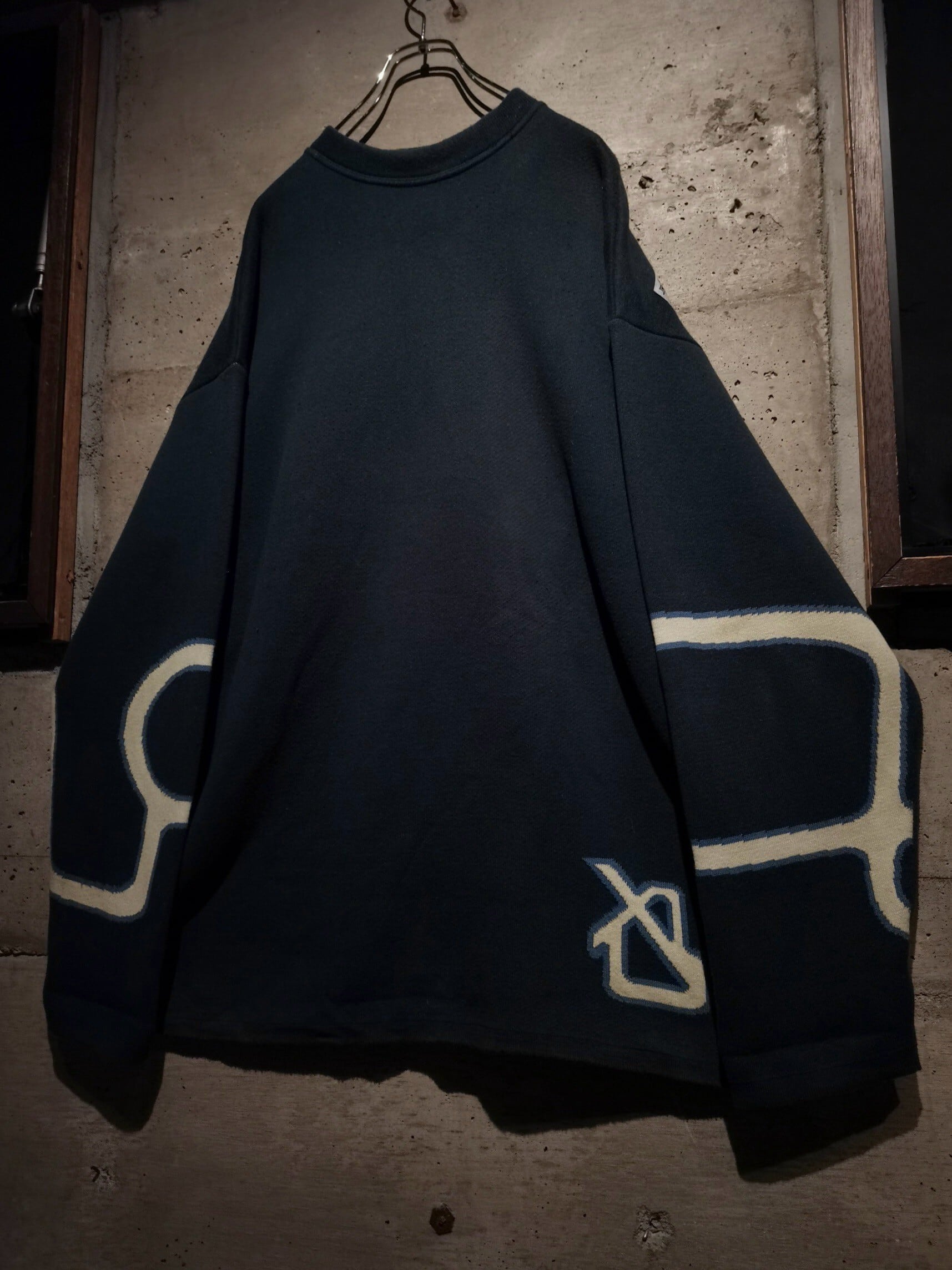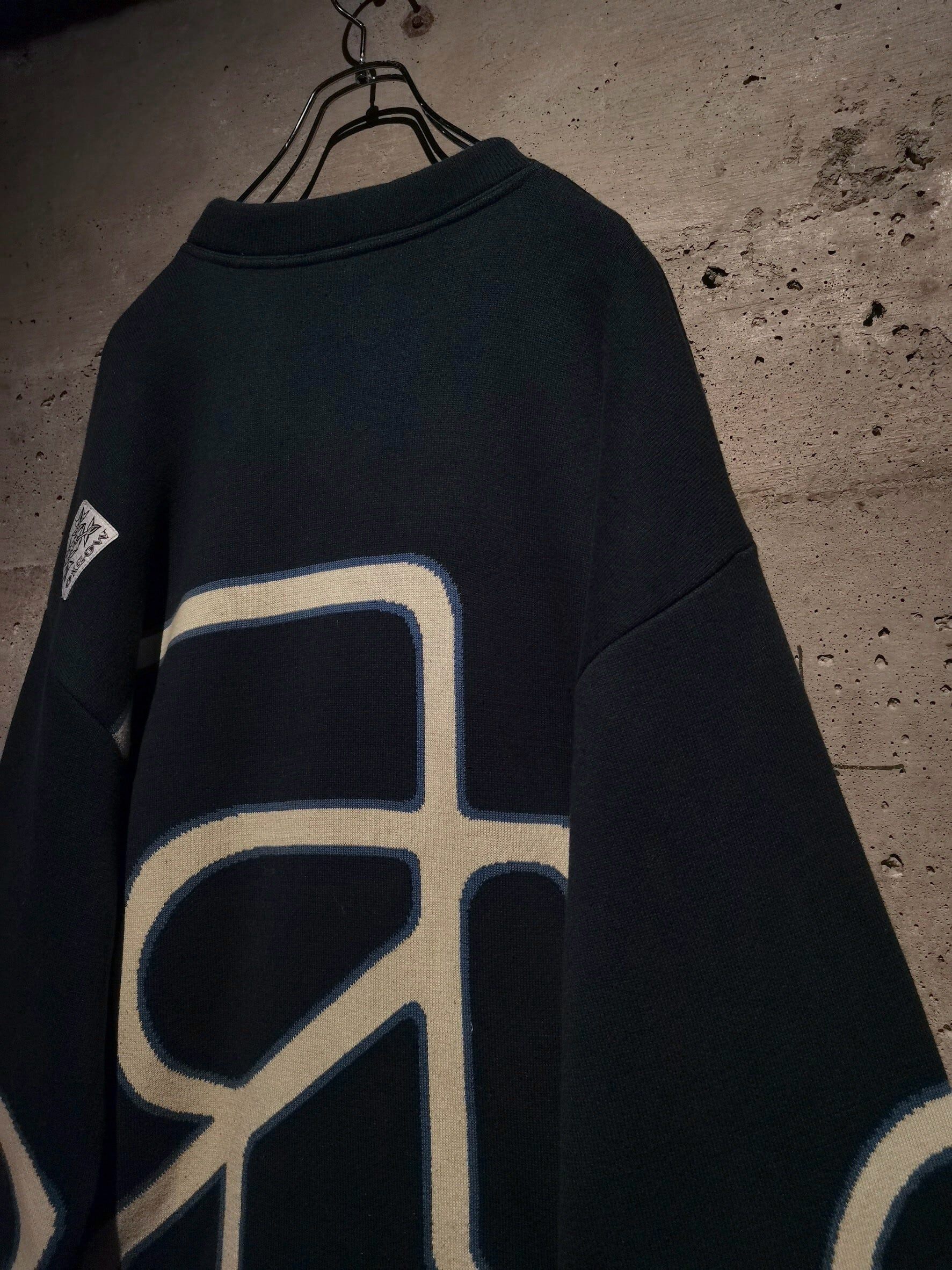 ネイビーのボディをベースに、背面、袖に曲線的なデザインを載せた1着。