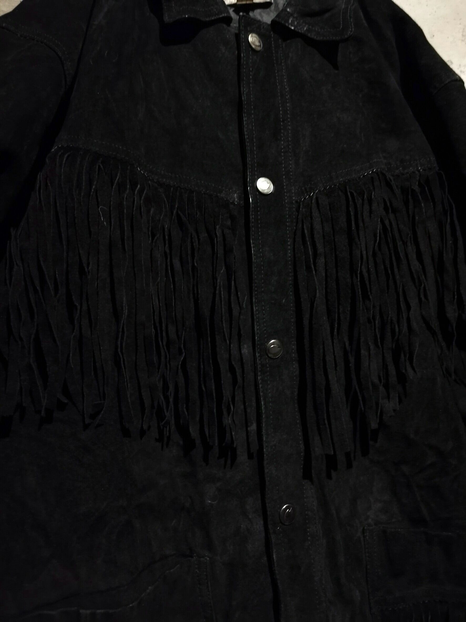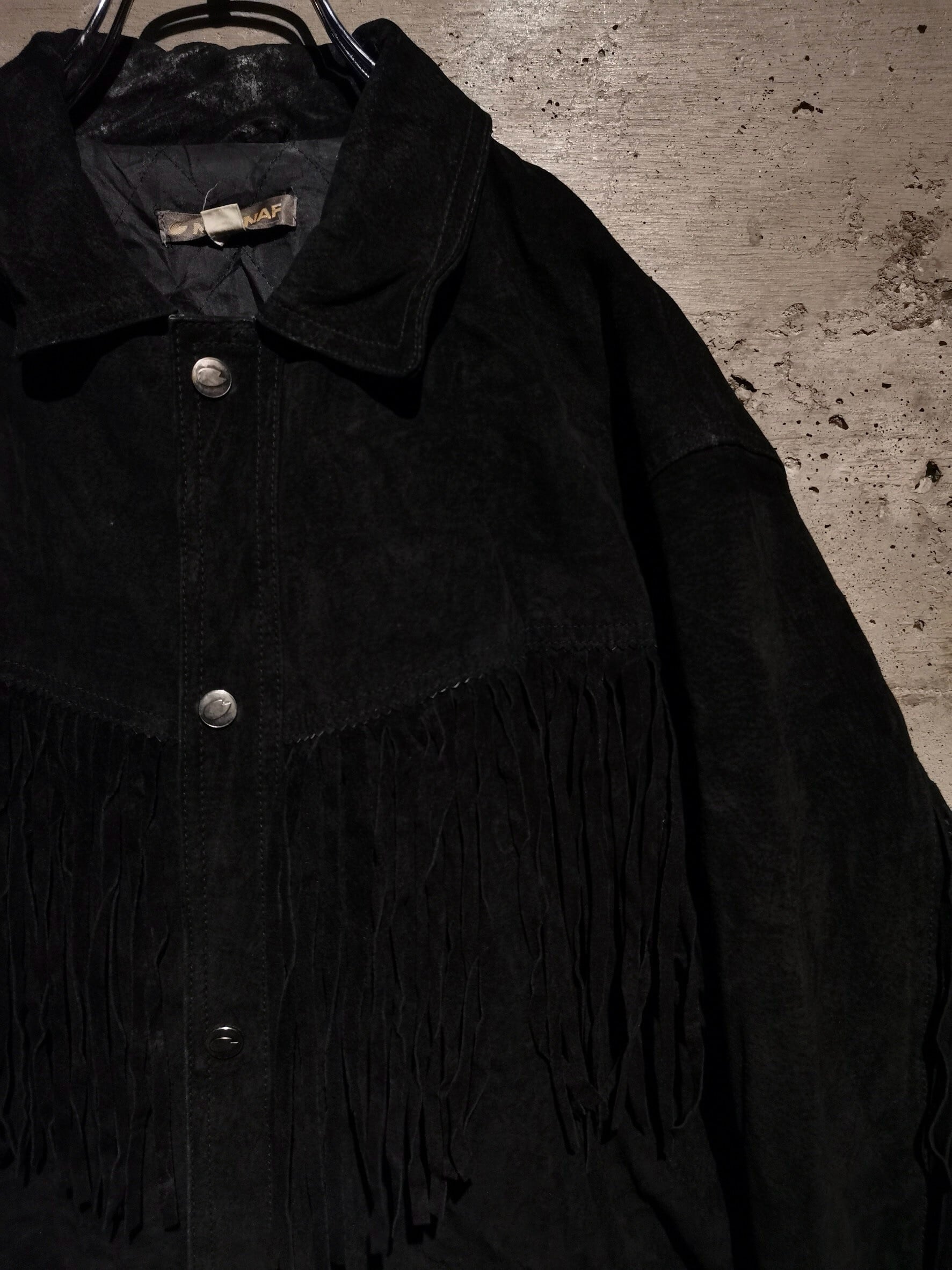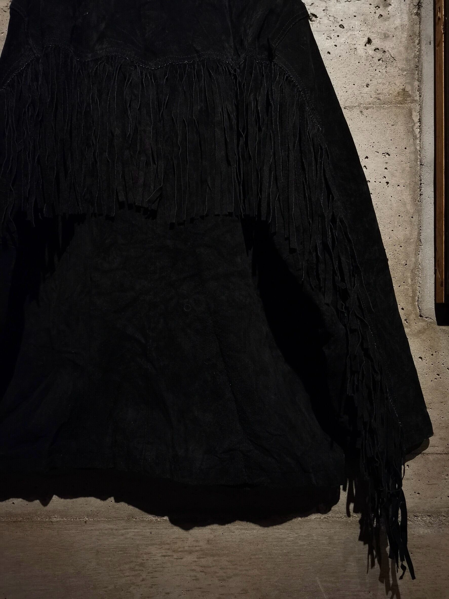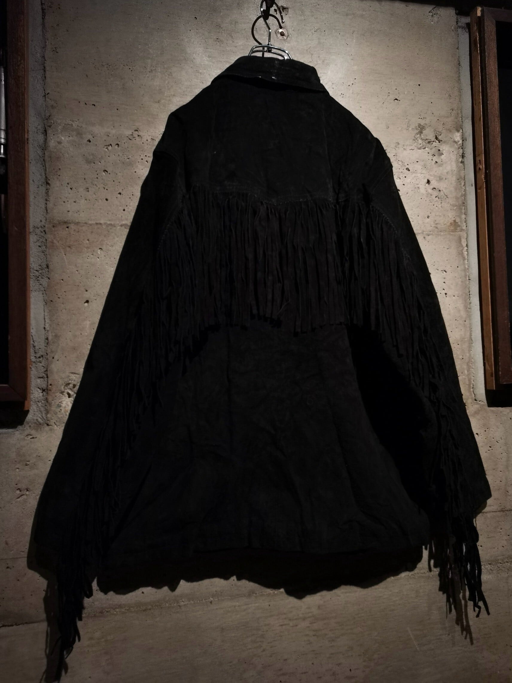 ハリのあるマットな質感のスエードレザーを用い、背面ヨークから袖、フロントヨークと両サイドのパッチポケットにフリンジの装飾を施したスエードレザージャケット。