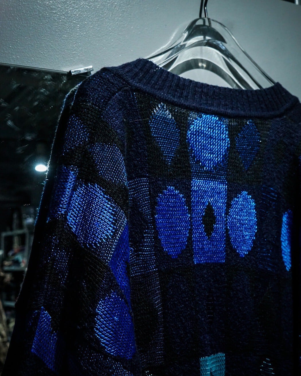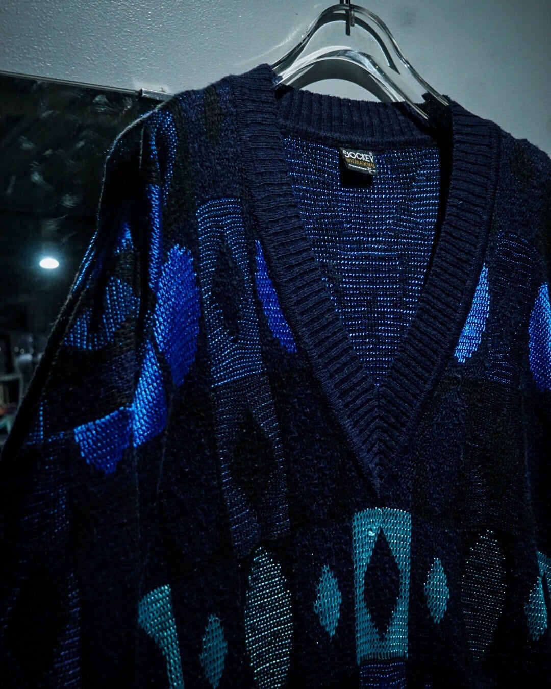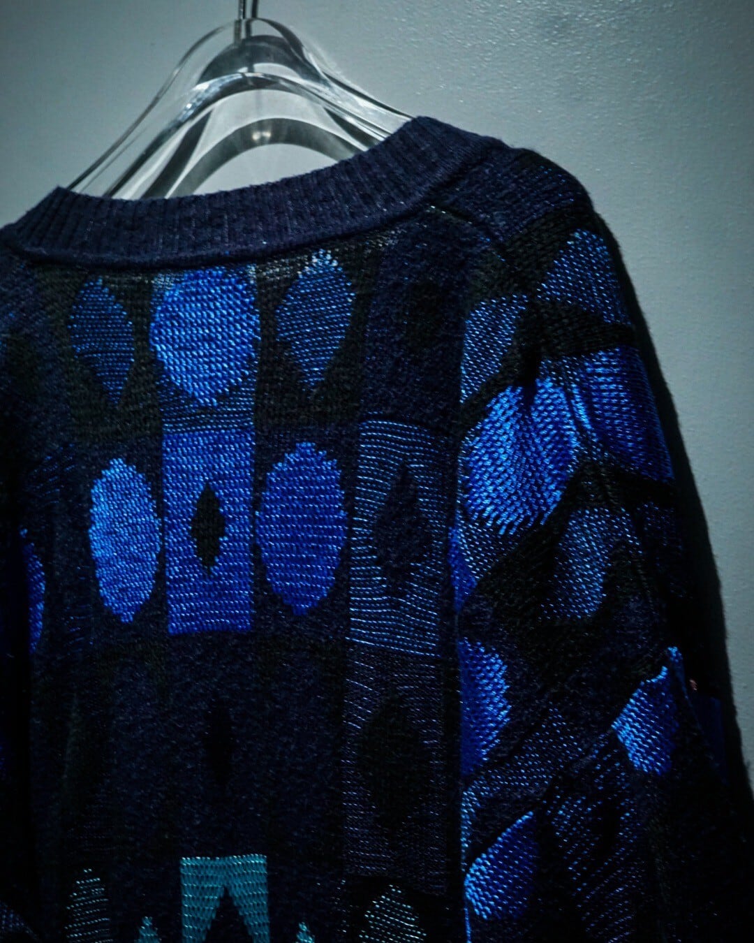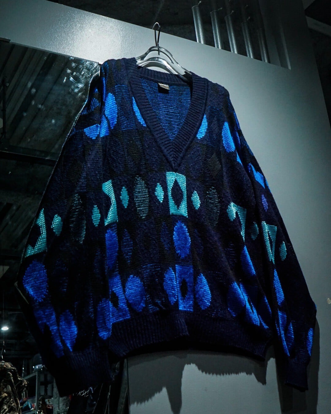 ネイビーのボディをベースに、様々な図形を規則的にデザインに落とし込んだVネックニット。