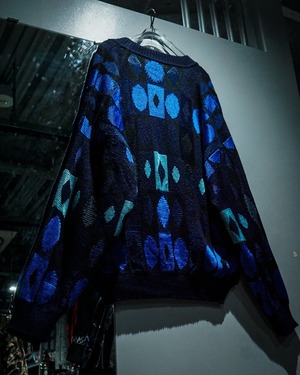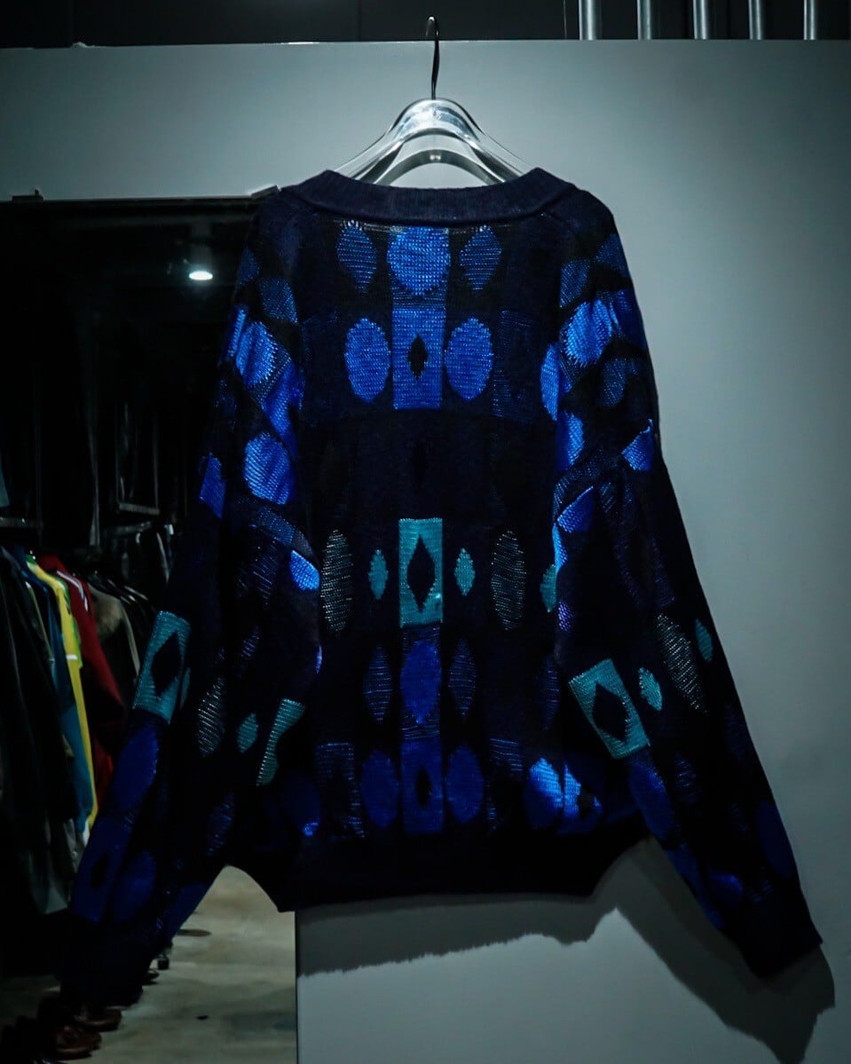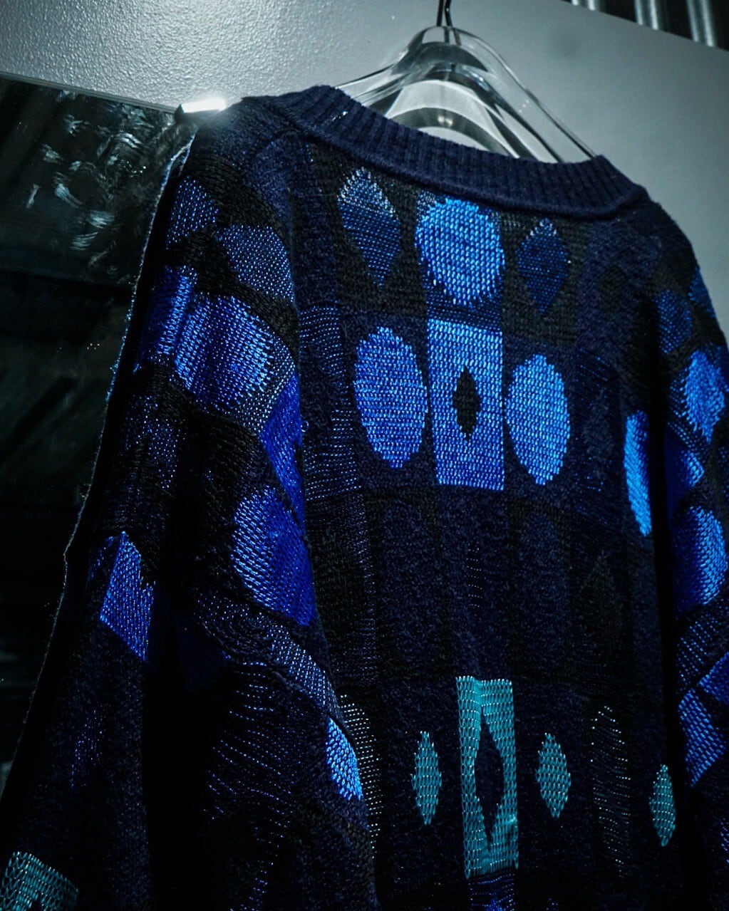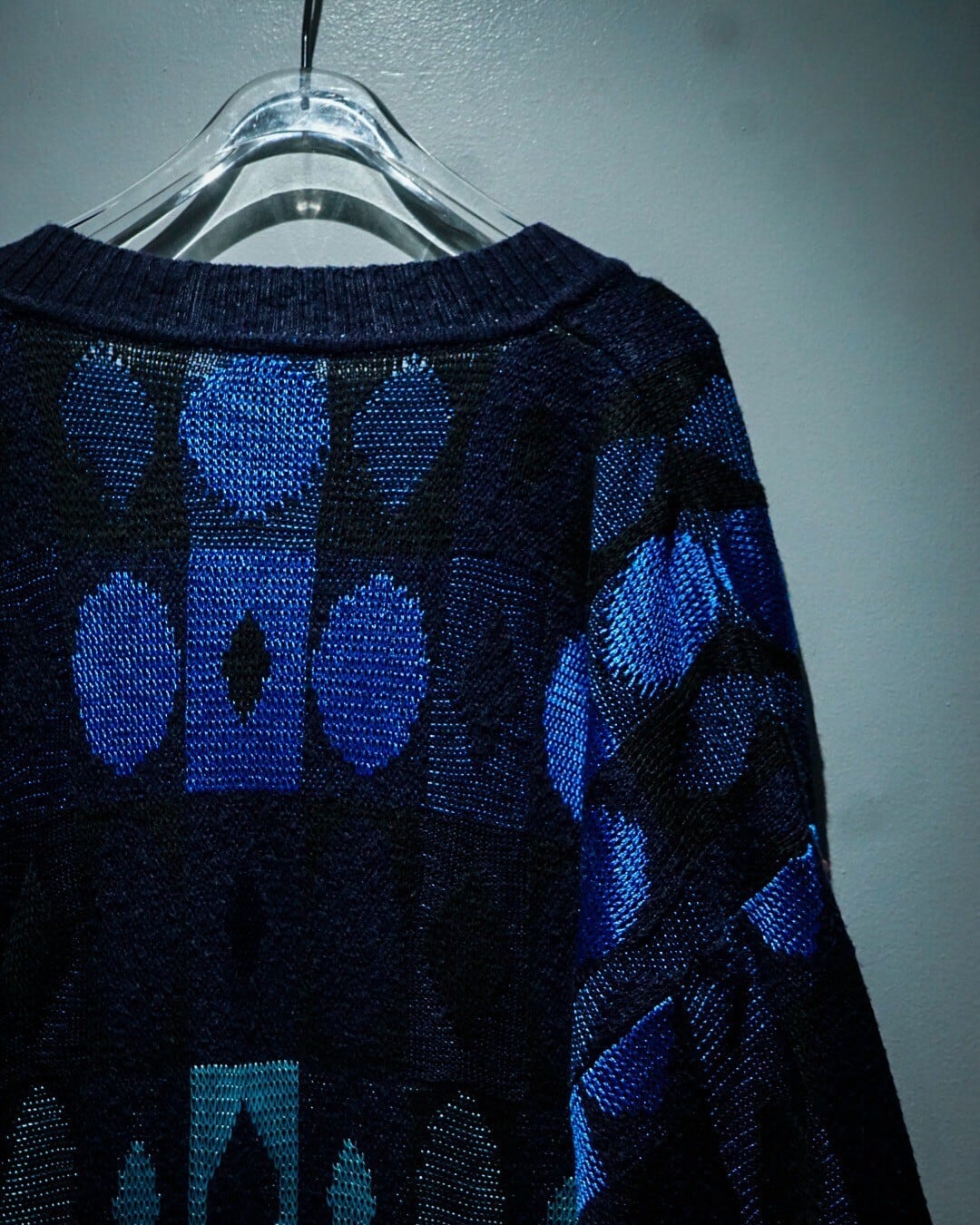 ネイビーのボディをベースに、様々な図形を規則的にデザインに落とし込んだVネックニット。