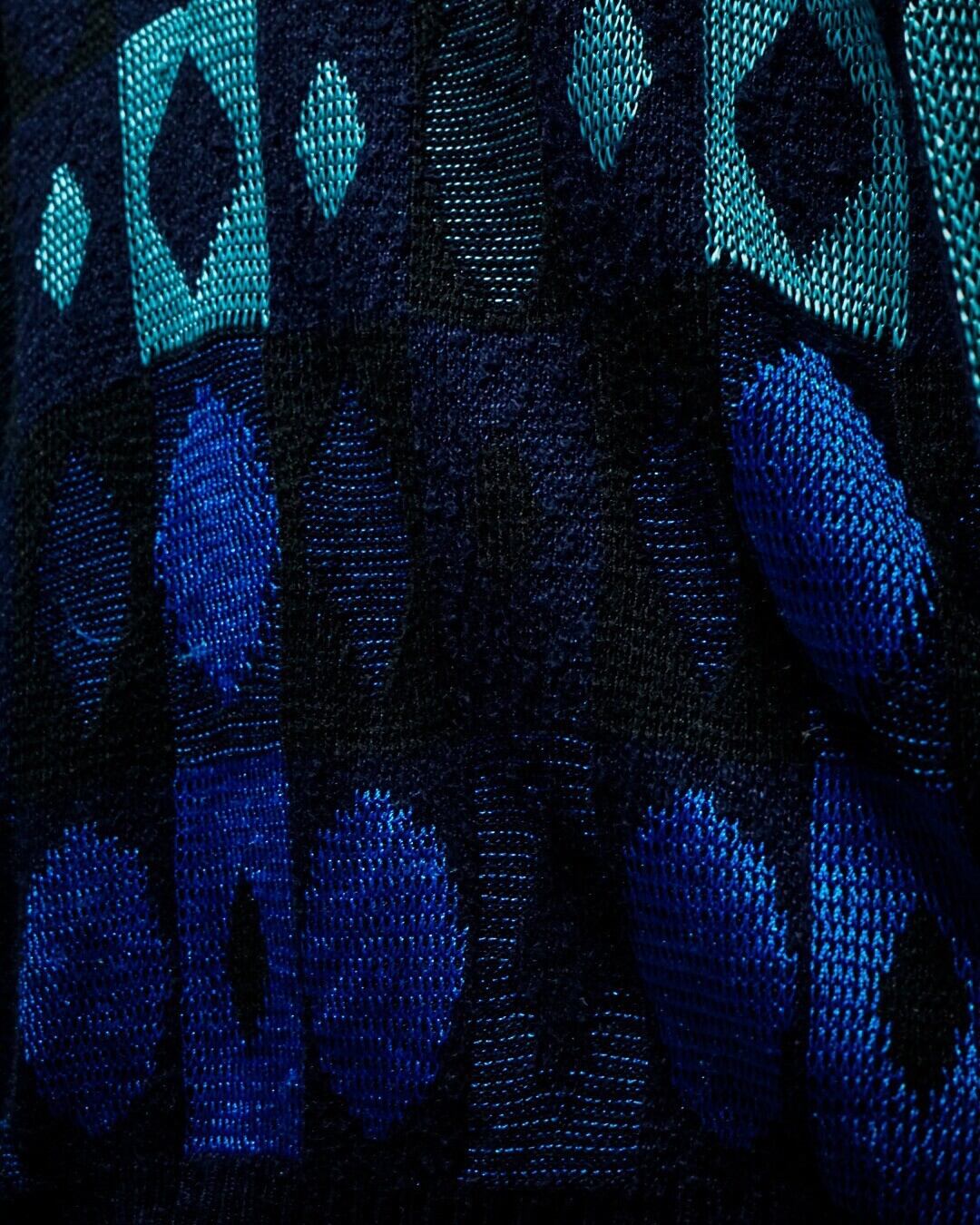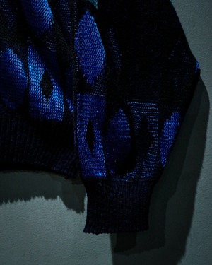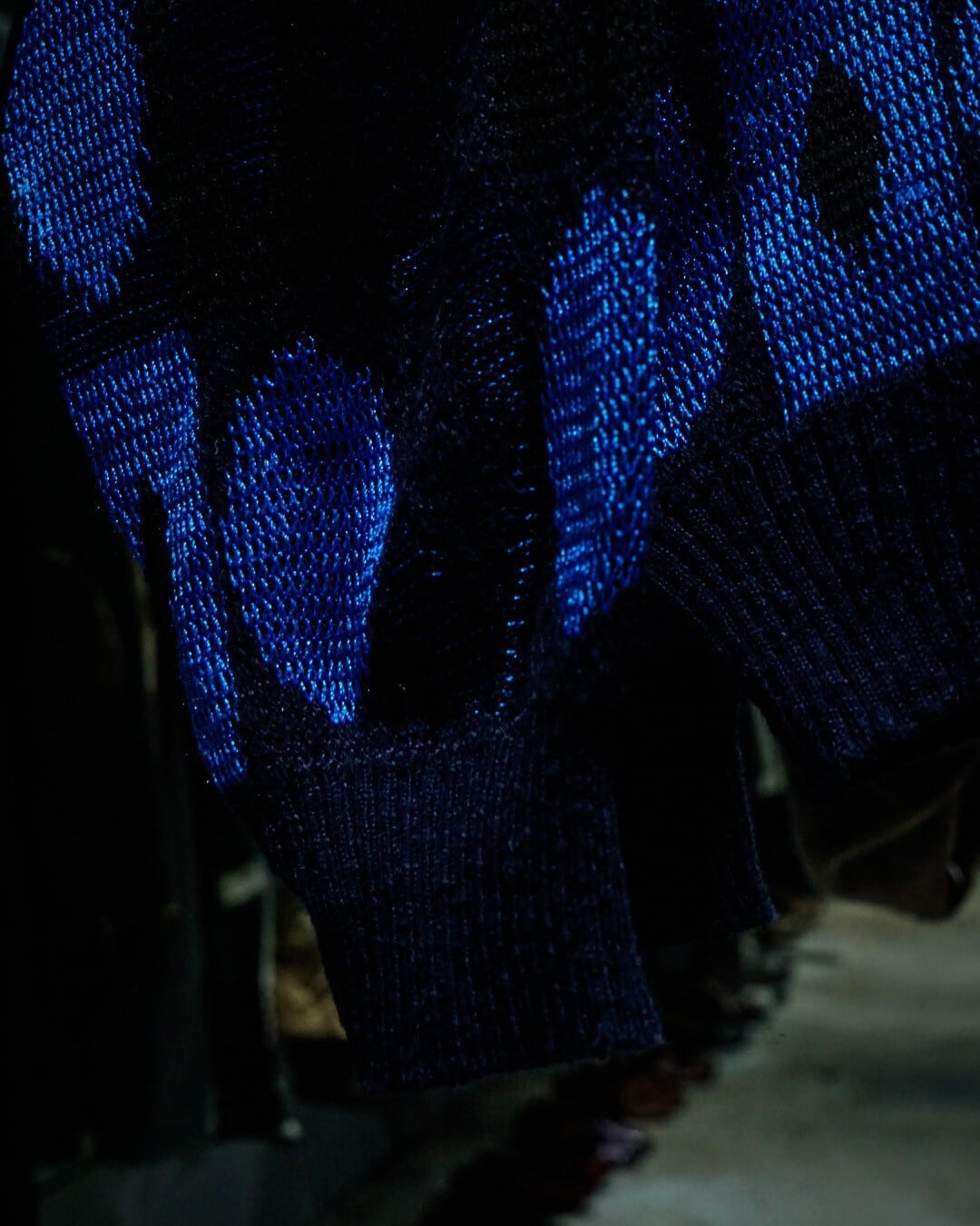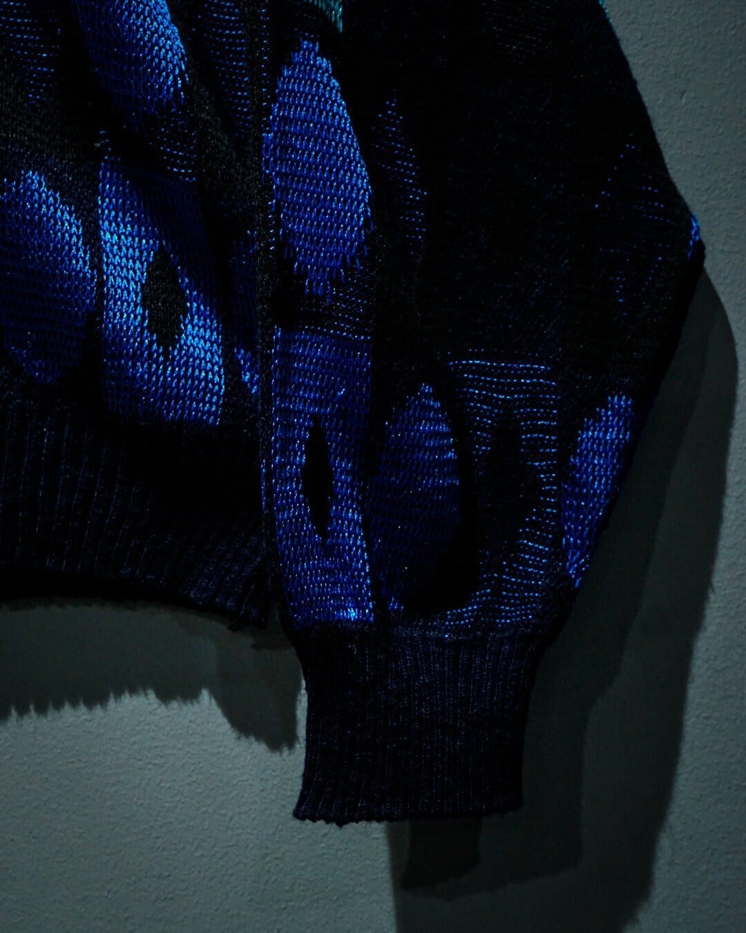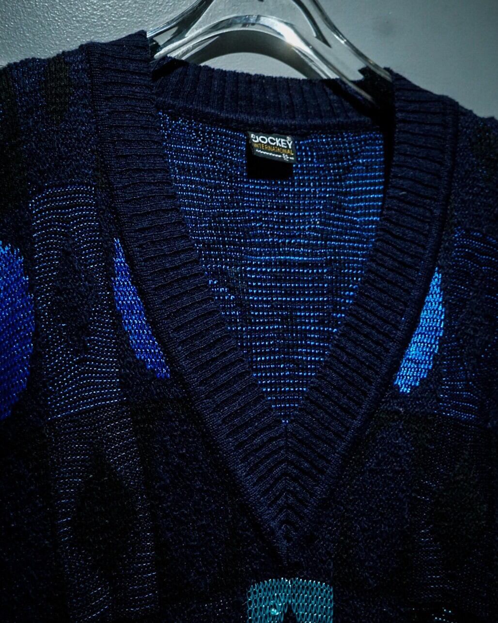 ネイビーのボディをベースに、様々な図形を規則的にデザインに落とし込んだVネックニット。
