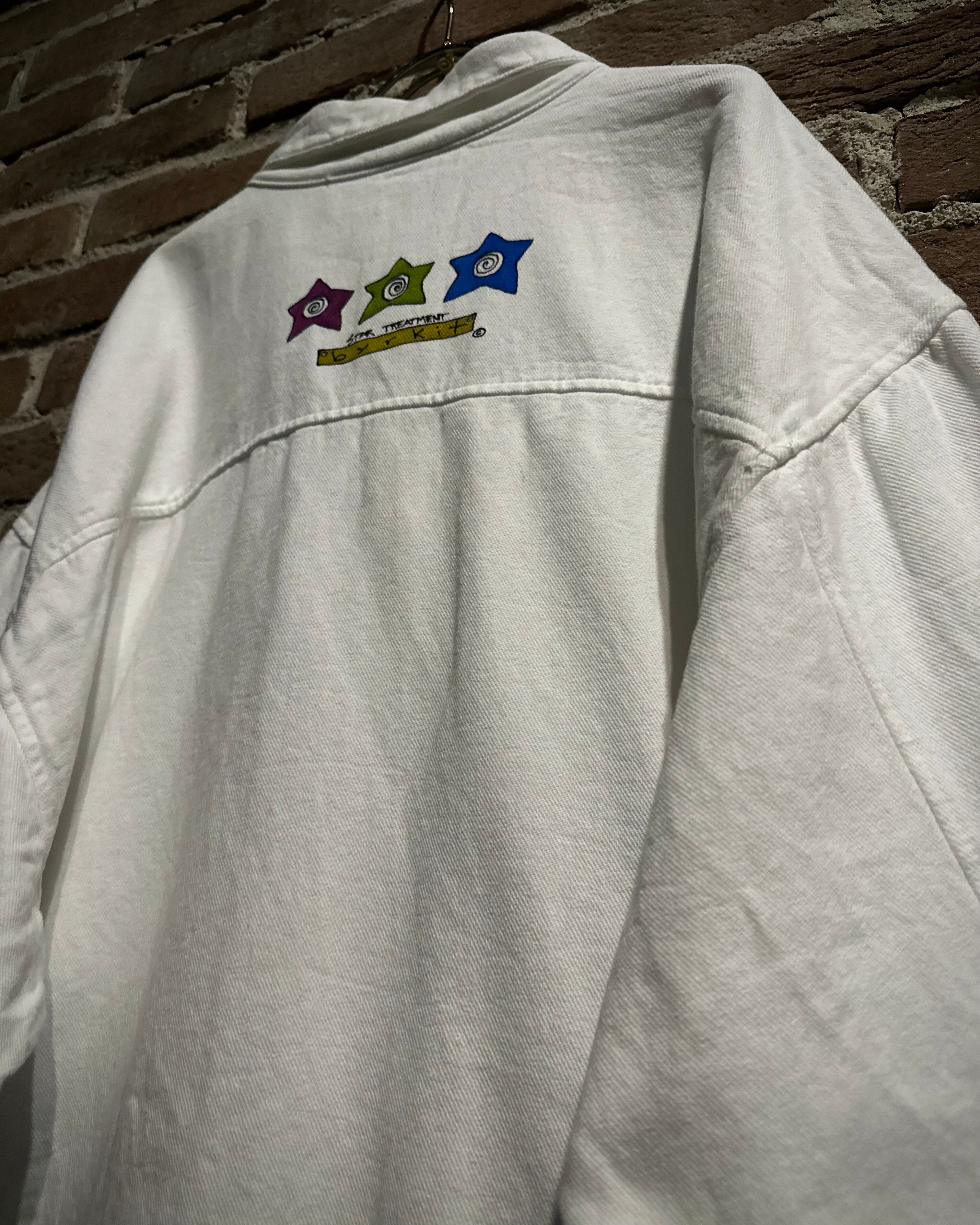 ナチュラルな風合いのコットンを用いたボディに、フロント、バックにマルチカラーの星柄や四角のプリントを施した長袖シャツ。