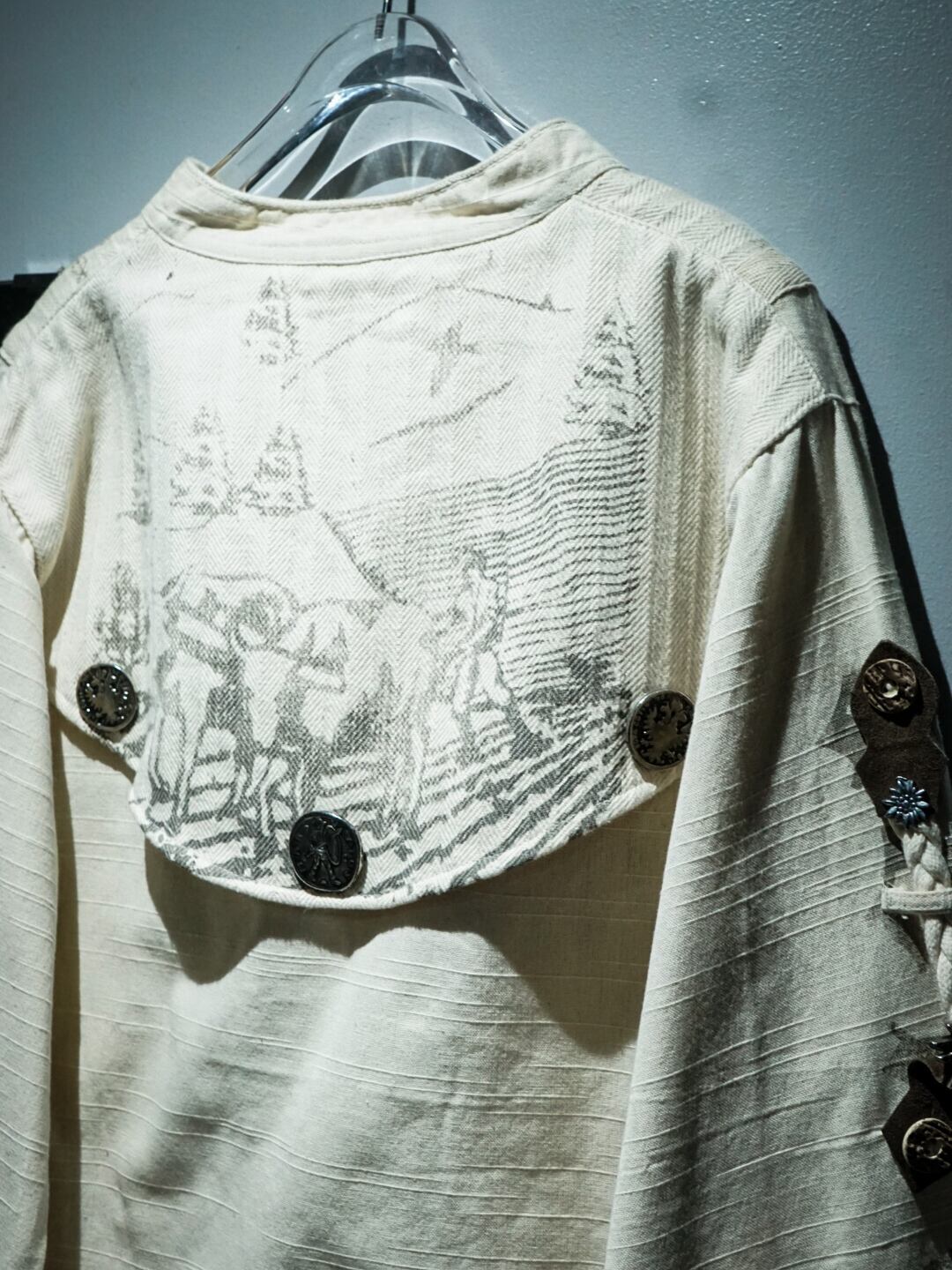 随所にはレタリングやエンブレムデザインのプリントをON。襟周りやアームにはチロリアンのアイテムで見られるメタルボタン、鹿の角を模したボタンの装飾。